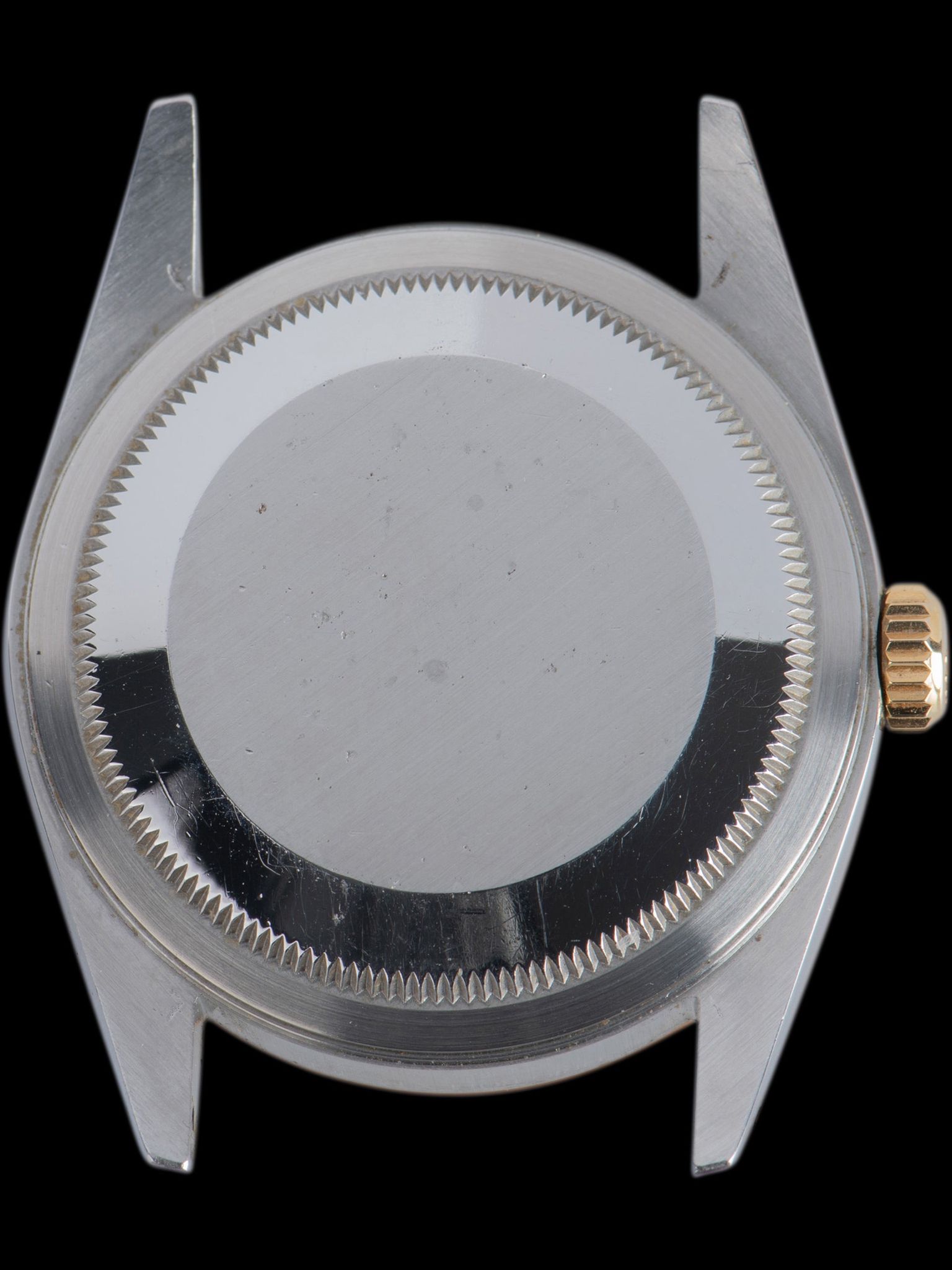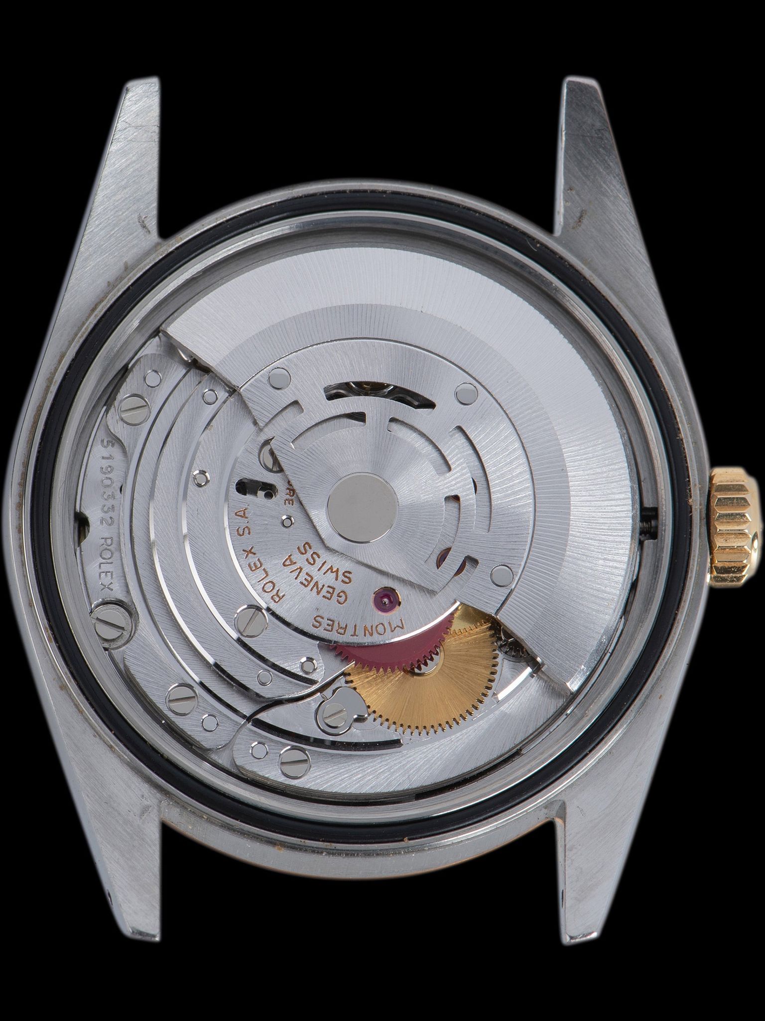 The original sunburst champagne dial is flawless. The tritium lume plots show no patina and exhibit no degradation under UV light inspection. The yellow gold hands are later Rolex Service units with luminova lume and match the aesthetic of the watch perfectly. The metallic gold date wheel is original with open 6's and 9's.