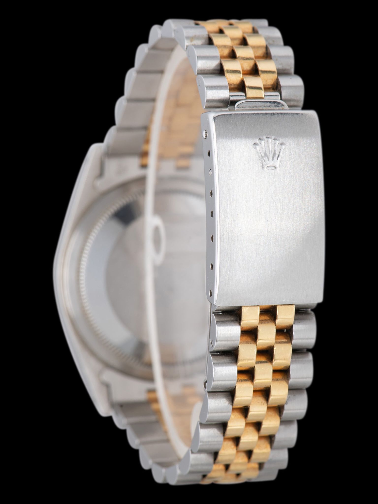 The exceptional case appears to have been gently polished once in its past, as the case retains crisp factory brushing and angles throughout, showing only light signs of use. The 18K yellow gold fluted bezel is also in crisp condition with almost no signs of use present. The original Rolex 62523 H18 two-tone Jubilee bracelet with 455B end pieces retains 22 links that show minimal stretch and will fit up to an 8-inch wrist.