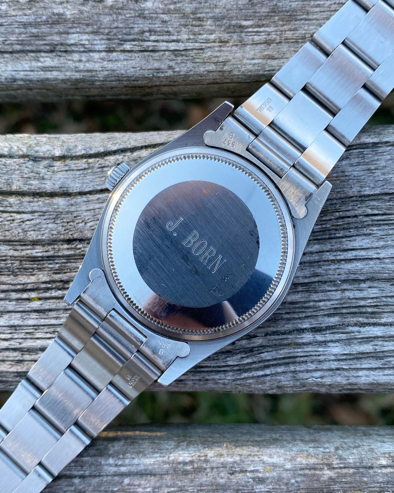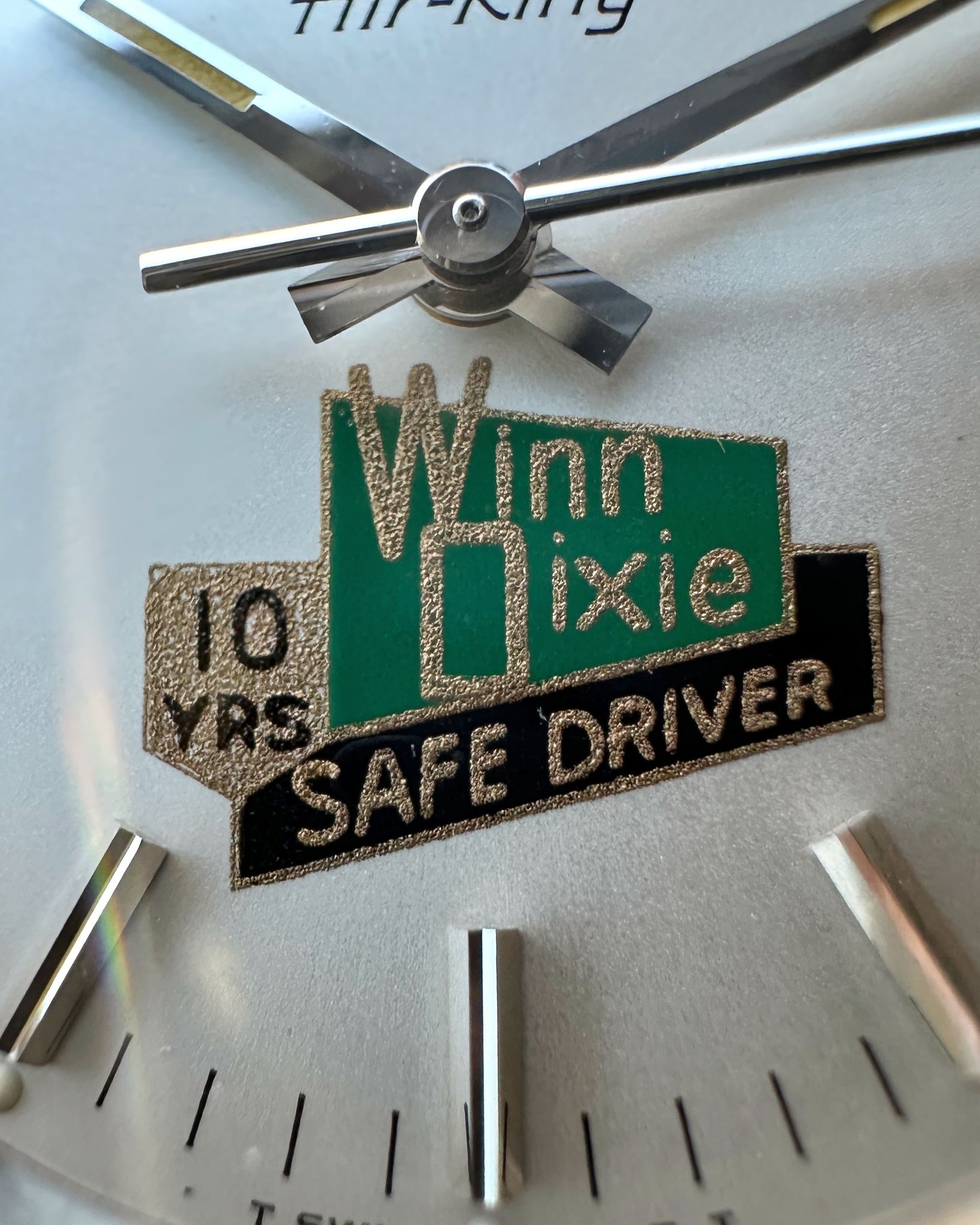 The Air-King features a rare transitional “Winn-Dixie 10 Years Safe Driver” factory logo dial with applied polished white gold index hour markers and polished white gold tritium coated hands. These watches were awarded to Winn Dixie employees who drove for a decade without any incidents while behind the wheel. The back of the case is engraved with the first initial and last name of the lucky employee who was awarded the watch from Winn-Dixie. The movement used in the 14000 is the Rolex Caliber 3000, which features approximately 42 hours of power reserve, and is running flawlessly.