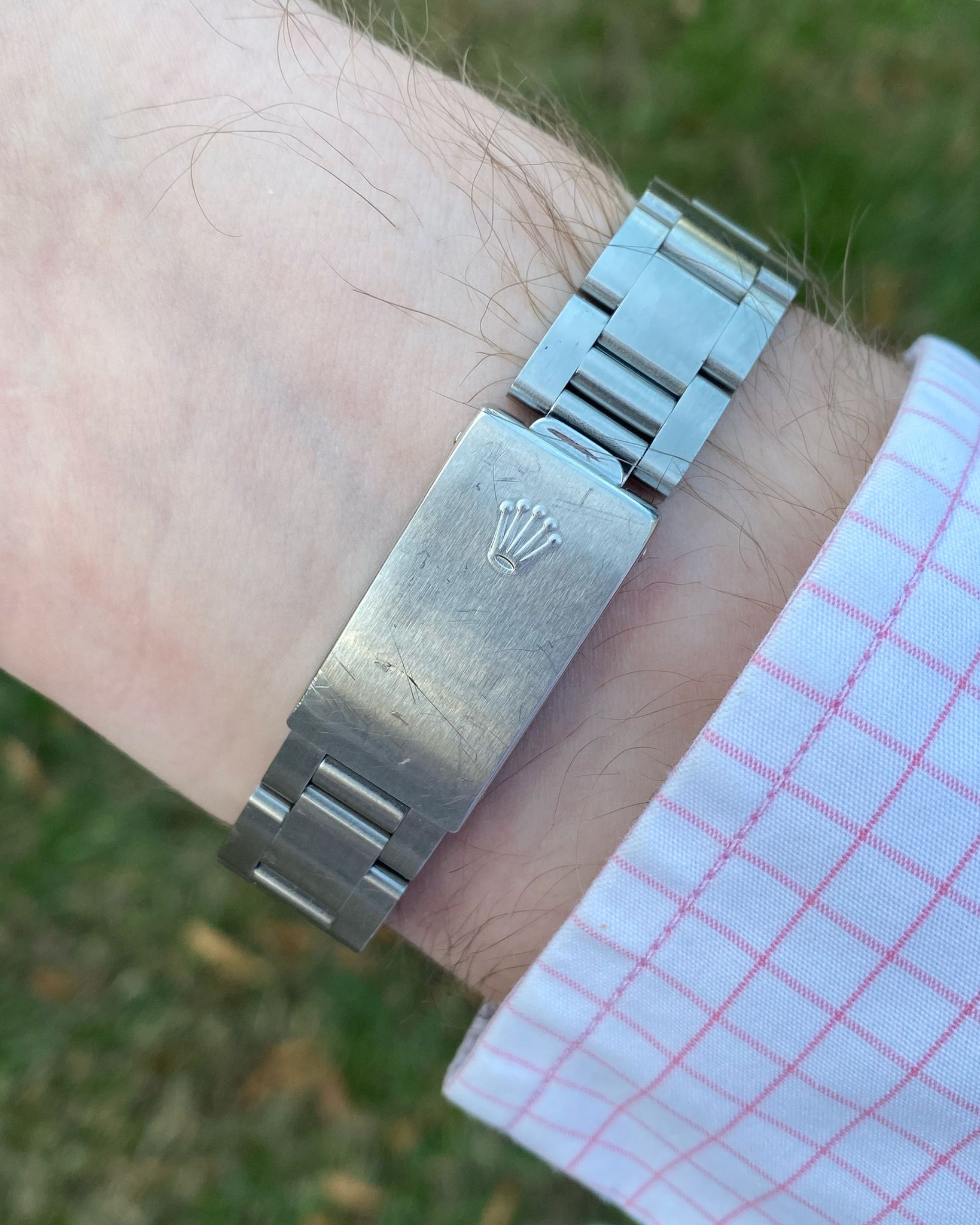 The Rolex features a brushed steel case, which is accented by a smooth polished steel bezel. The Air-King is mounted on its original 78350 brushed steel Oyster bracelet whose clasp is stamped with an “O1” clasp code, which corresponds with a production date of January, 1990. The 78350 Oyster bracelet is fully linked, containing 13 full-size links, and sits loose on a 7.5 inch wrist.