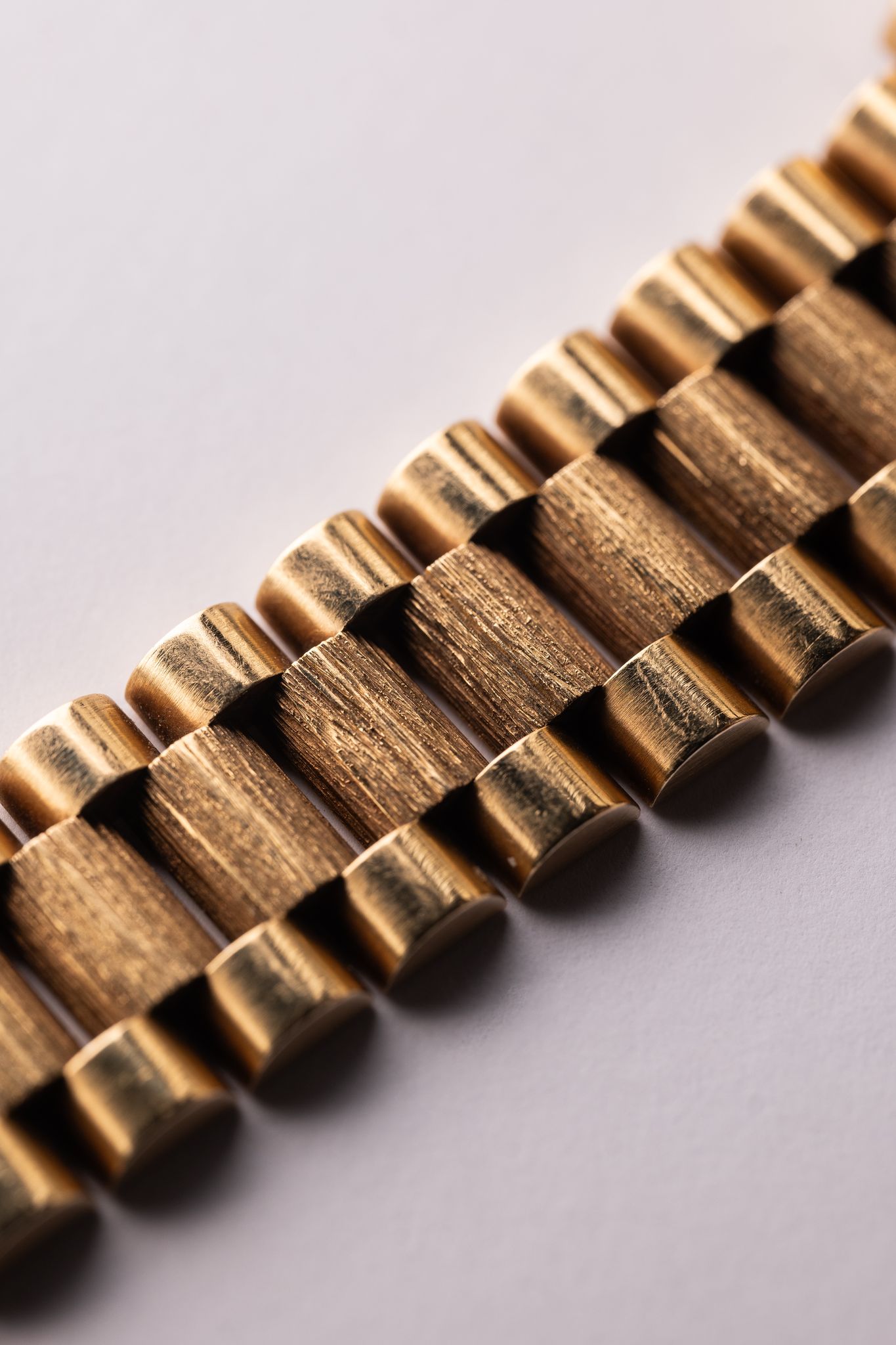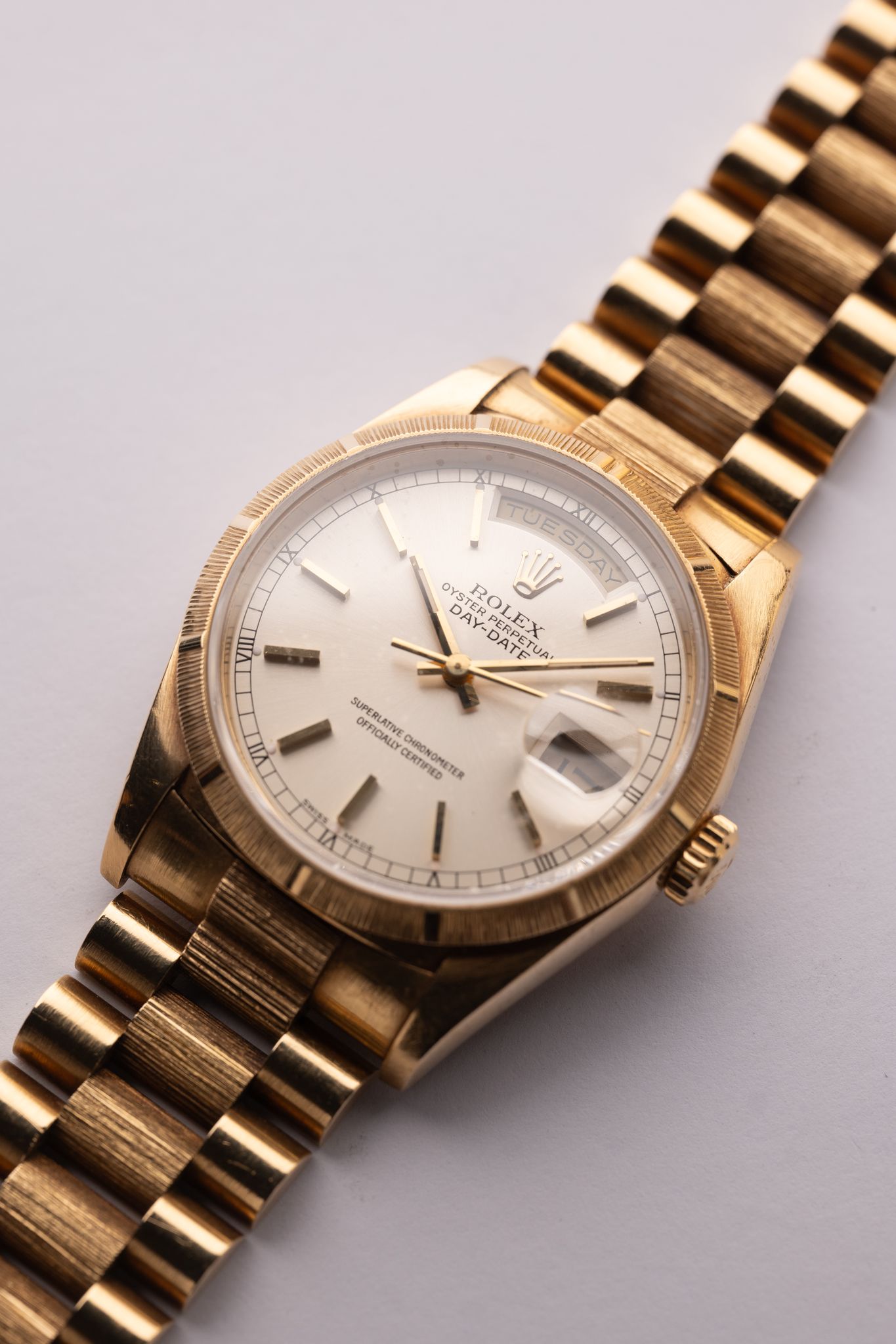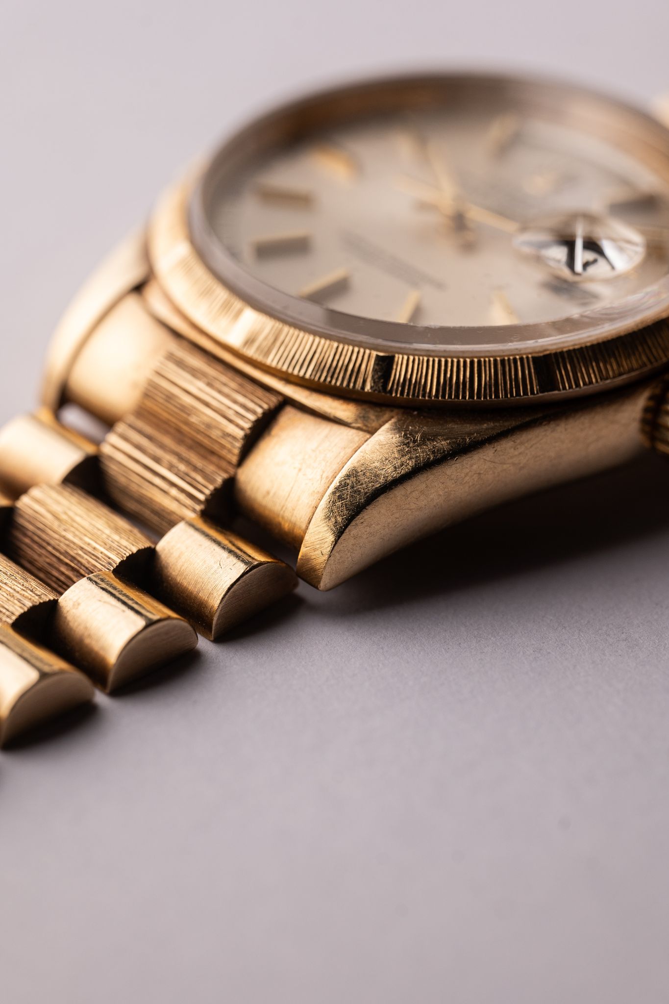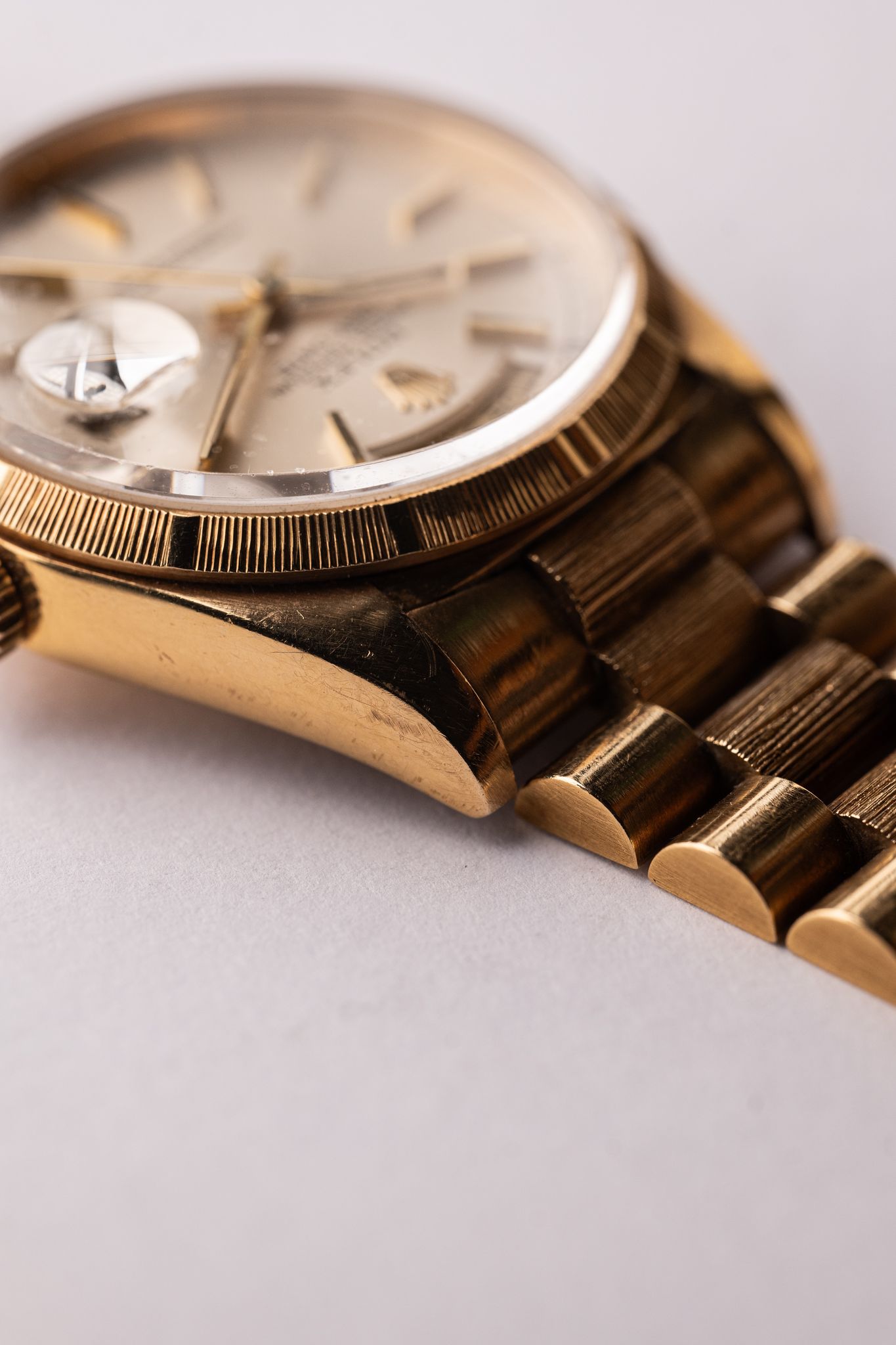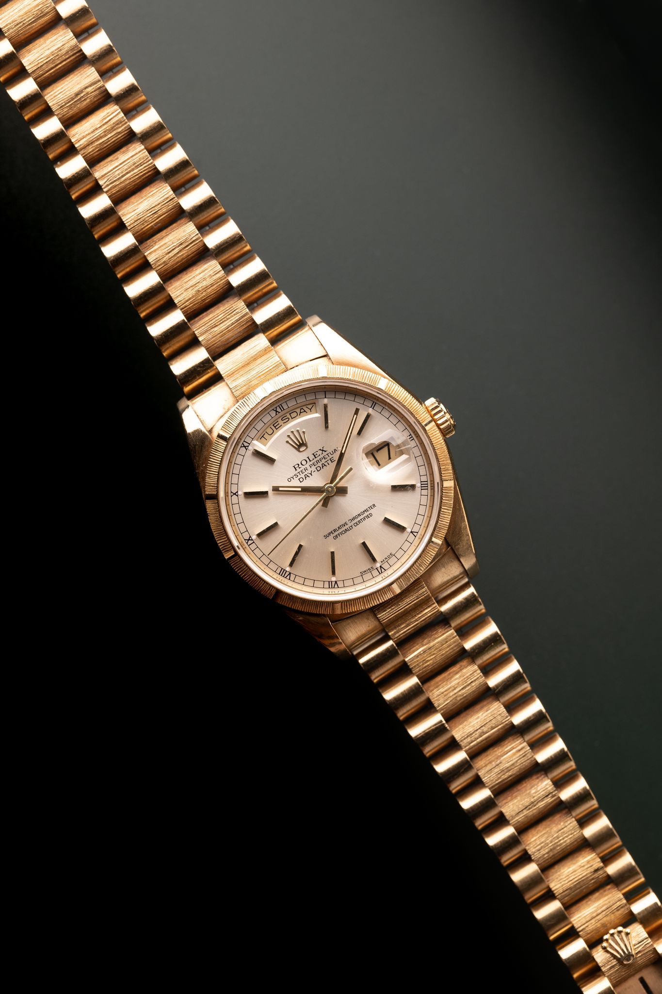Description: An excellent unpolished neo-vintage day-date with a rare matching bark finish bracelet and engine turned gold bezel . This watch is bold and unapologetic. These were each hand finished from the Rolex factory and features such a unique finish from the Rolex craftsmen.