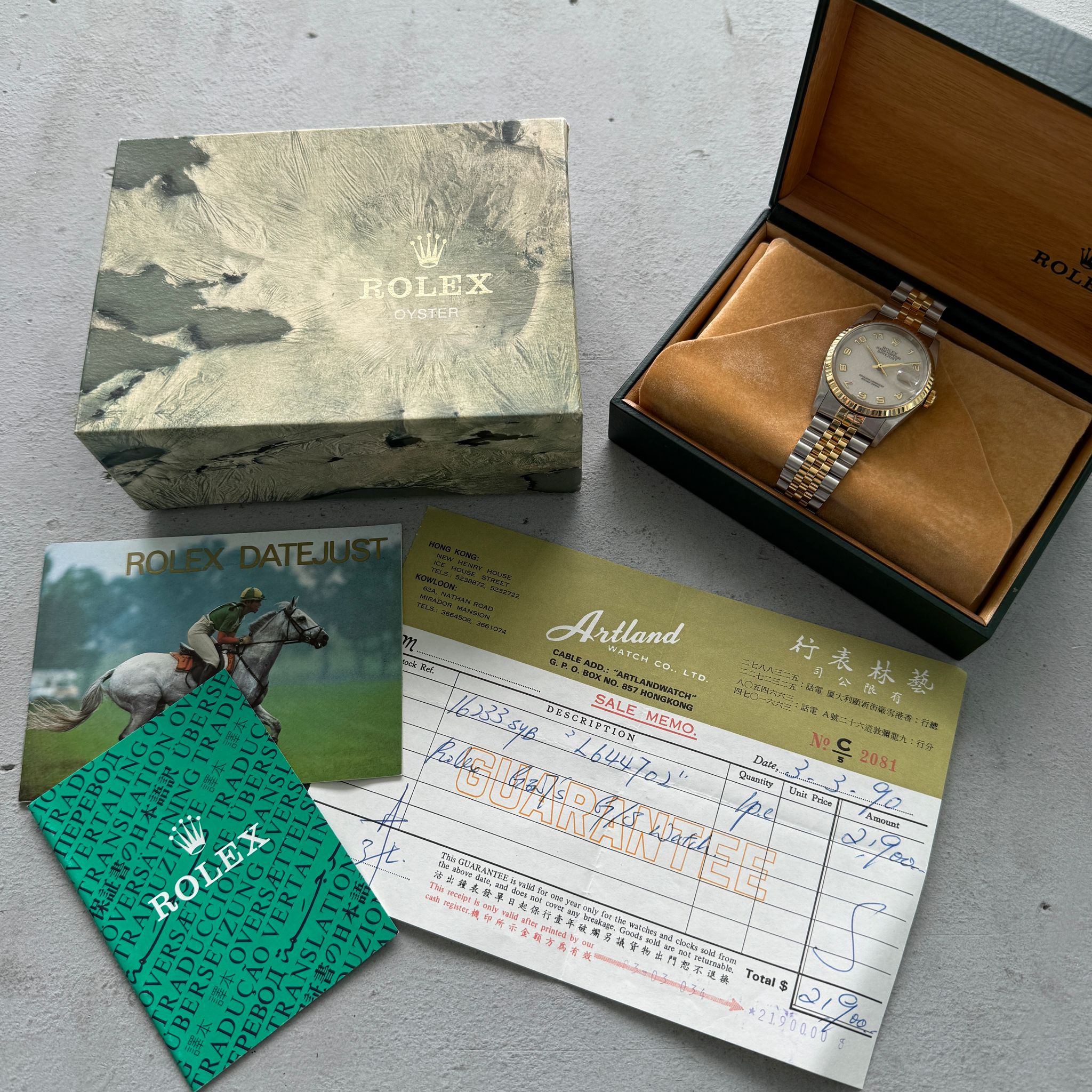 • Accessories: This watch with everything seen in the photos, including original box (with correct 16233 sticker) booklets and original warranty papers dated 1990