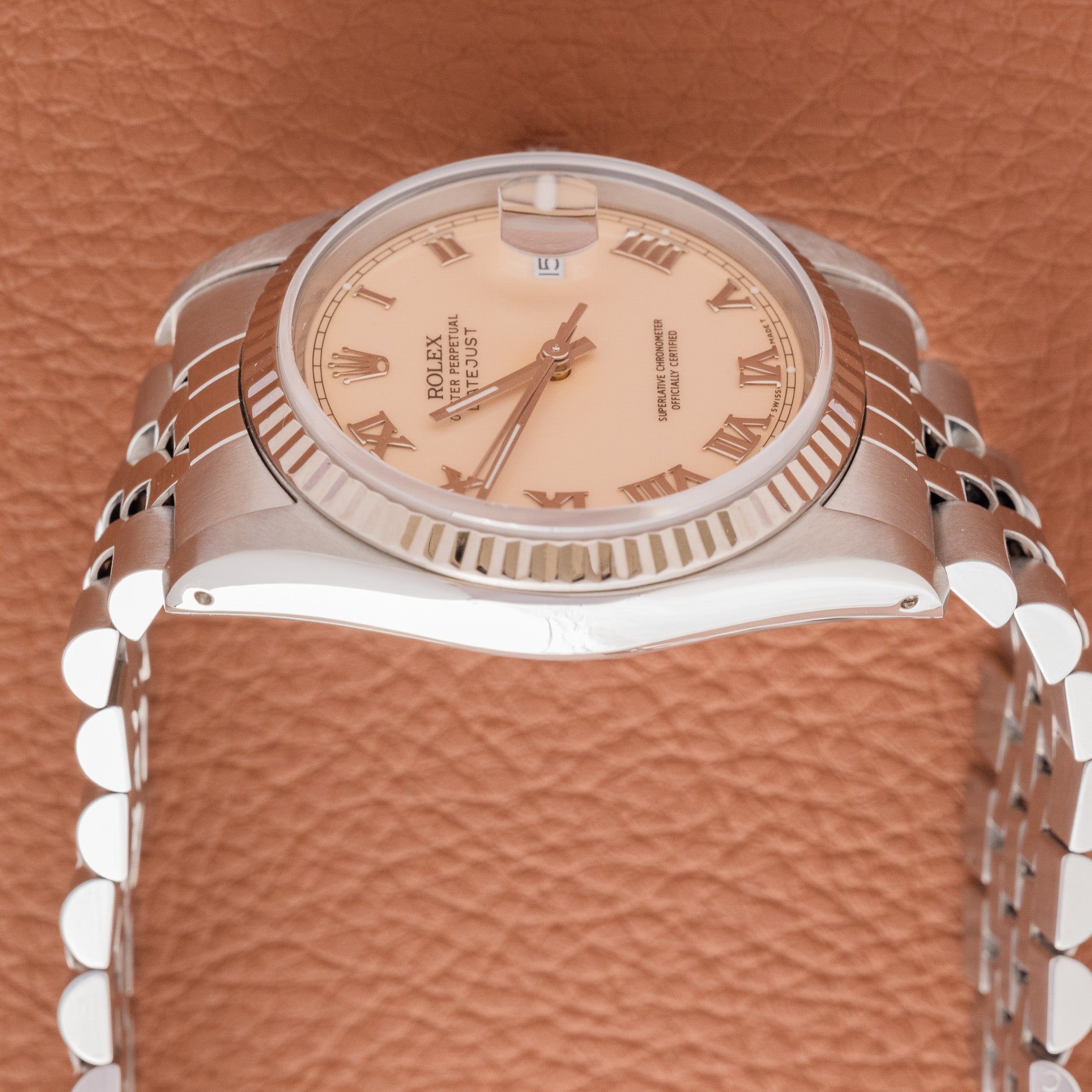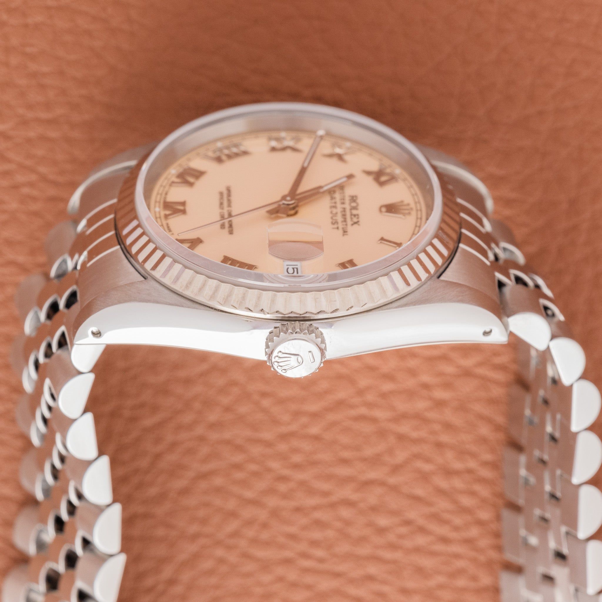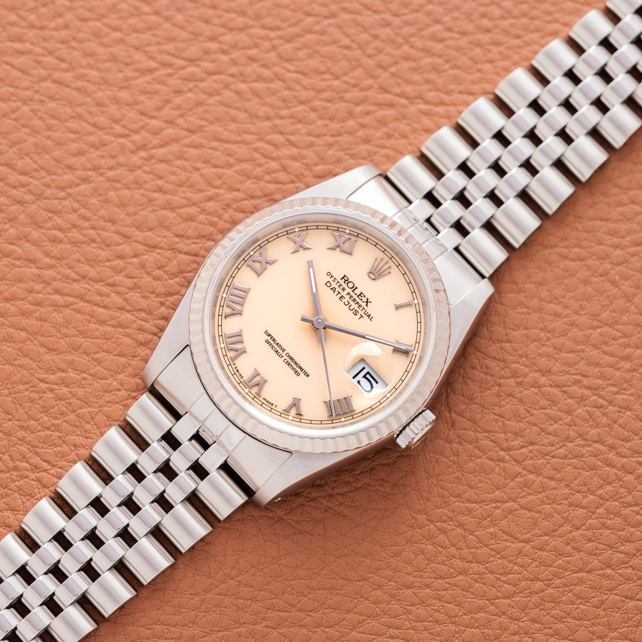 Sometimes little things excite you even when they come from such a standard reference. The 16234 is a fantastic watch; a classic 36mm datejust, but this one is leagues above the majority. A phenomenal ivory Roman dial that has slowly turned into this creamy peach color. The patina is even and perfect, matching the condition of the watch, which is perfection.