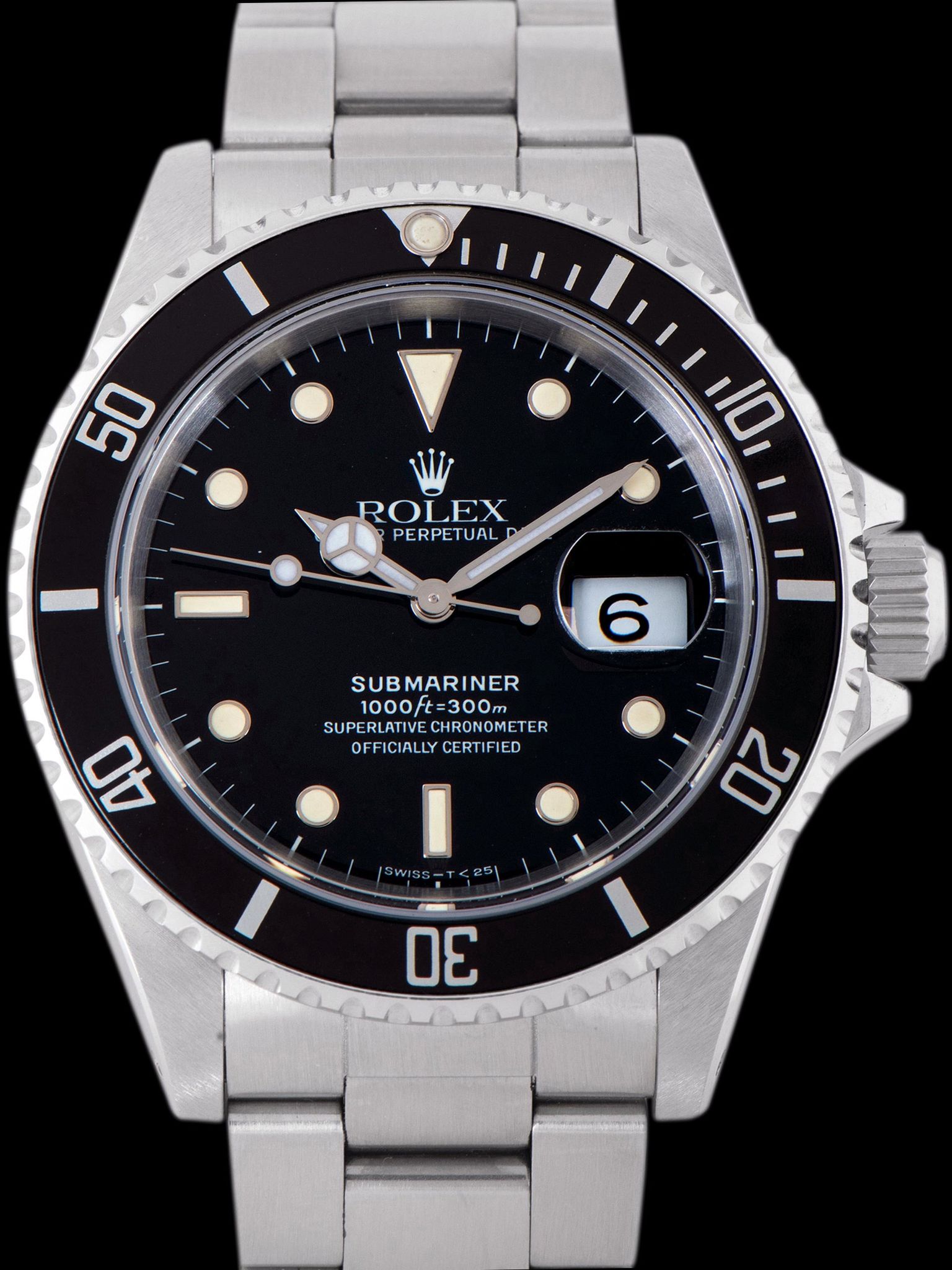 The original glossy black dial is flawless, showing no damage or age. The tritium lume plots have achieved a handsome creamy patina and exhibit no degradation under UV light inspection. The hands are OEM Rolex luminova service units and are in perfect condition.