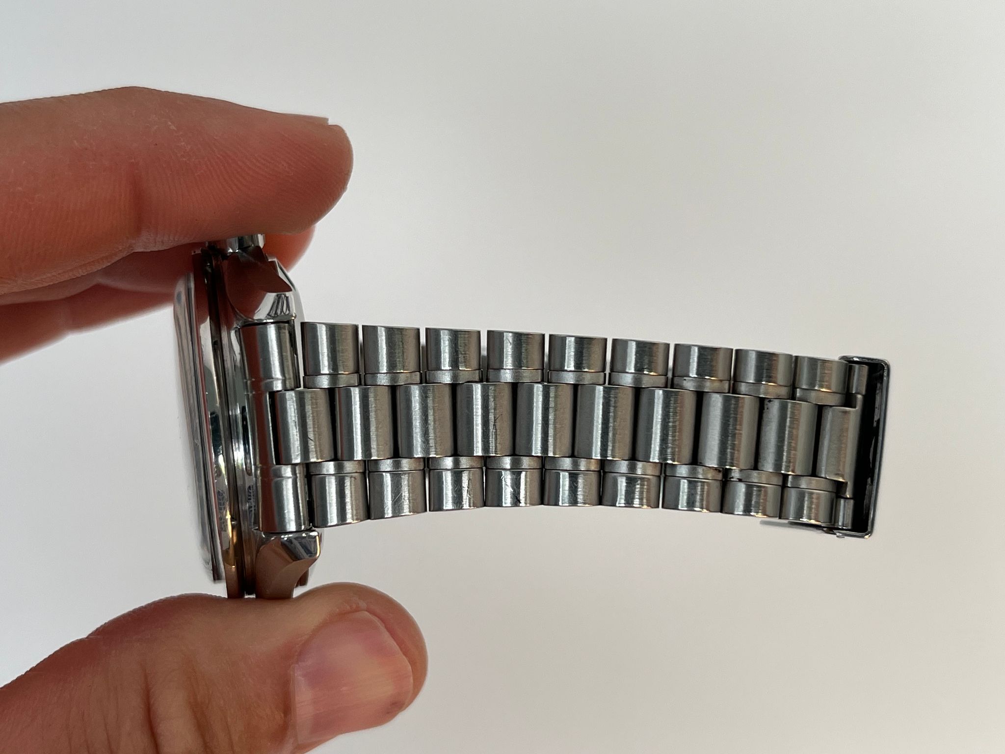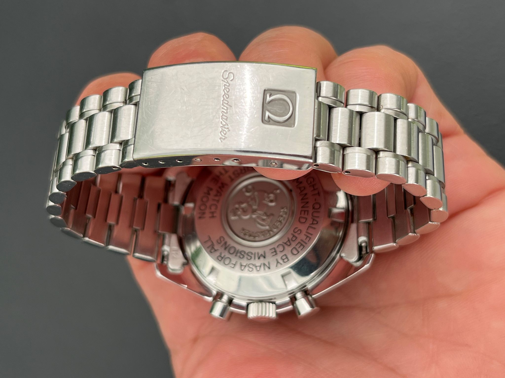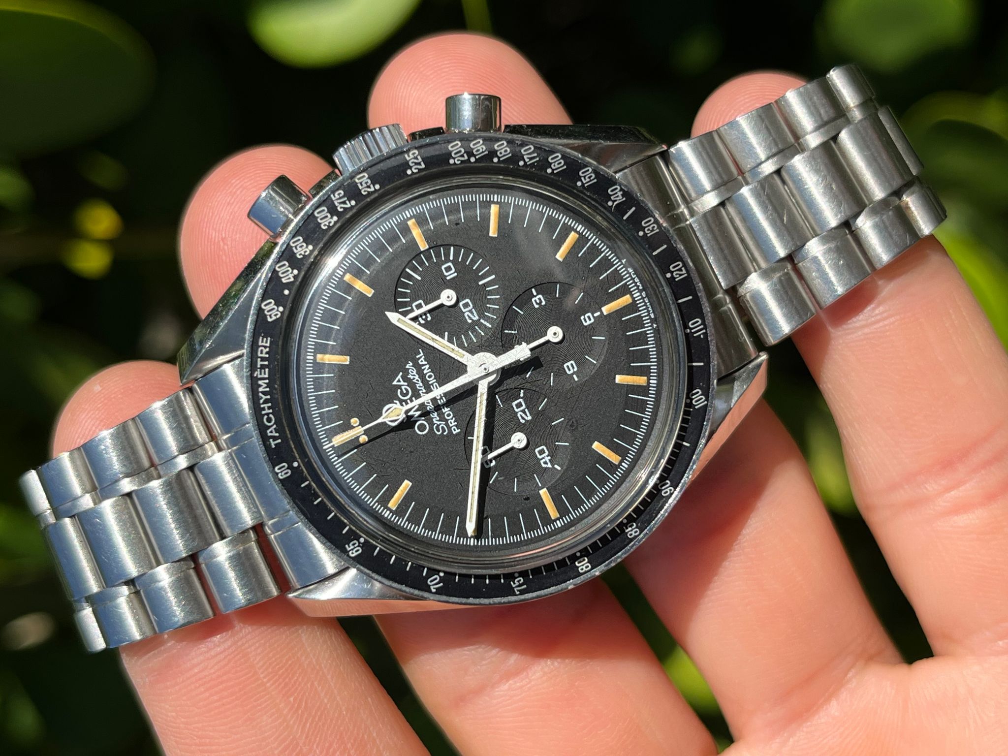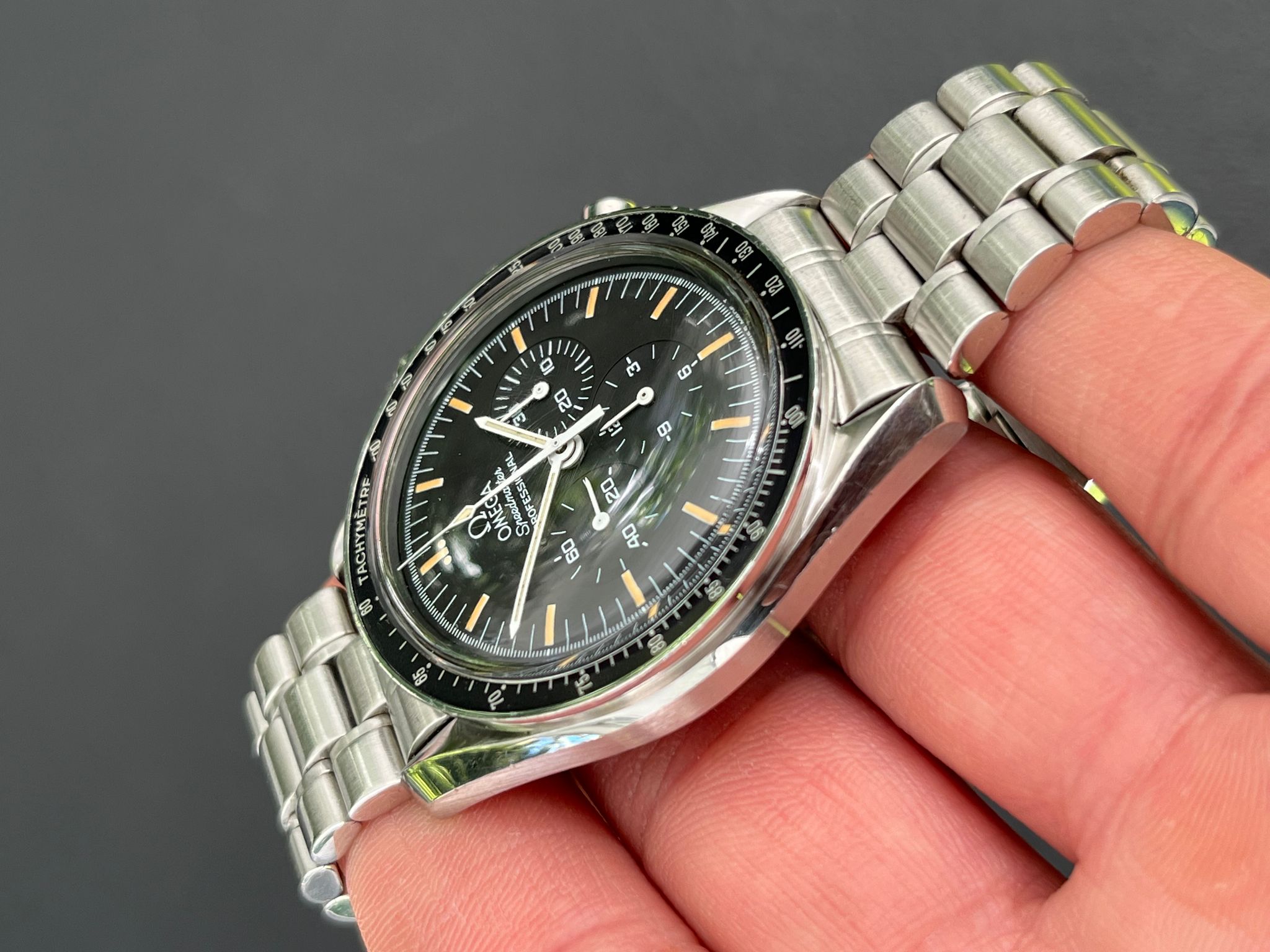 Today's example comes to us in excellent vintage condition. The patina on this dial is awesome, with nice vibrant rich pumpkin hour markers and hands. The case is thick and even showing prominent bevels. The bezel his excellent. The bracelet has 4 removable links and shows no stretch. The chronograph features are functioning as they should. Here's a vintage Speedy for ya with a killer look!
