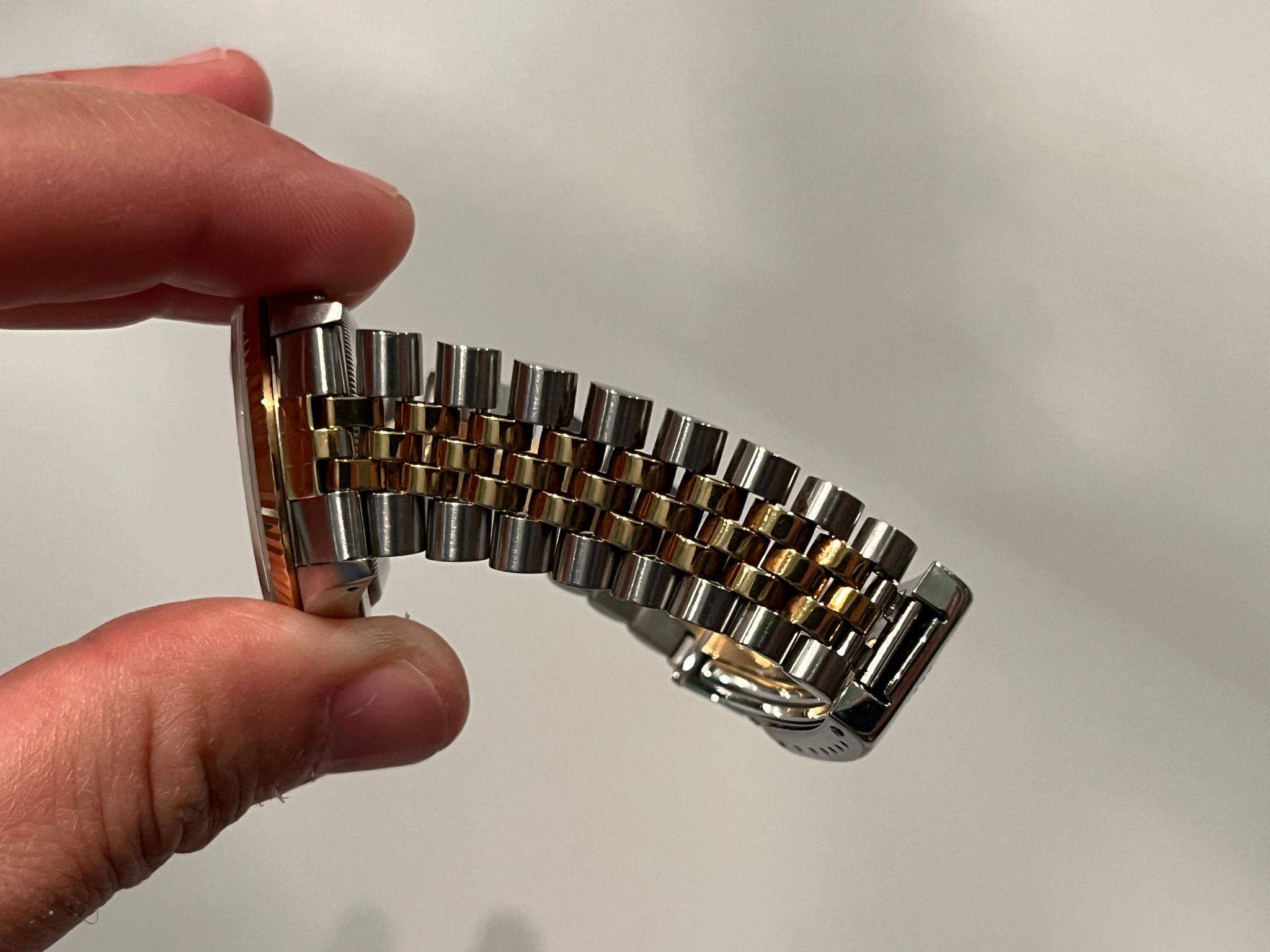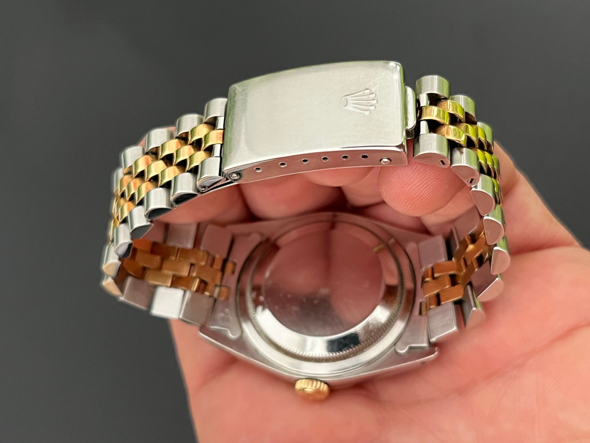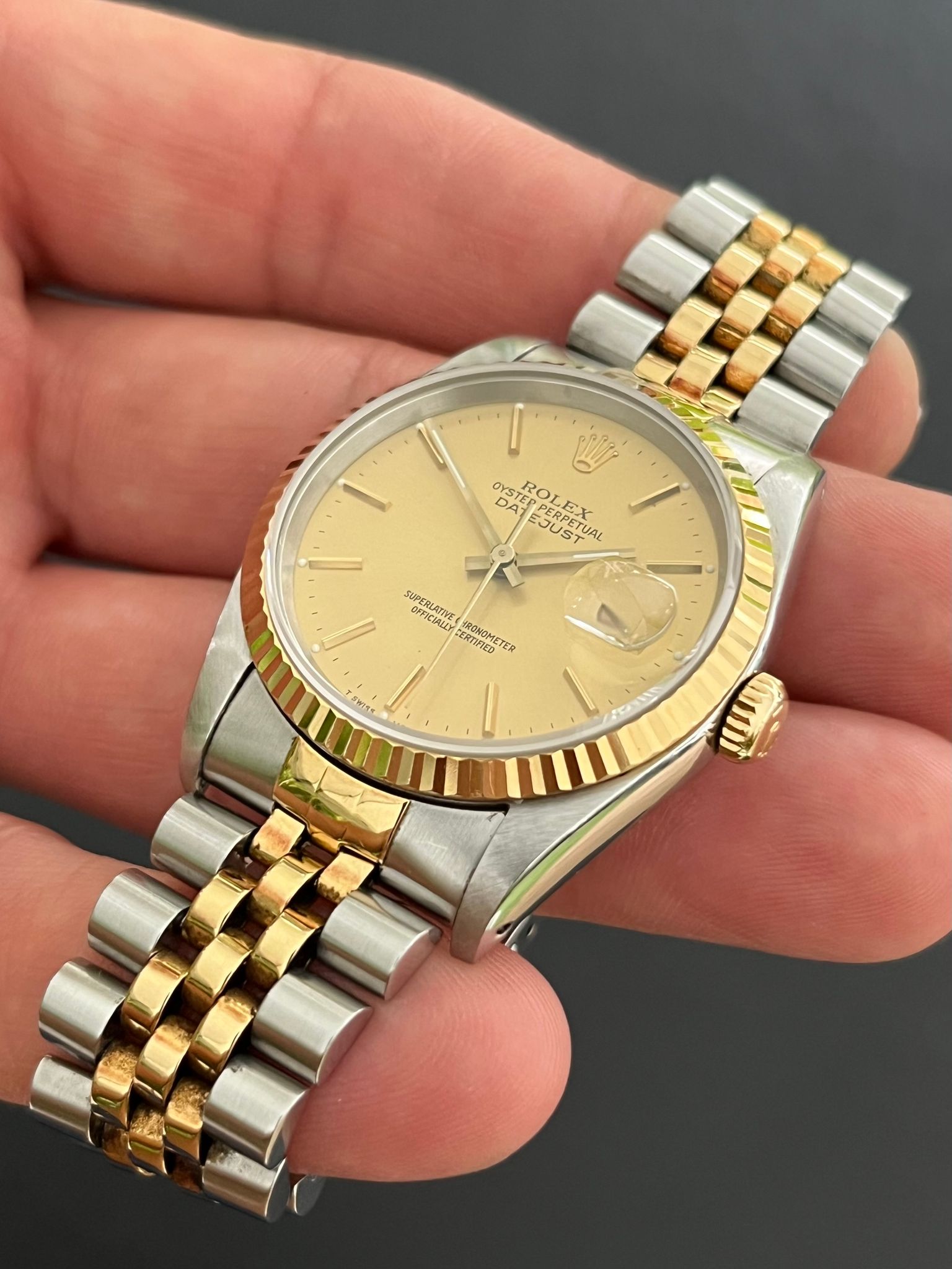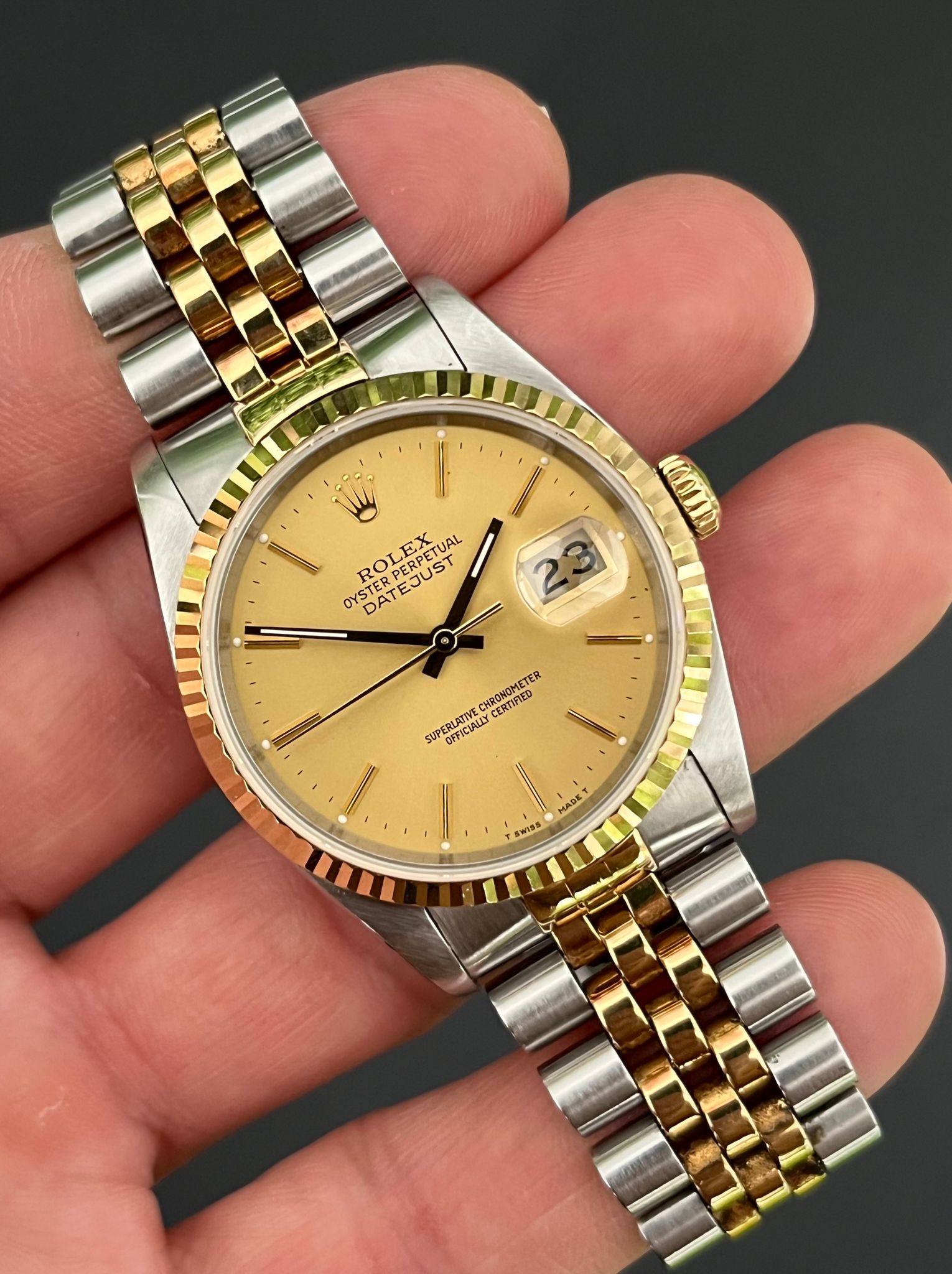 This two-tone Date Just showcases a mint champ dial featuring a date display, exemplifying Rolex's commitment to precision and enduring style. The holes case is razor sharp. The Saphire crystal is free from wear partnered with its excellent yellow gold fluted bezel. The factory diamond dial is excellent. The two-tone solid link jubilee bracelet has 3 removable screws and shows only light stretch. Watch is running and keeping time.