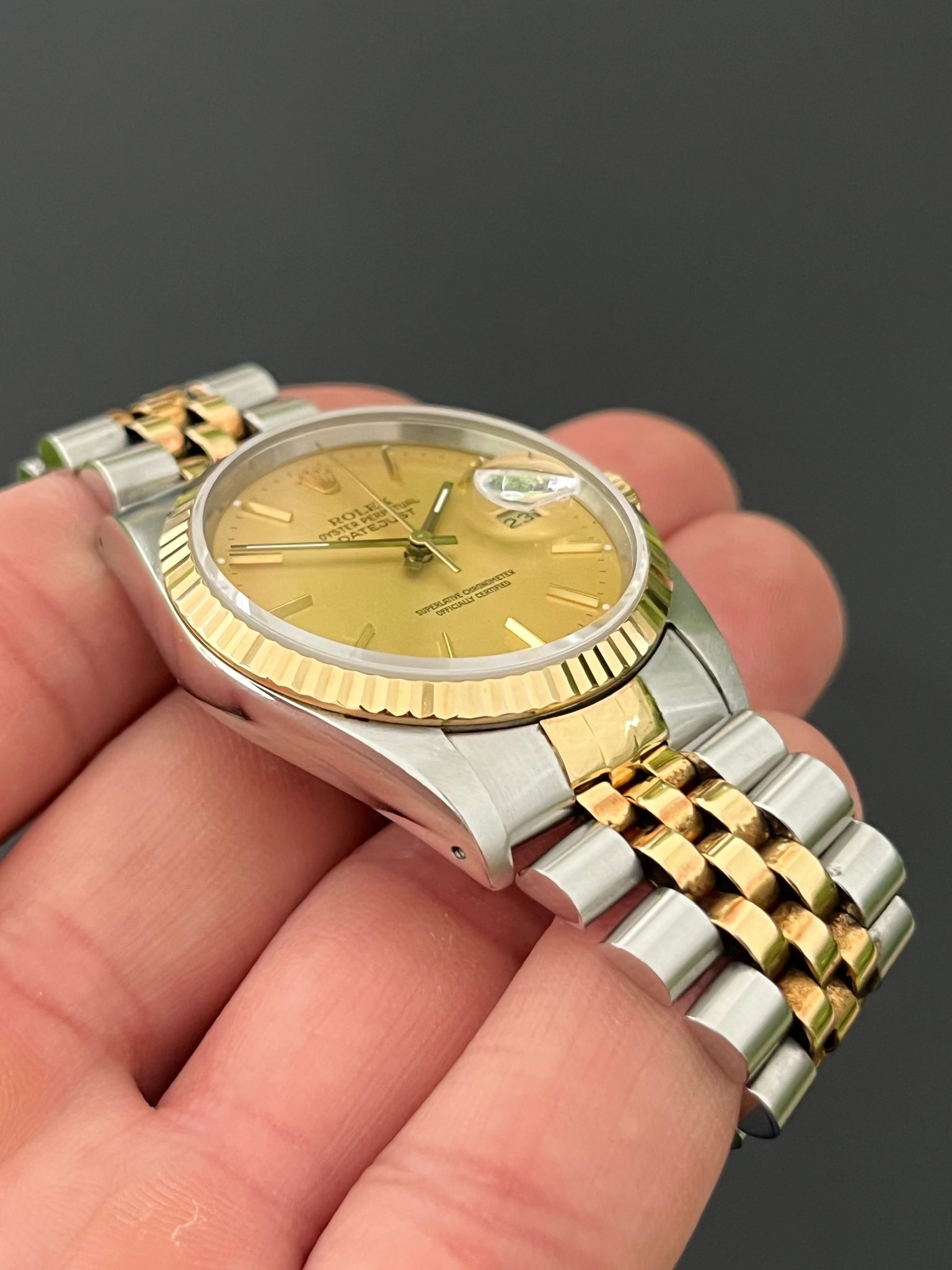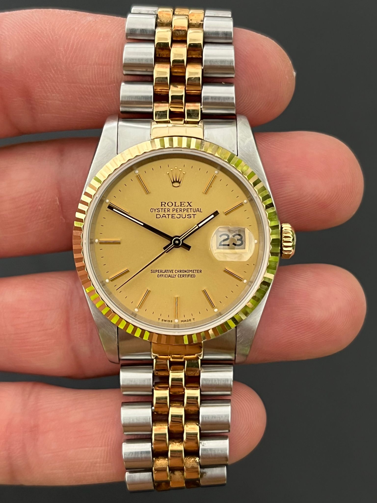 The Rolex Datejust Ref. 16233 is a timeless and elegant timepiece that epitomizes luxury and sophistication. This iconic wristwatch features a crisp champ dial, which adds a touch of opulence and refinement to its classic design. Encased in a beautifully polished stainless steel and 18k yellow gold combination, the watch seamlessly combines durability and style. With its signature Cyclops date magnification window and self-winding movement, the Rolex Datejust Ref. 16233 is not only a symbol of horological excellence but also a statement of timeless elegance for those who appreciate the finer things in life.