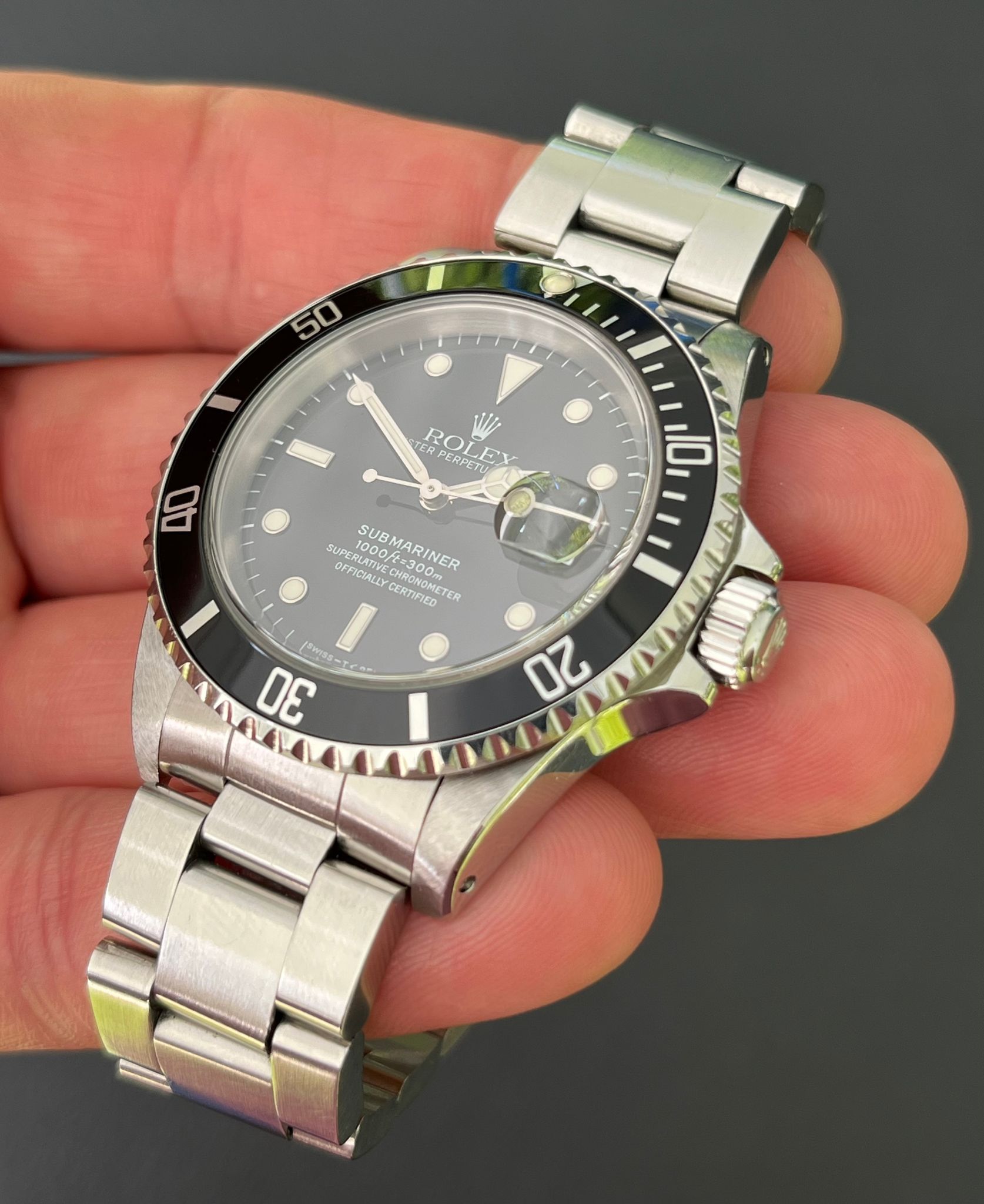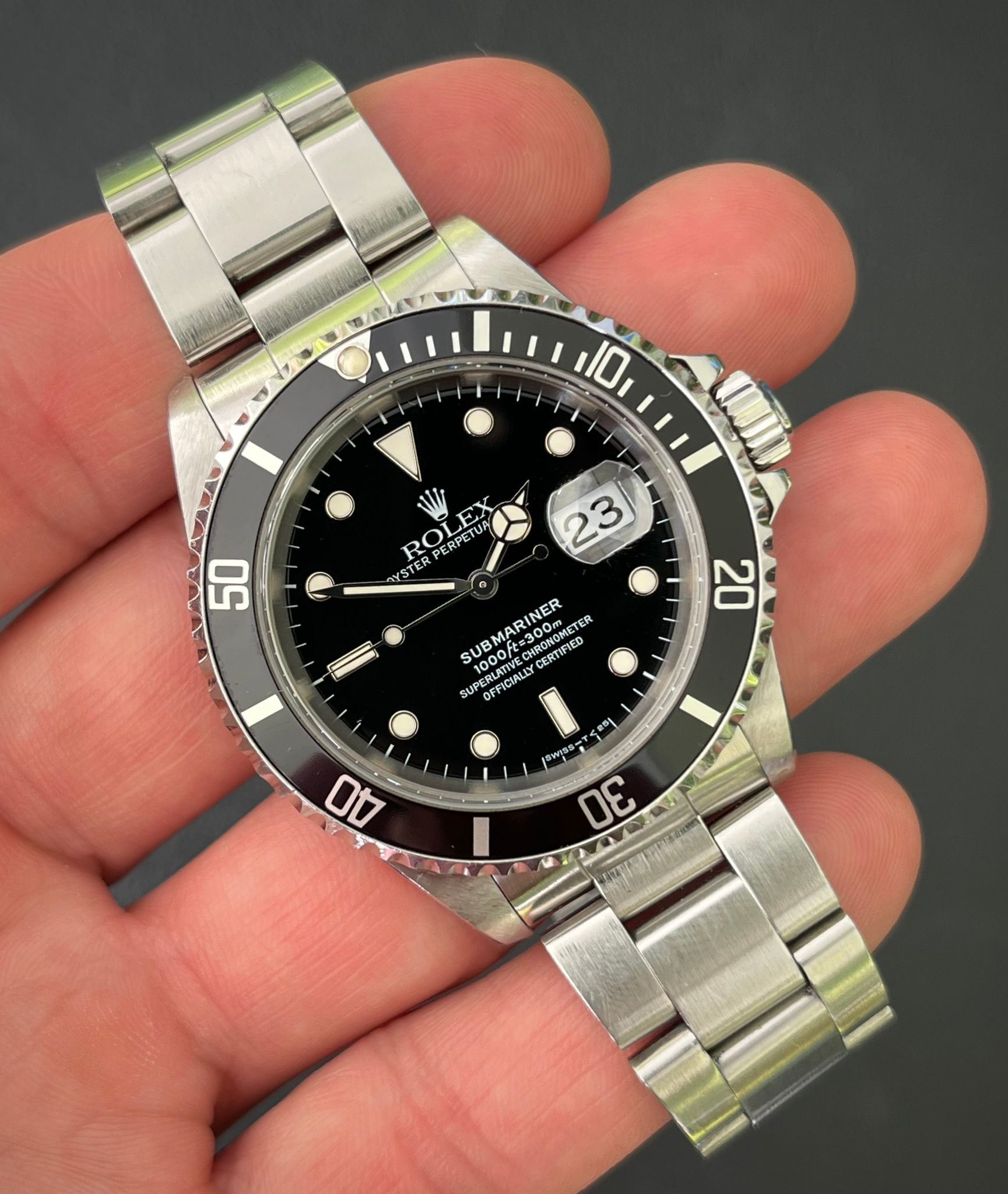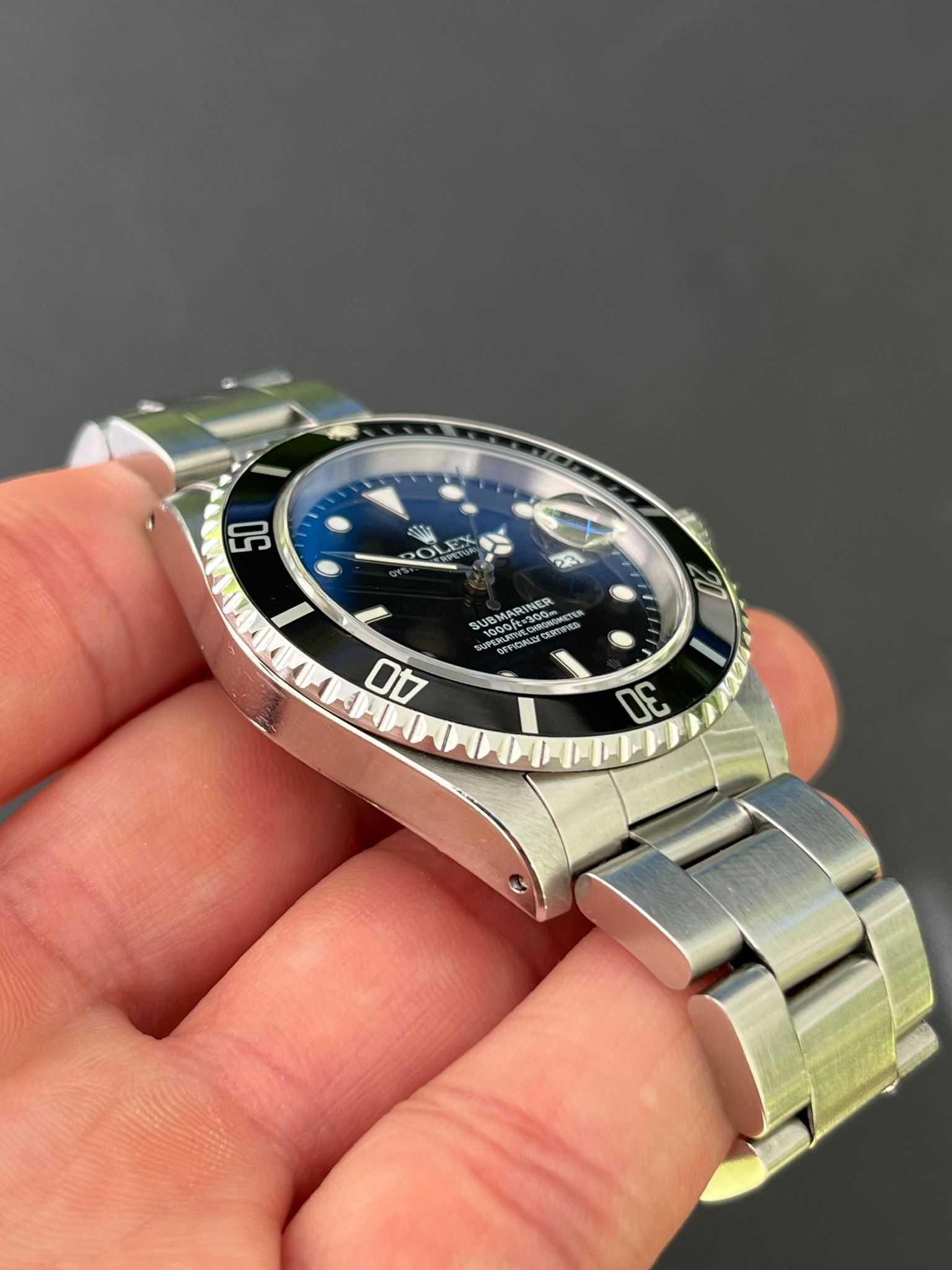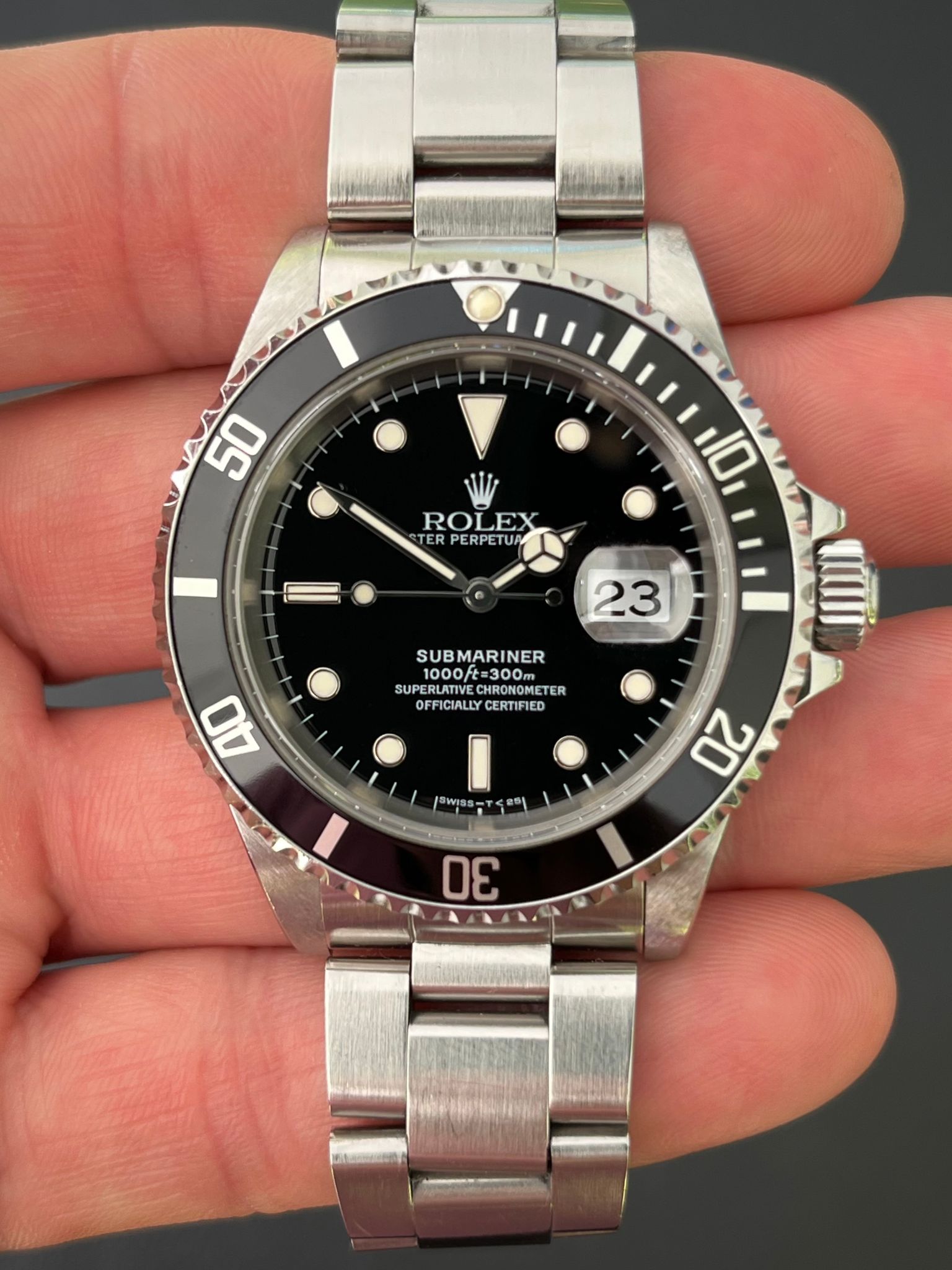 The Rolex 16610 is a highly sought-after vintage timepiece known for its distinctive design. This classic Submariner model, produced until the mid-2000s, features a stainless steel case giving it a sleek and timeless appearance. Renowned for its durability, water resistance, and iconic aesthetics, the Rolex 16610 is a beloved choice among watch enthusiasts and collectors.