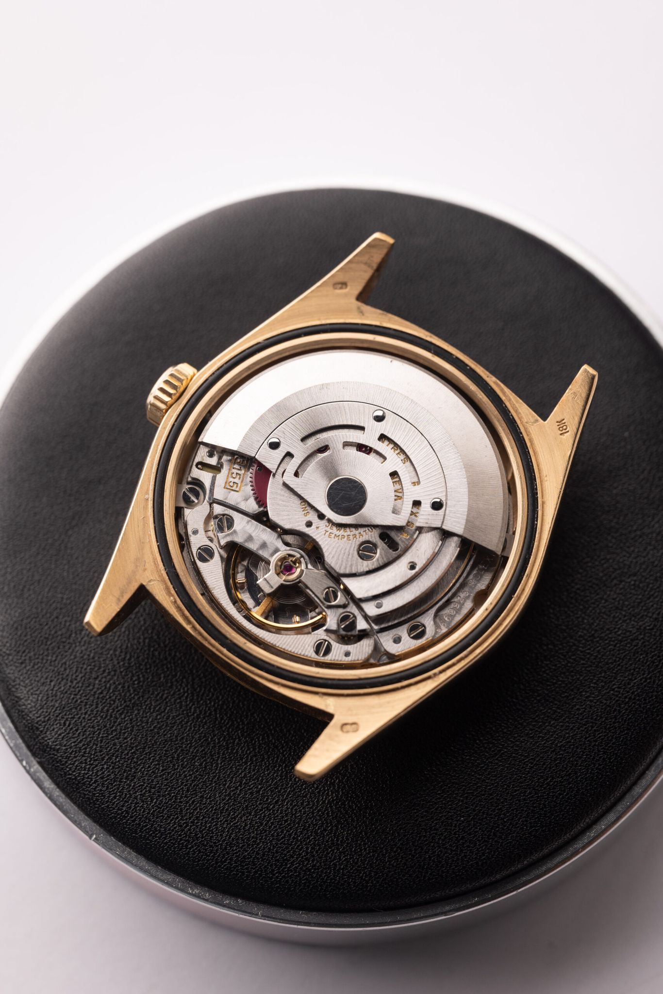 Description: The early 90’s were a great year for exotic dials from Rolex. The tuxedo dial’s are probably best known on steel Datejusts, however Rolex did produce a few gold variants for their Day-Date lineup. This is often called a tuxedo dial due to the vertical striations on the dial. Case is beautiful and unpolished as well