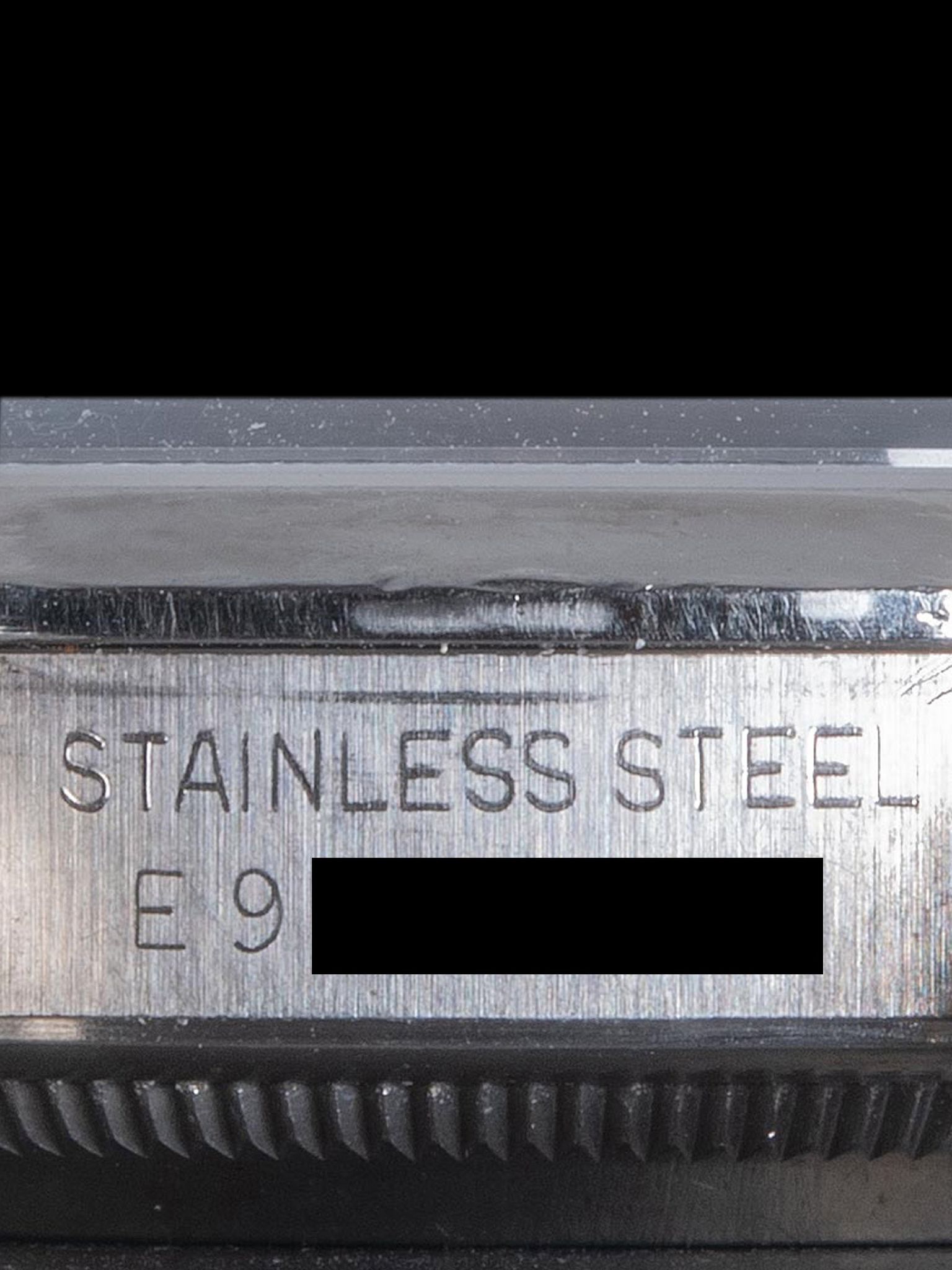 The original and very rare glossy black "Blackout" dial with white gold surround markers, silver text, and black enamel inlaid 3, 6, and 9 o'clock numeral markers is in flawless condition, showing no damage or signs of age. The tritium lume plots feature a bright ivory color with no degradation present under UV light inspection. The handset retains the original extra-long second's hand and the original tritium lume matches the dial perfectly, however, there is a slightly darker patina present in the lume nearest to the handstack which is commonly seen in this era.