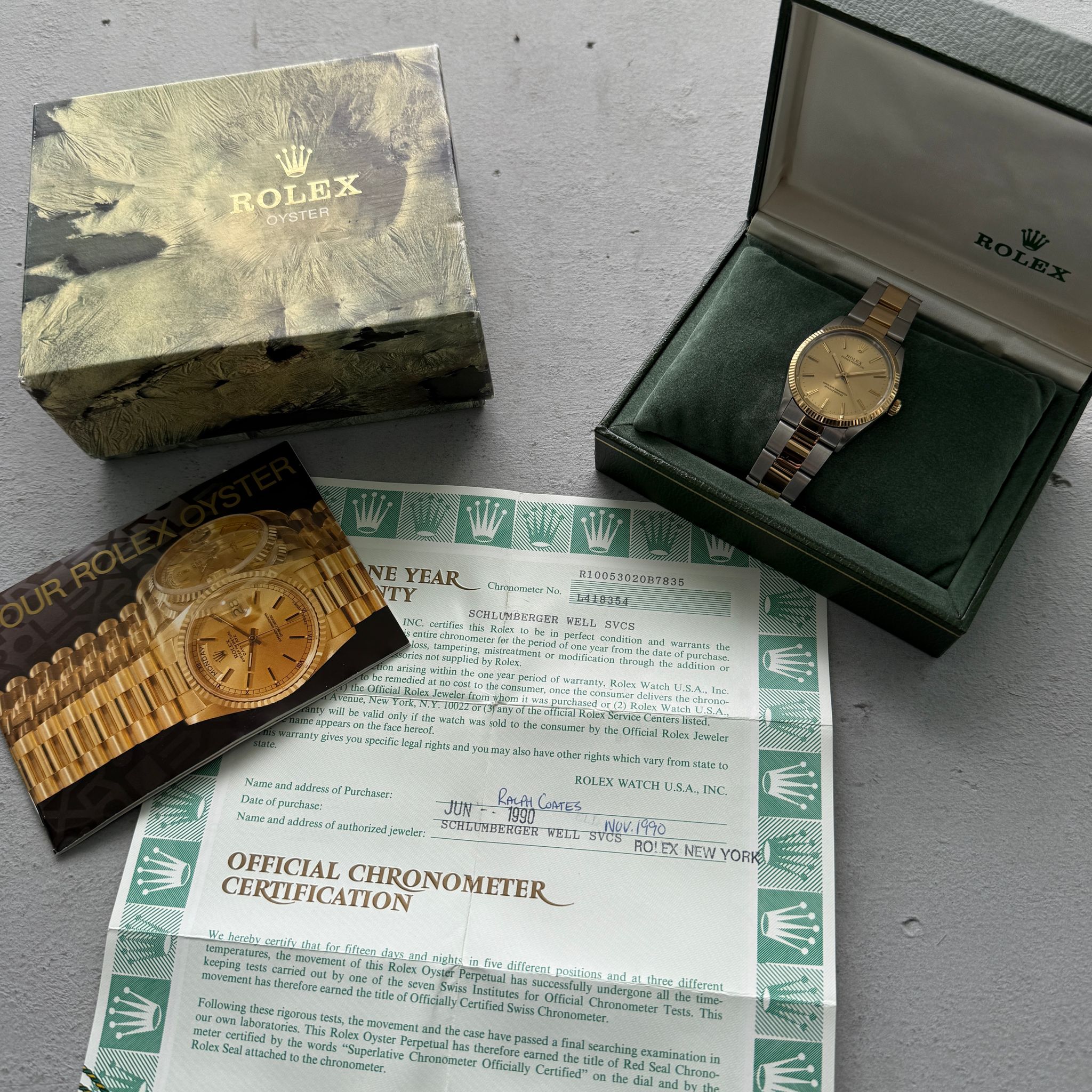 Schlumberger, a globally renowned energy company, established a tradition of celebrating employee dedication with custom Rolex watches, given as awards for 20 years of service. This Rolex Oyster Perpetual 1500 stands as a testament to that legacy, representing both the prestige of Rolex and the honor of a career-long achievement. The Schlumberger marking on the warranty papers adds a rare and personal touch that elevates its value and narrative, making it an extraordinary piece of horological history.