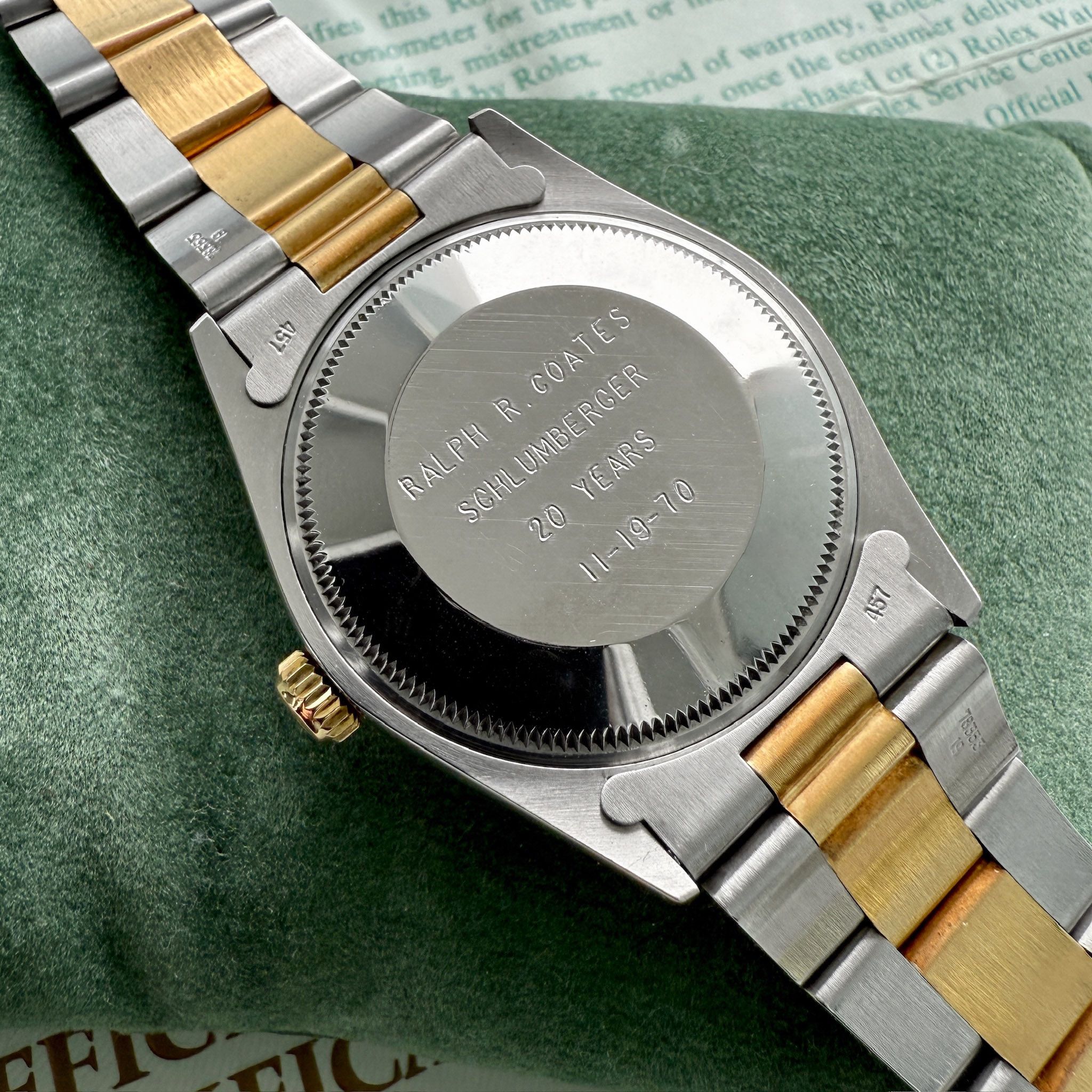 Polished back to factory Rolex condition and freshly serviced by a professional watchmaker, the watch gleams with renewed brilliance, ready to stand the test of time once again. Its exceptional design and reliable performance make it a standout piece for both daily wear and special occasions. Complete with its original box and warranty papers, this watch carries the added allure of being specially marked with “Schlumberger,” a touch that transforms it into a true collector’s item.