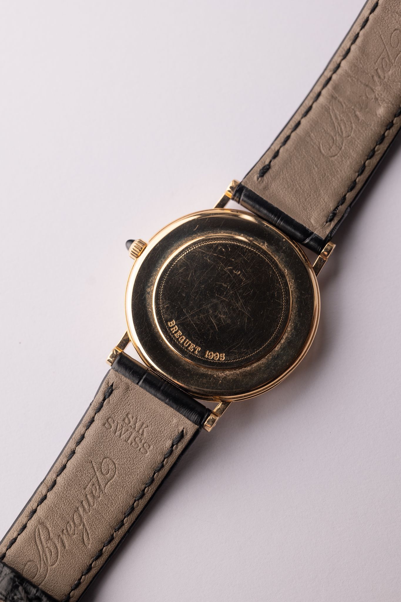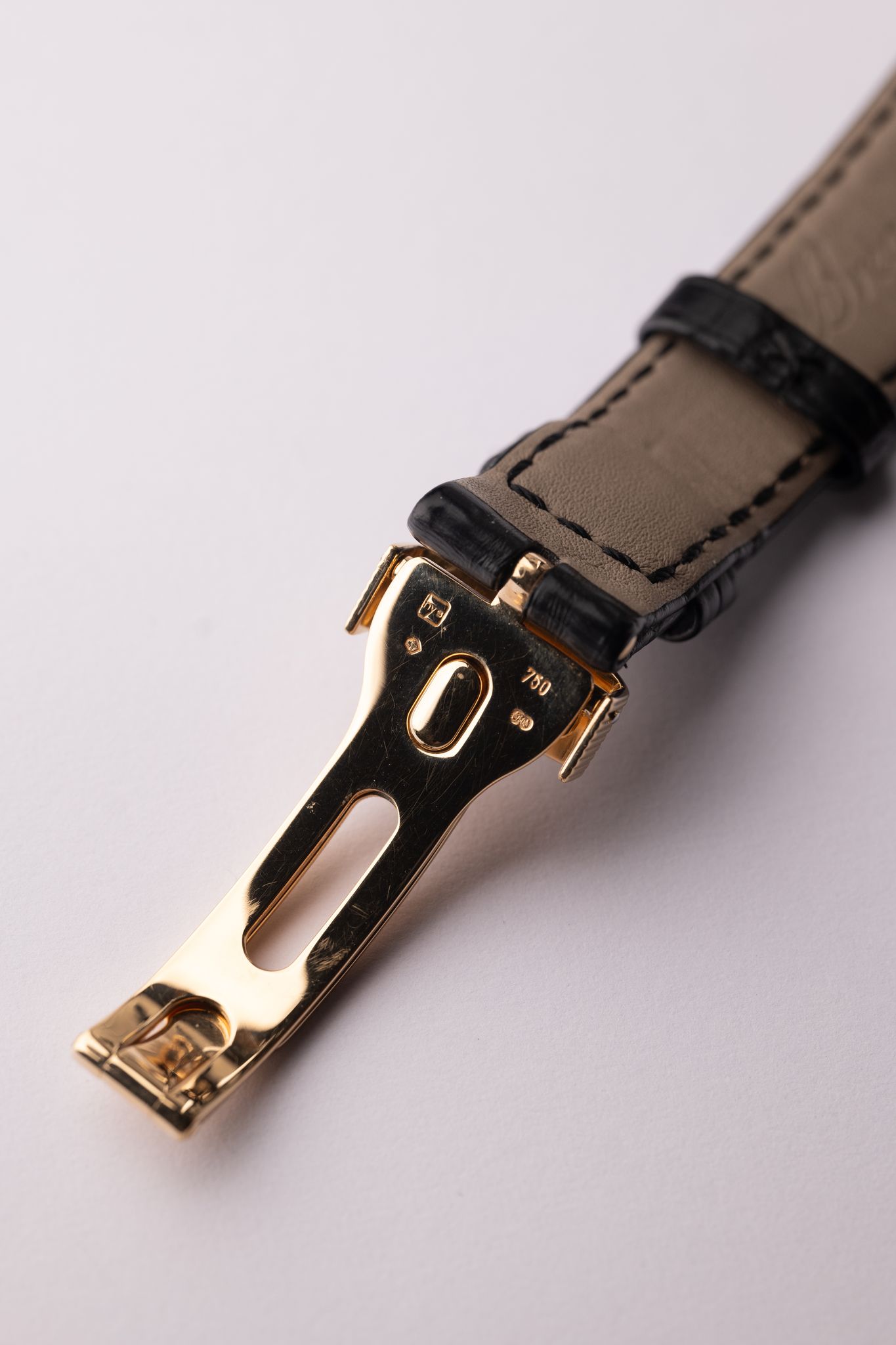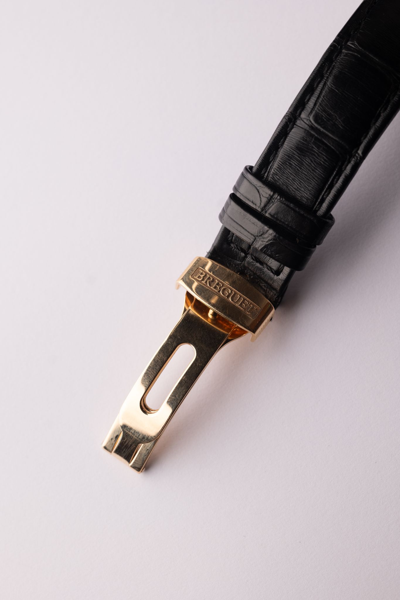 The 18K yellow gold case (32.5mm x 6mm) has Breguet's signature coin-edge and a cabochon crown. It comes with the original Breguet leather strap and 18K yellow gold deployant buckle.