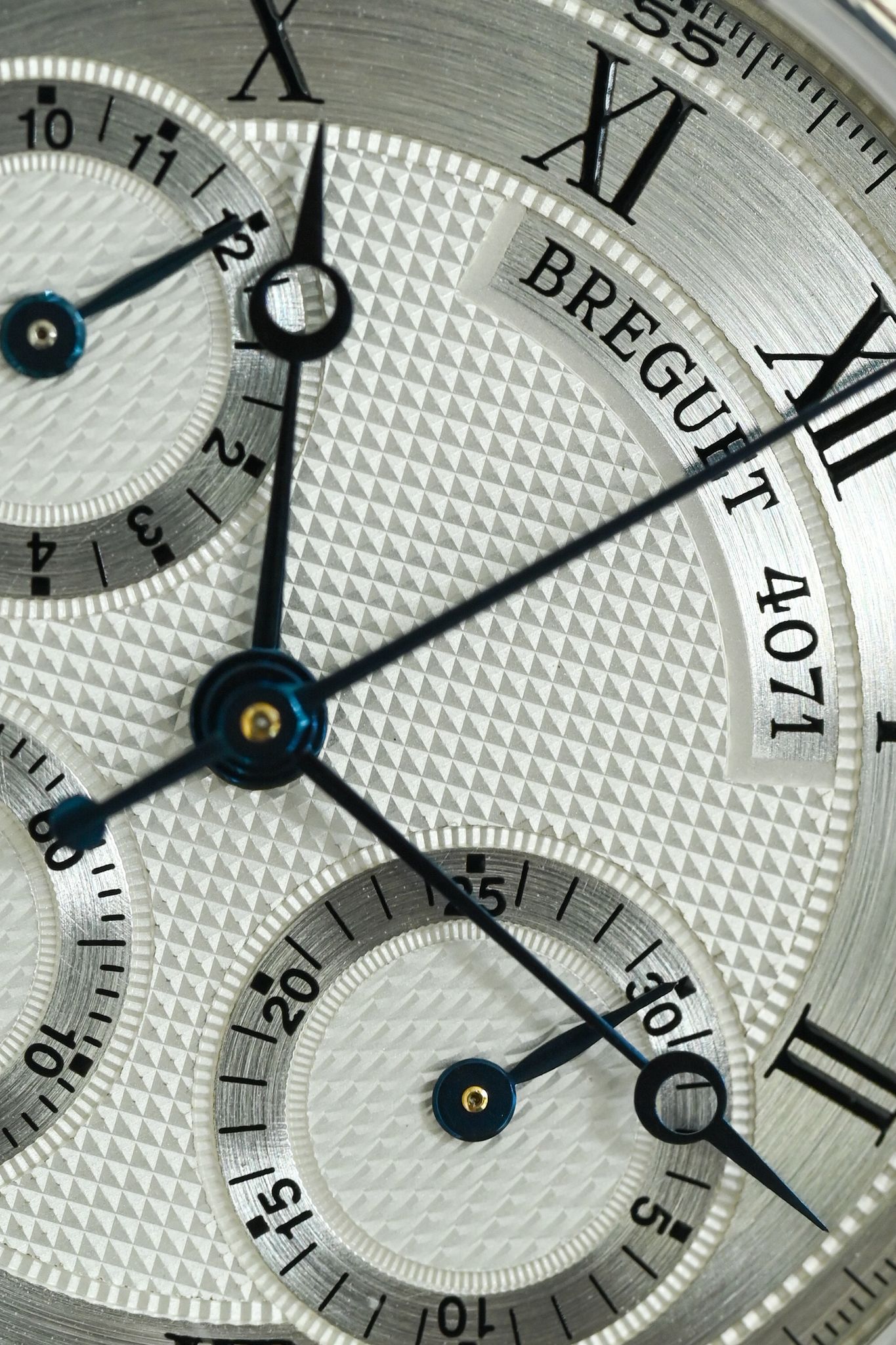 Dial: Silver Guilloche dial with outter brushed dial and Roman numerals. The dial features the sub dials and a date at 6.
