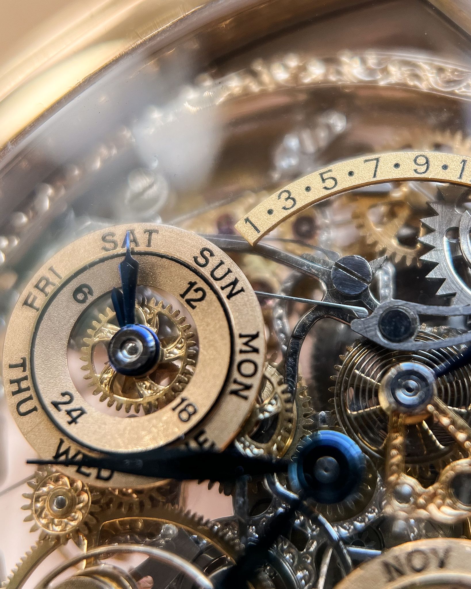The case is in great shape with all engravings deep and lugs well defined. The movement is the highlight of course with the inner workings heavily skeletonised and hand engraved, exceptional in the metal! The watch is accompanied by its original 18k rose gold pin buckle.