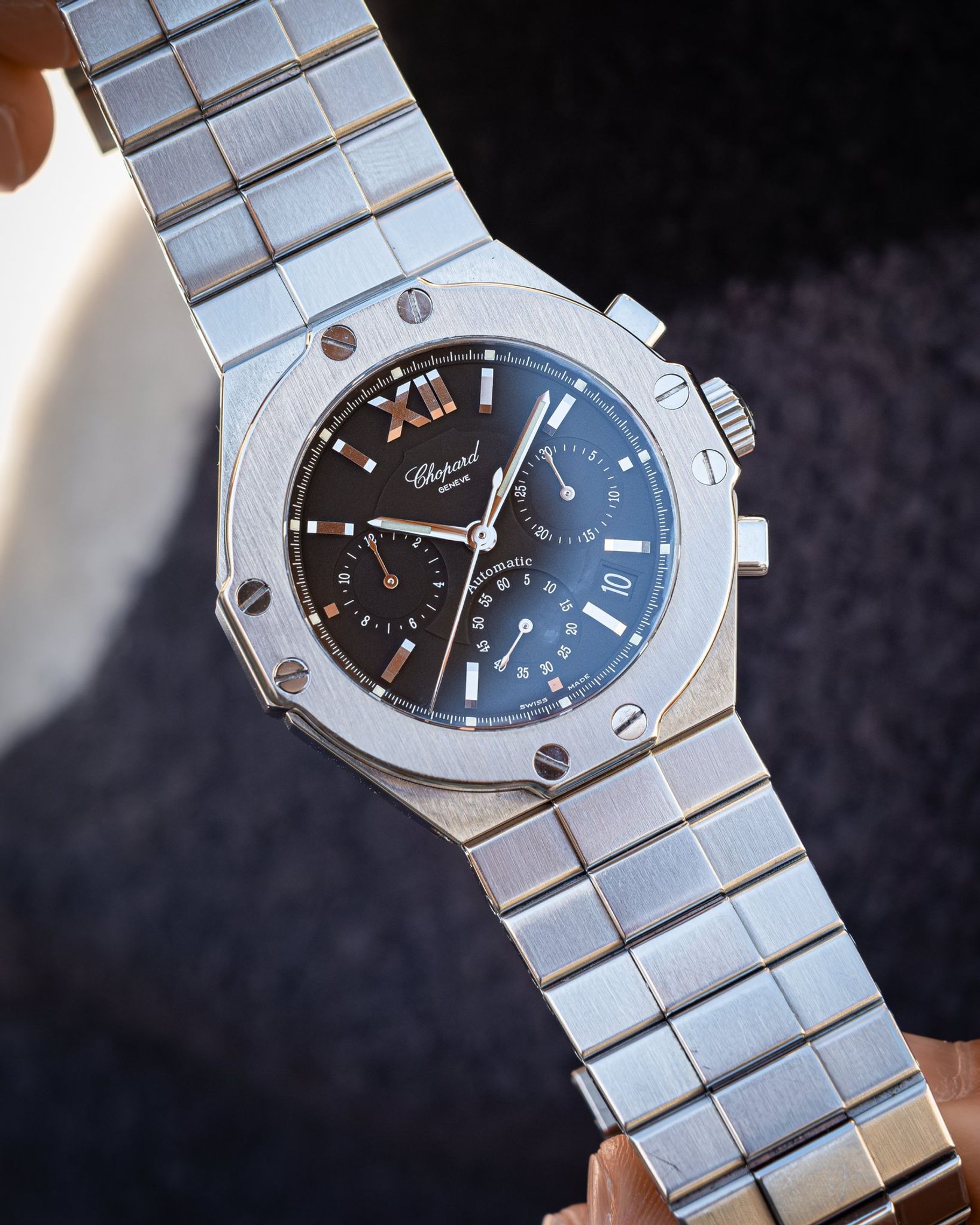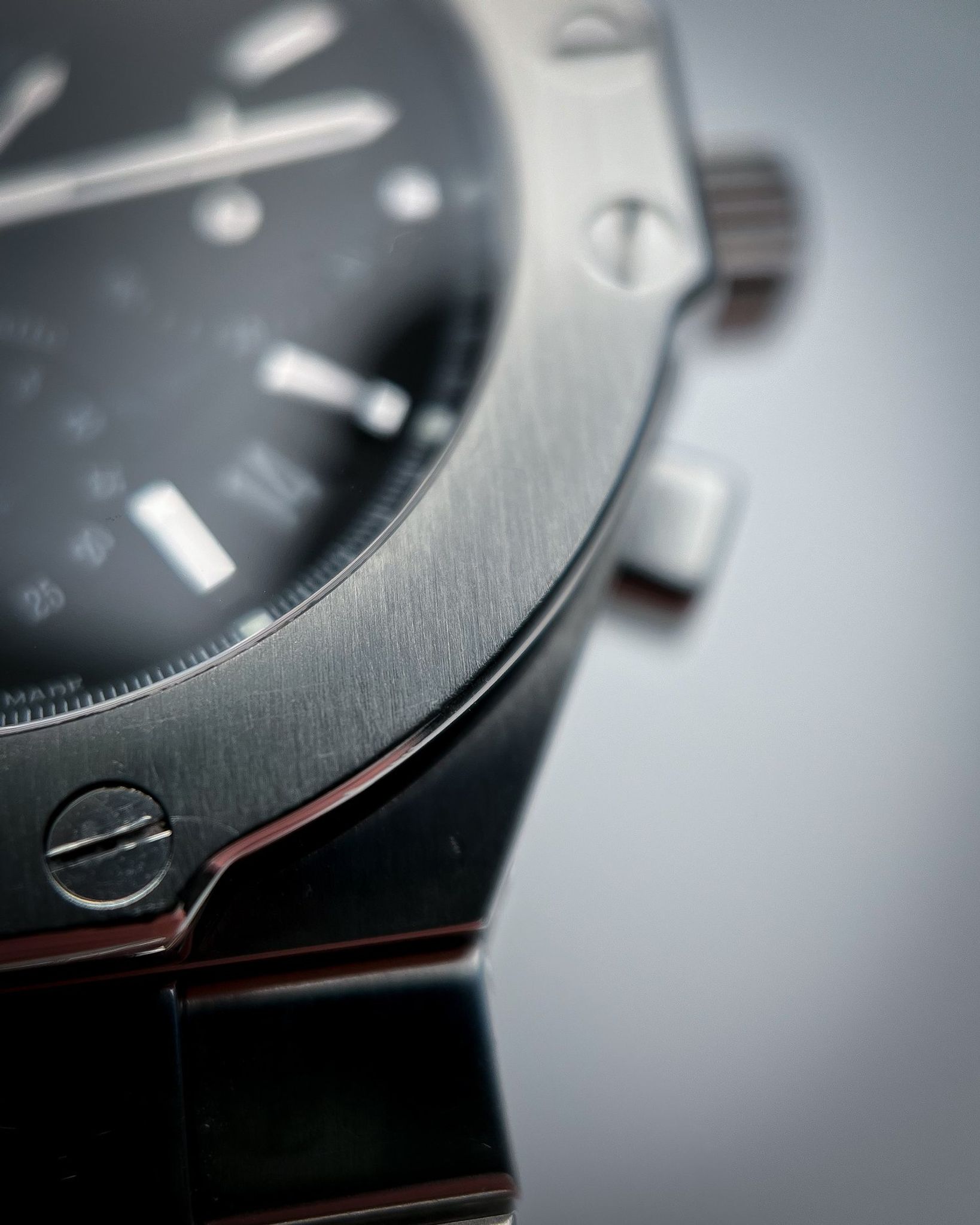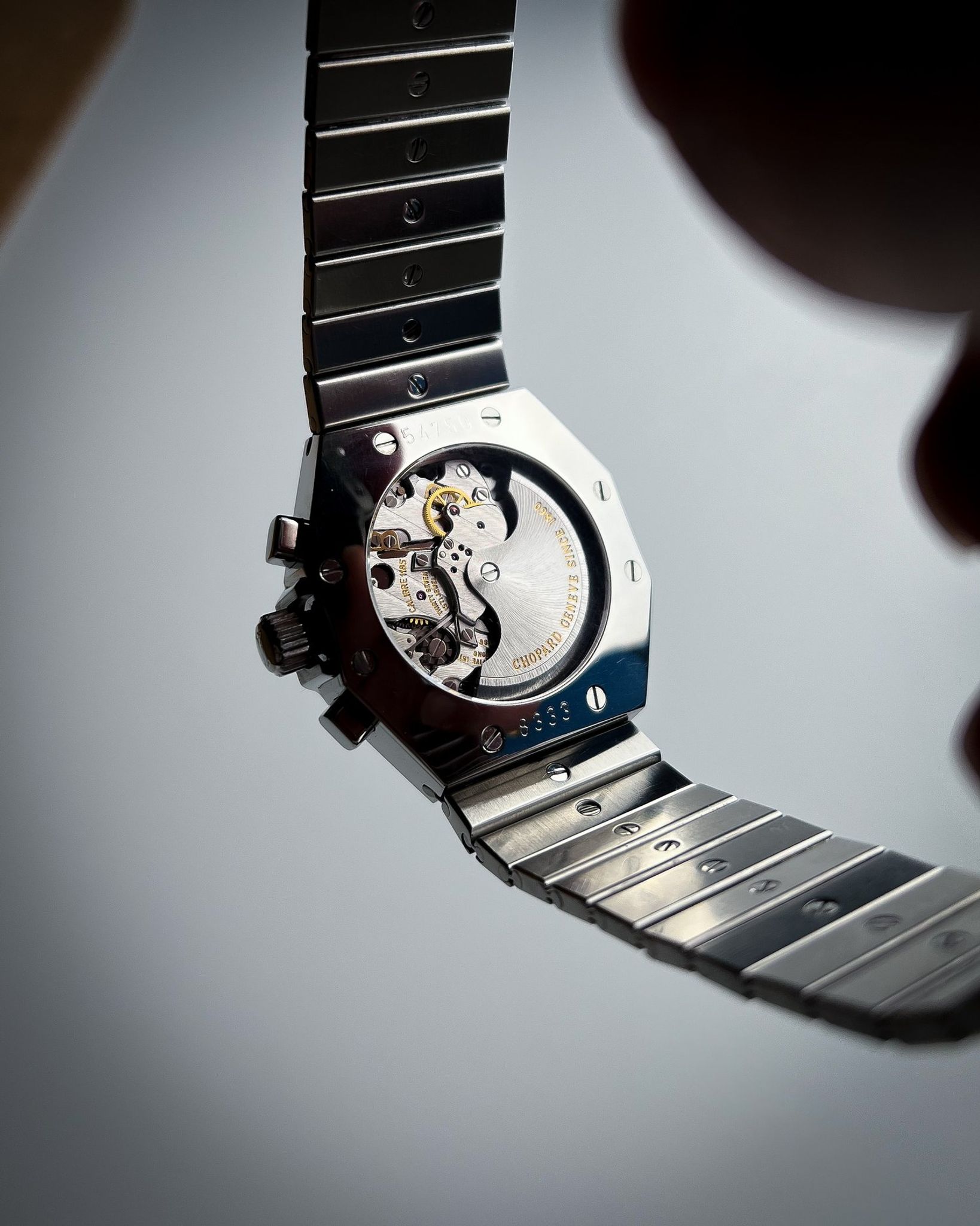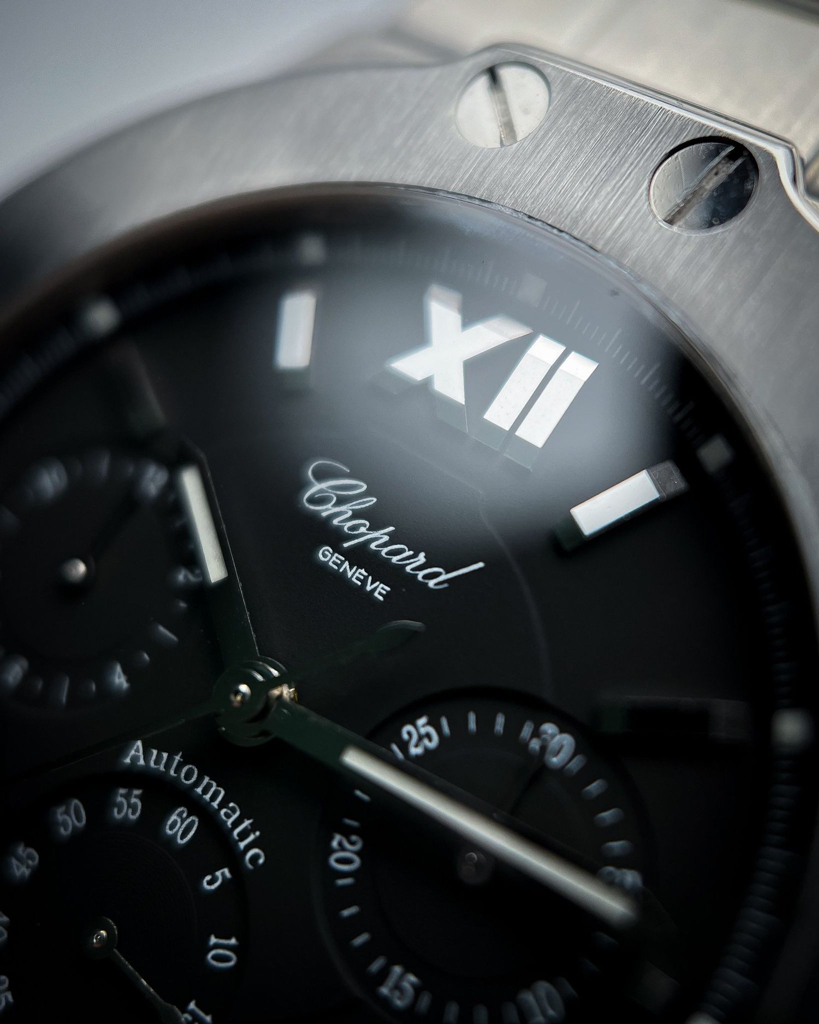 What I love — An interesting model from the 90’s St. Moritz line and rarely seen in the wild, this 8333 Chronograph features a stealthy matte black dial with subtle pattern to the sub dials. The black/steel combo is striking complimented by the black date disc. The dial is in great condition and the case/bracelet sharp, bracelet shows zero stretch. Interestingly the watch features a display case back, always a delight, and the bracelet fits up to 18,5cm (I’m sure Chopard can provide more links if needed). The watch comes complete with boxset and paperwork from new.