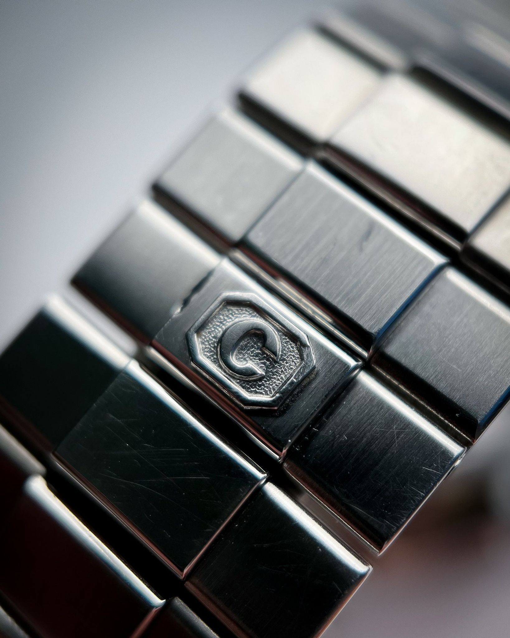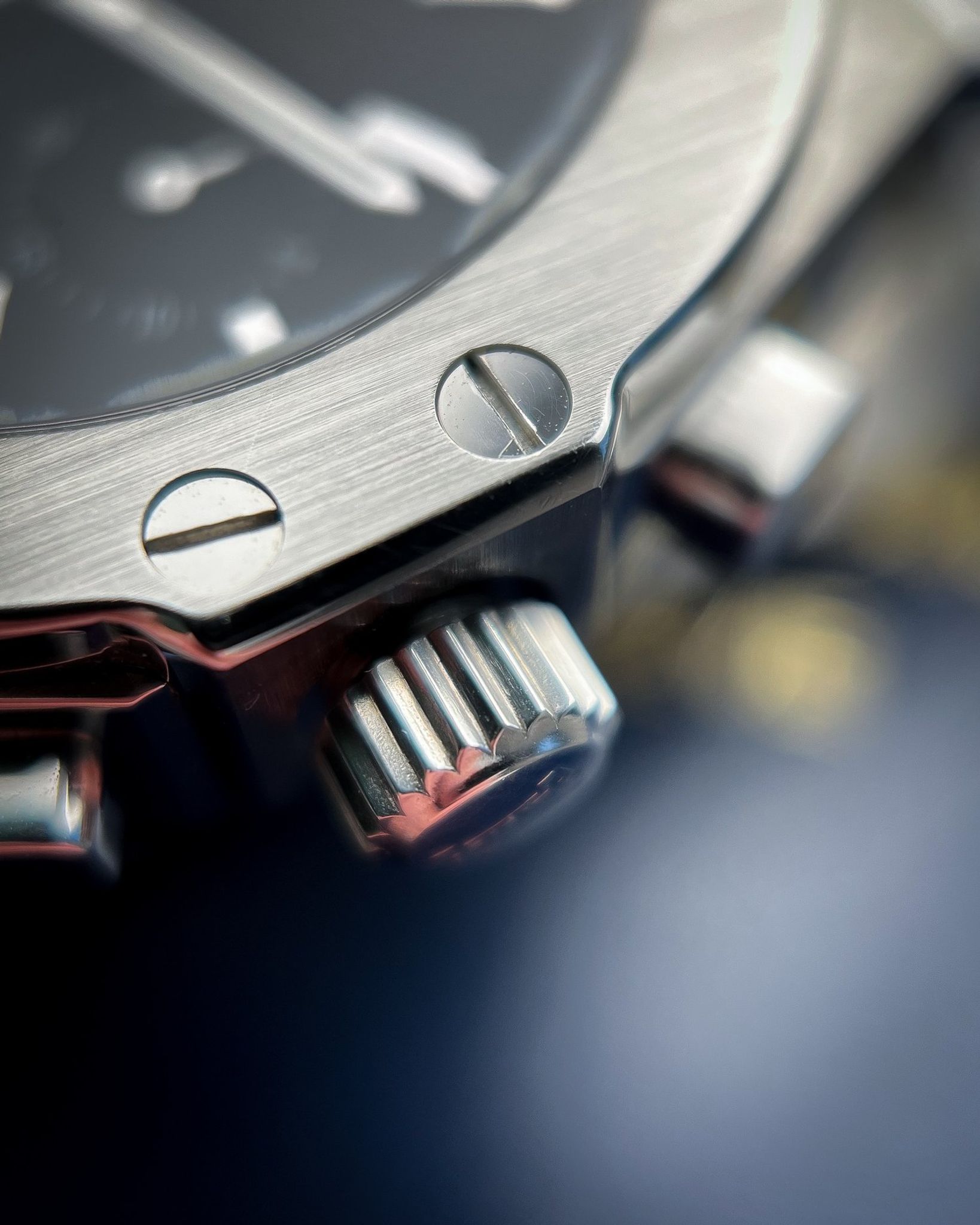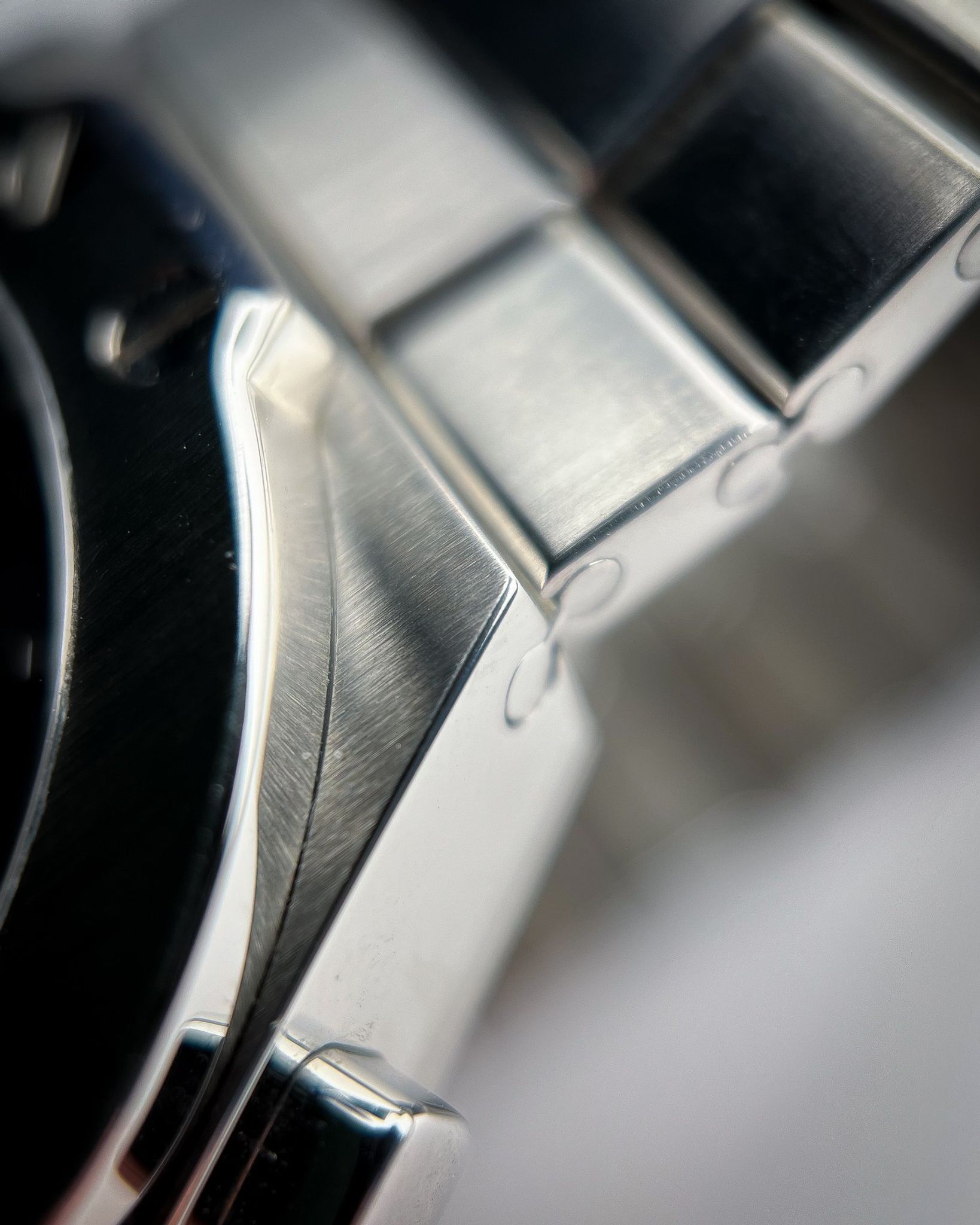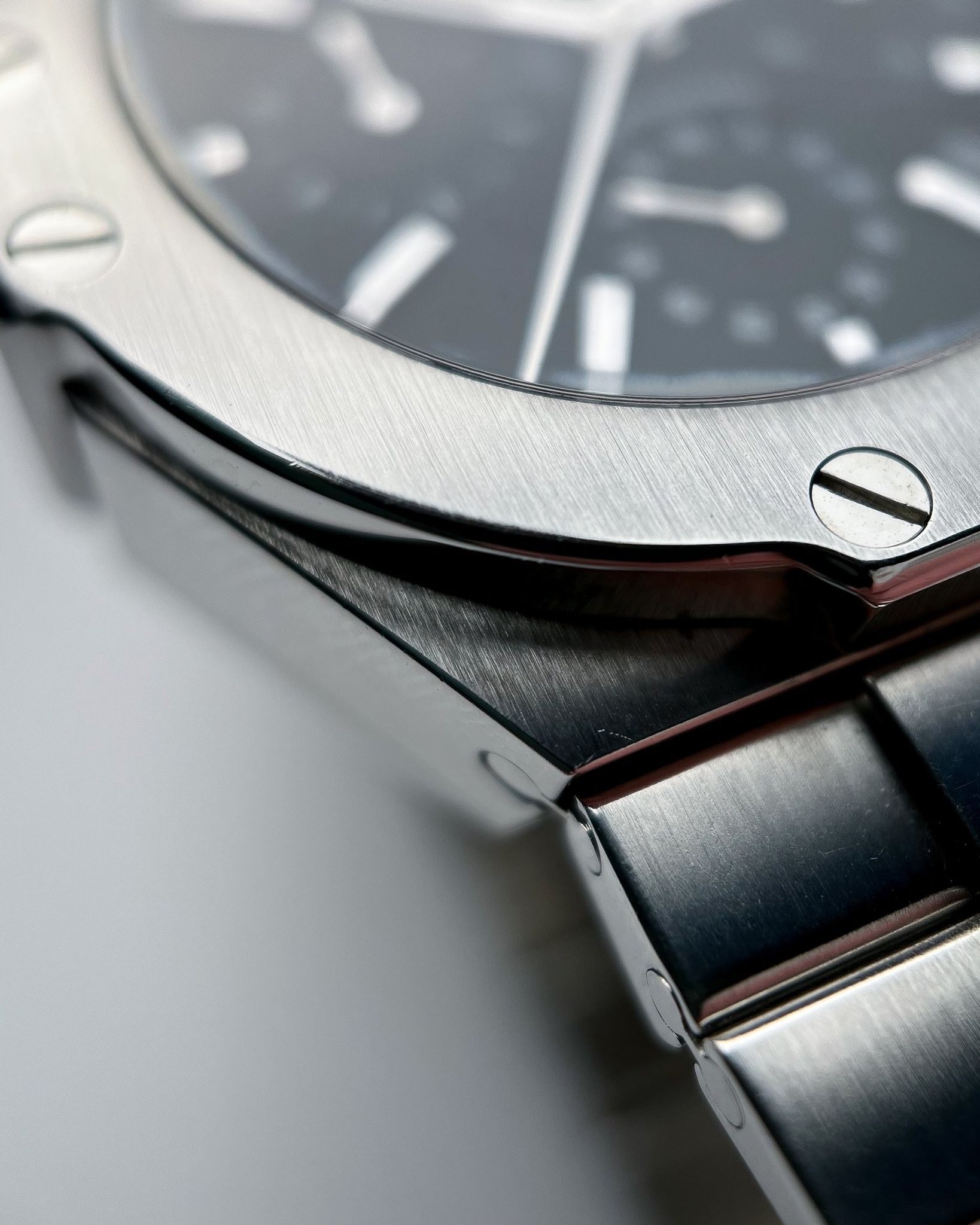 What I love — An interesting model from the 90’s St. Moritz line and rarely seen in the wild, this 8333 Chronograph features a stealthy matte black dial with subtle pattern to the sub dials. The black/steel combo is striking complimented by the black date disc. The dial is in great condition and the case/bracelet sharp, bracelet shows zero stretch. Interestingly the watch features a display case back, always a delight, and the bracelet fits up to 18,5cm (I’m sure Chopard can provide more links if needed). The watch comes complete with boxset and paperwork from new.