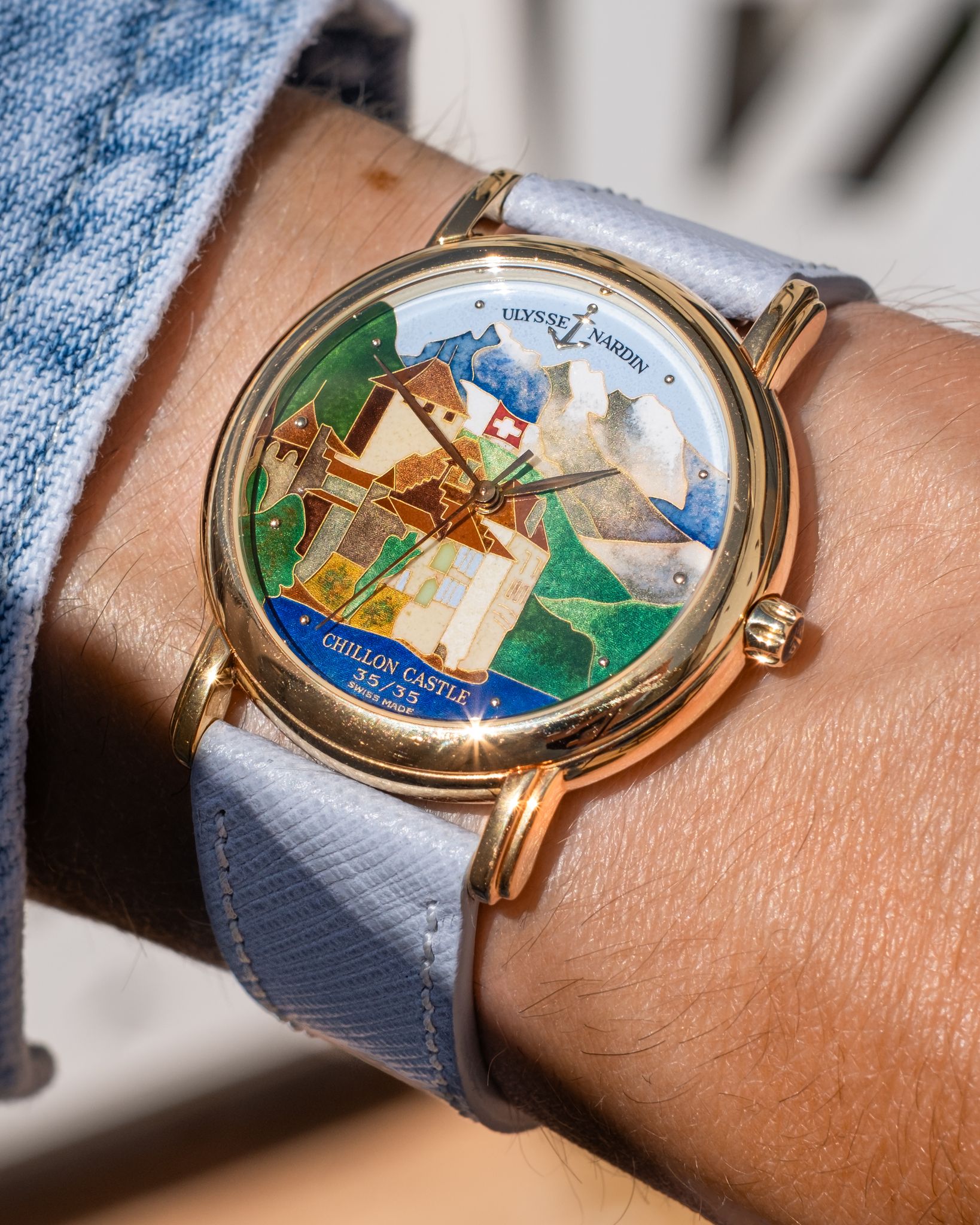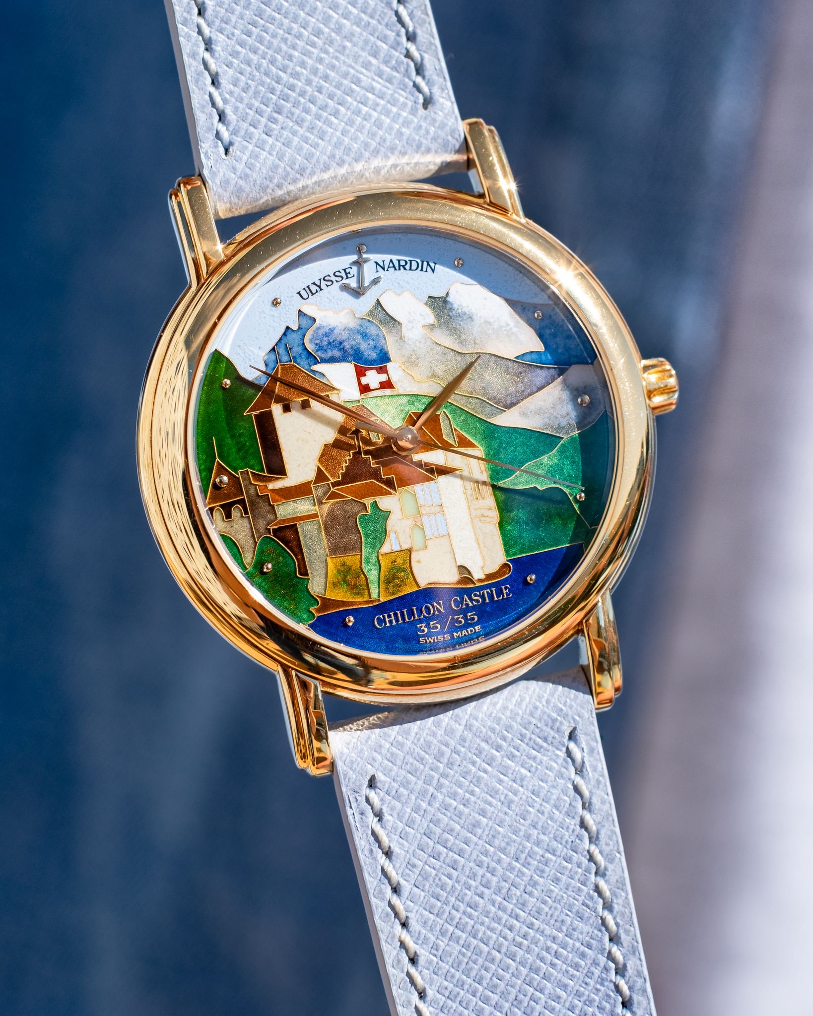 A truly breathtaking Ulysse Nardin, with one of the most vibrant and interesting scenes out there for the San Marco 131-77-9, the Chillon Castle in Switzerland.