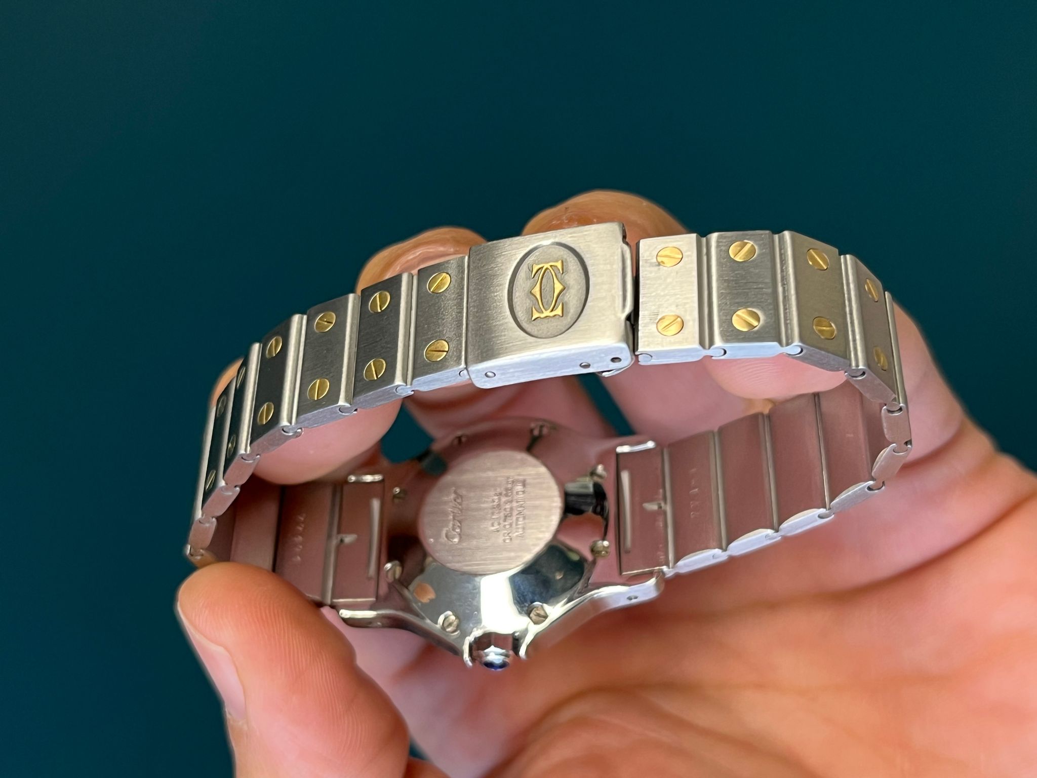 Its silvered dial with classic Roman numerals and blued steel hands captures Cartier’s timeless aesthetic, while the automatic movement delivers reliable Swiss precision. The two-tone bracelet seamlessly integrates into the case, offering a sophisticated balance between sport and refinement.