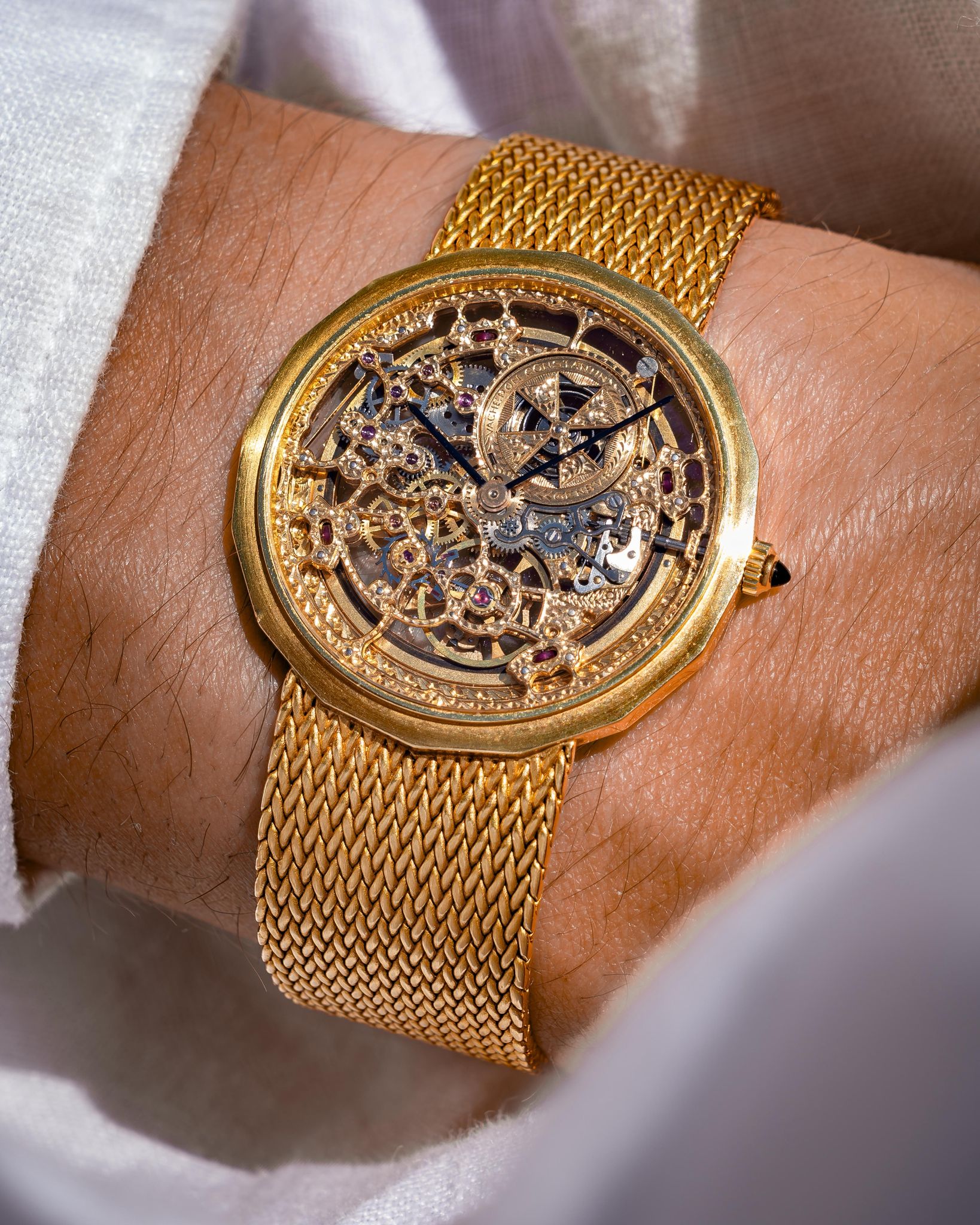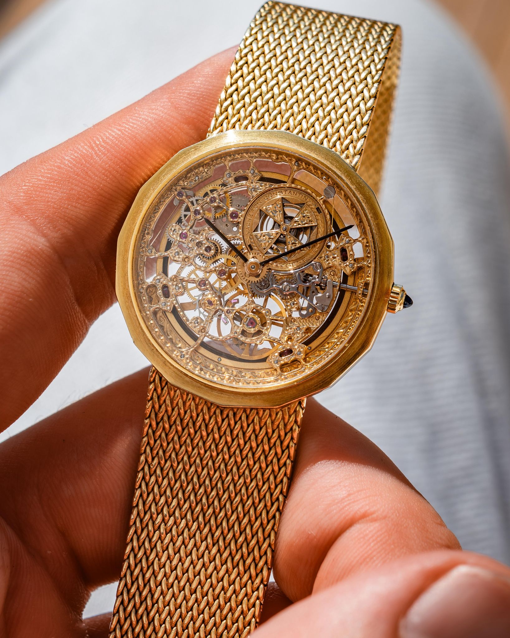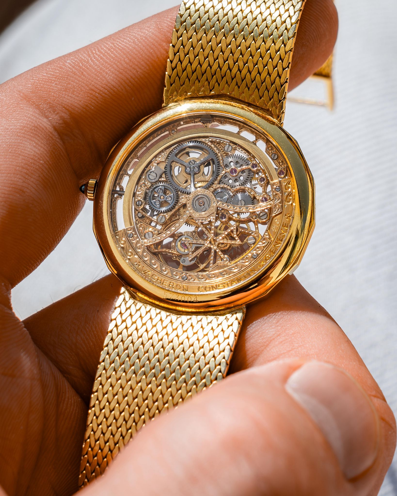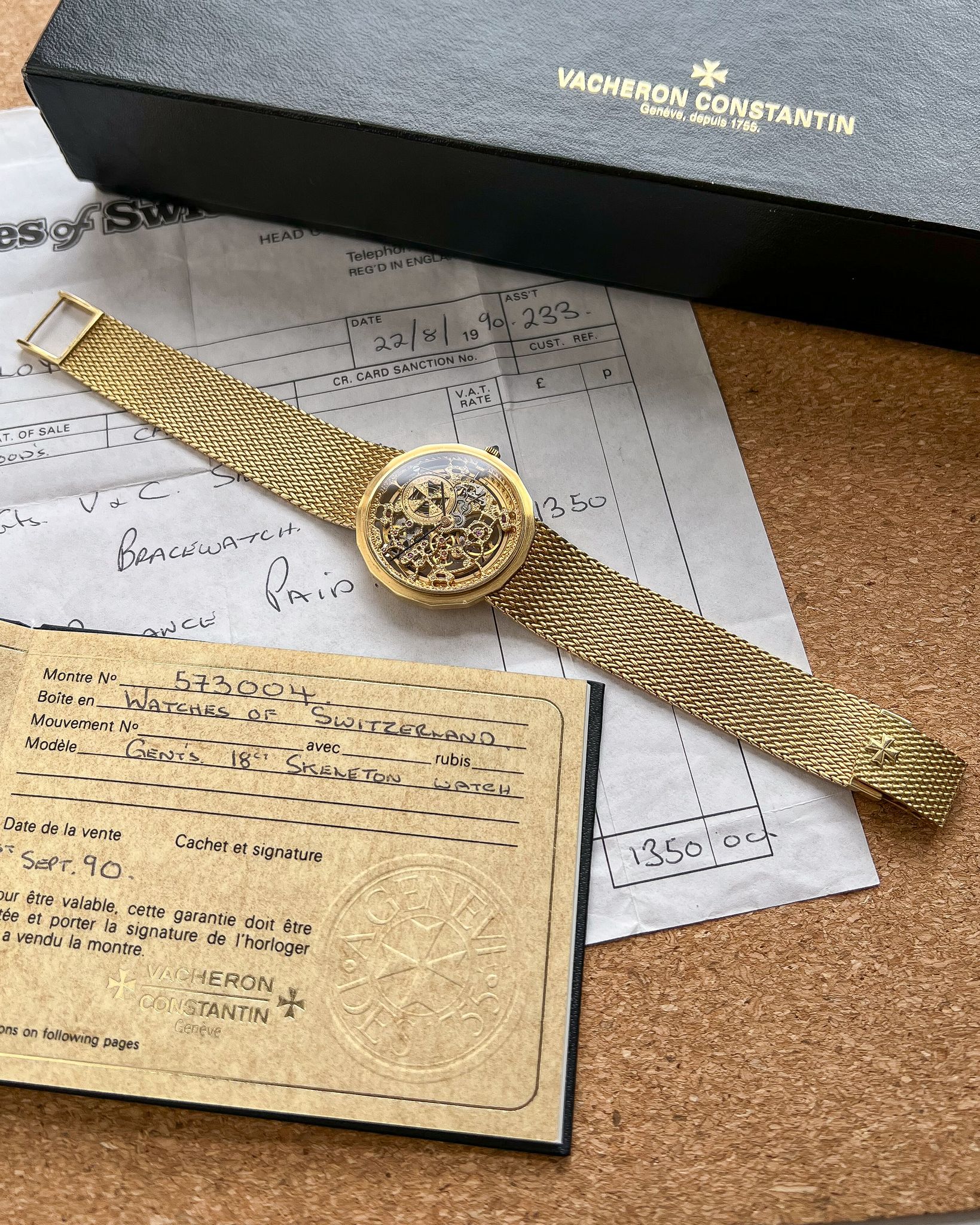 What I love — Rare and beautiful, fully hand engraved skeletonized VC powered by the automatic JLC 920 ébauche. Complete set including the original receipt from the Manchester Watches of Switzerland in 1990. The case is in good condition, rather delightful 16 sided case with hallmarks present on the side. This bracelet variant is very uncommon, the first I’ve seen and will fit up to 19cm. The watch has just had a full mechanical service and ready to roll!