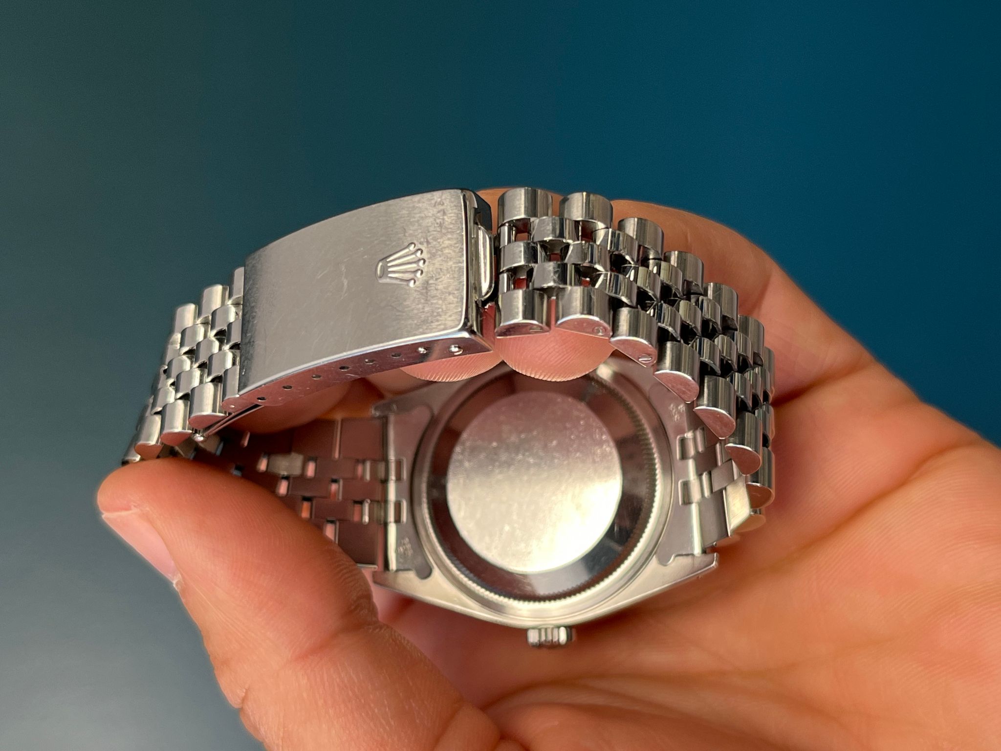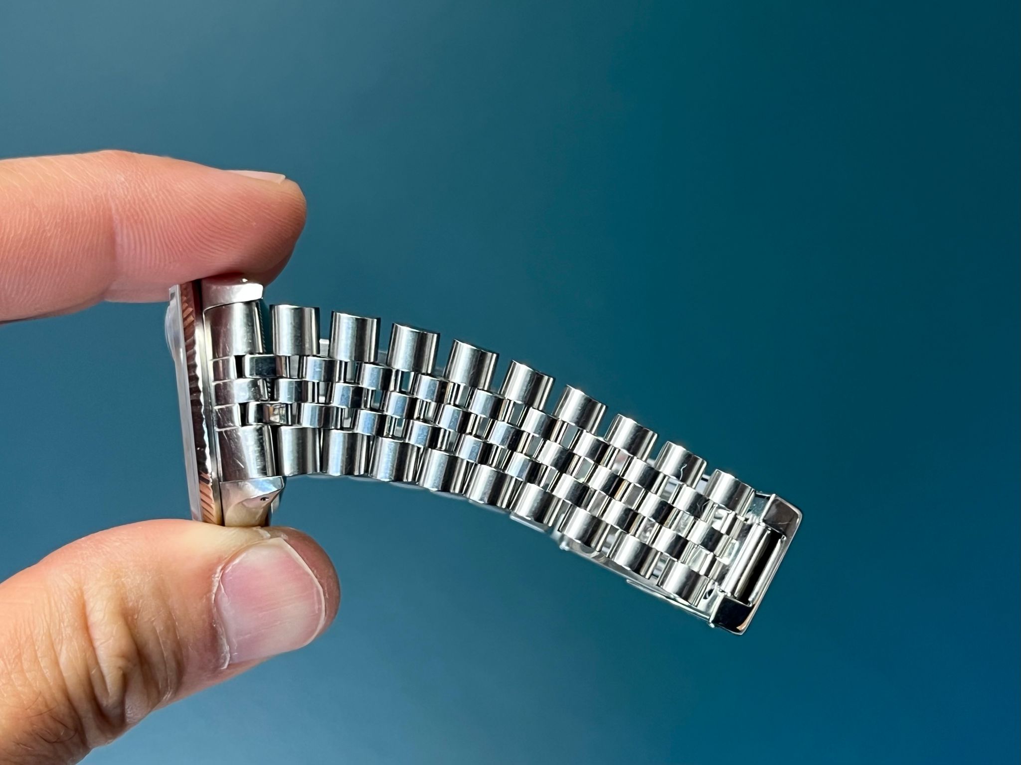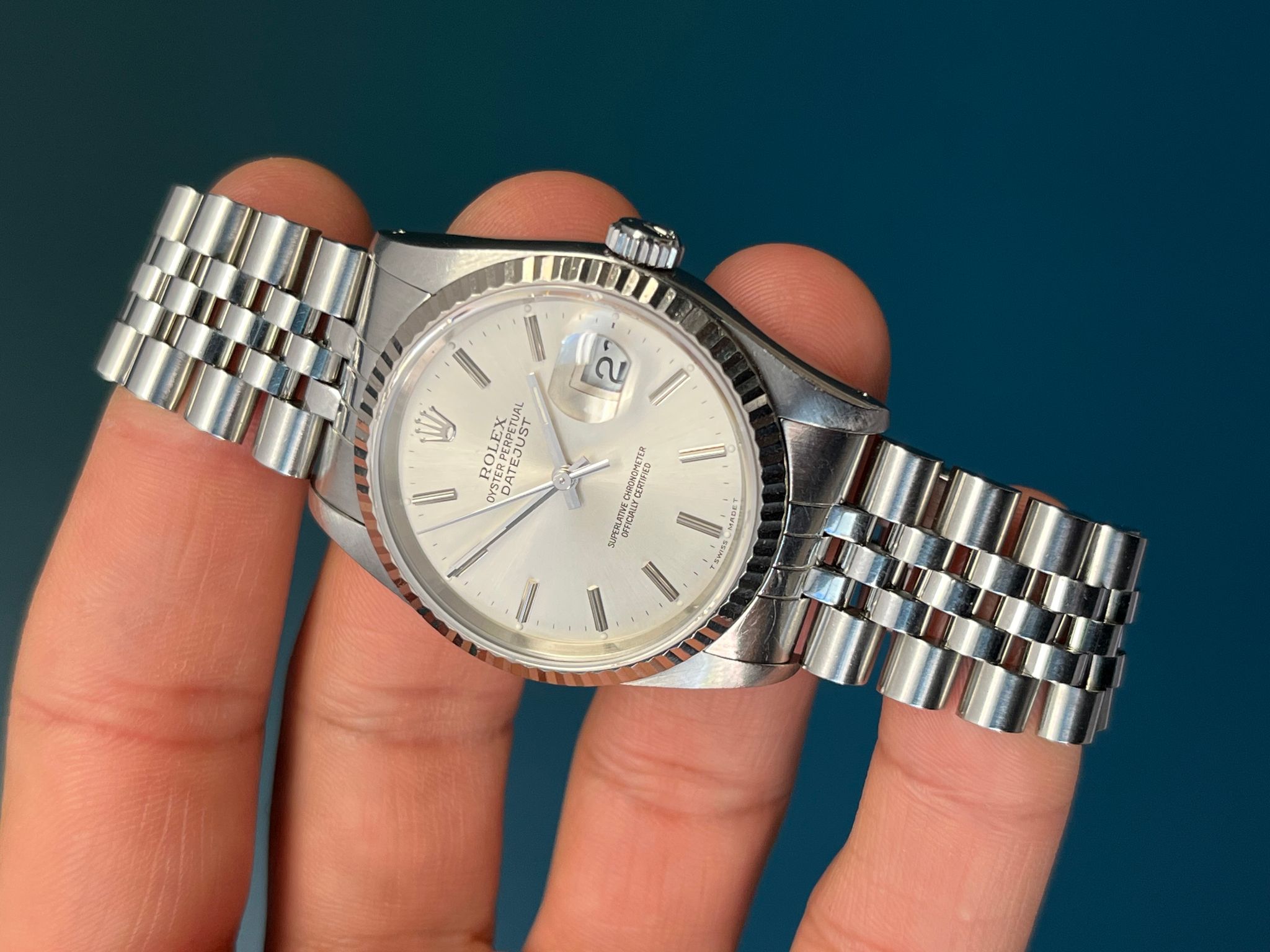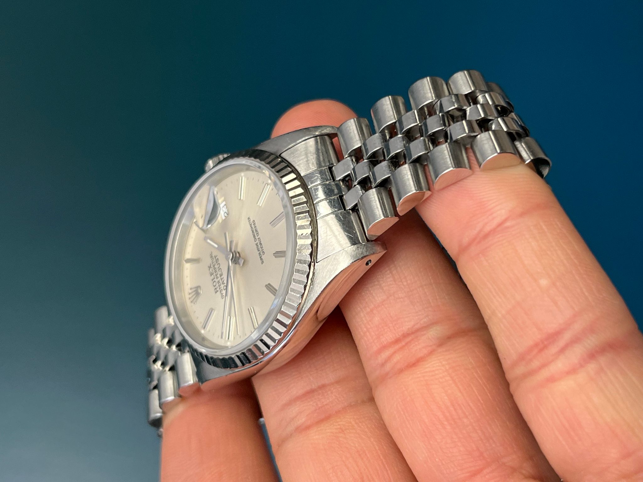 This example is in excellent condition with a sharp holes case with thick lugs. The silver dial is excellent. The jubilee bracelet is long and shows minimal to no stretch. This example is running COSC.