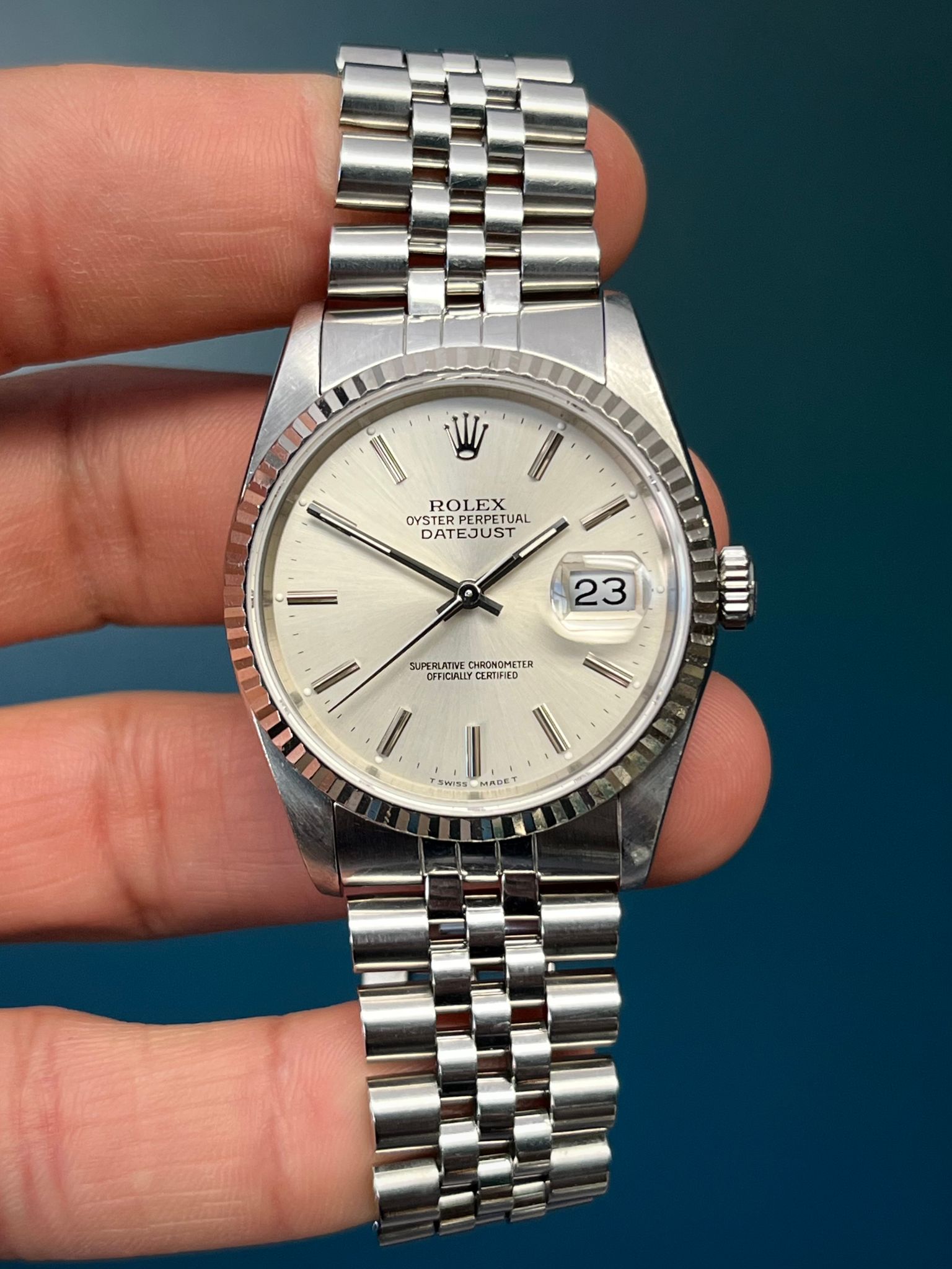 The Rolex Datejust reference 16234 is a timeless and iconic timepiece renowned for its elegant design and precision engineering. With a classic White gold bezel and no holes stainless steel case measuring 36mm in diameter, this watch exudes understated luxury suitable for any occasion. Its silver dial with date window at the 3 o'clock position, enhanced by the iconic Cyclops lens for magnified legibility. Powered by Rolex's reliable self-winding mechanical movement, the Datejust 16234 promises exceptional accuracy and durability. Finished with a stainless steel Jubilee bracelet, this watch epitomizes the perfect balance between sophistication and functionality, making it a cherished companion for all.