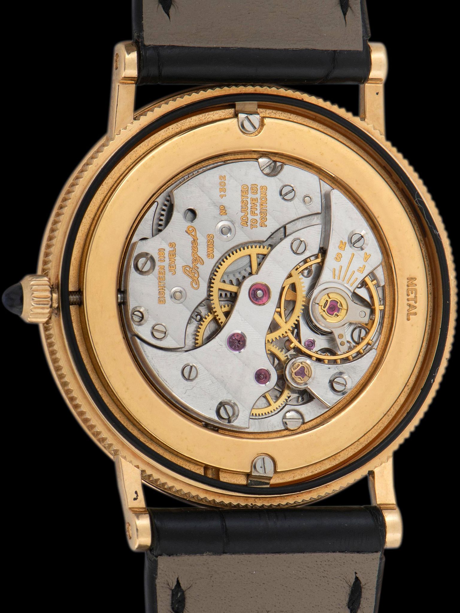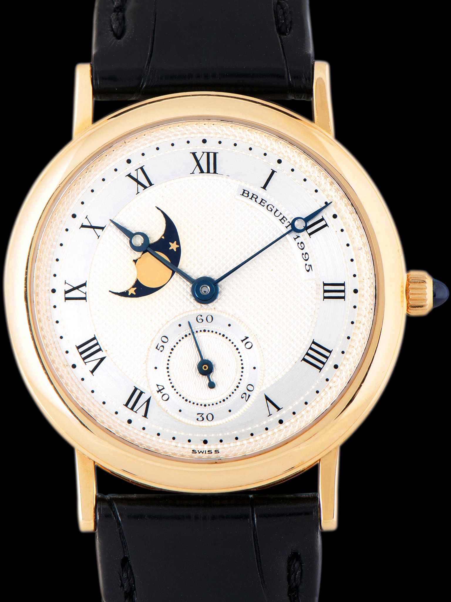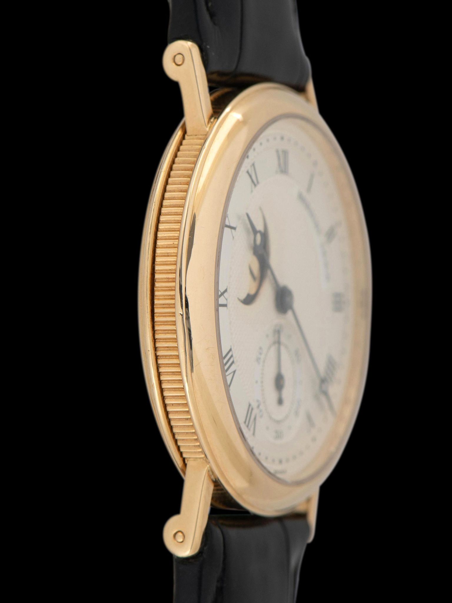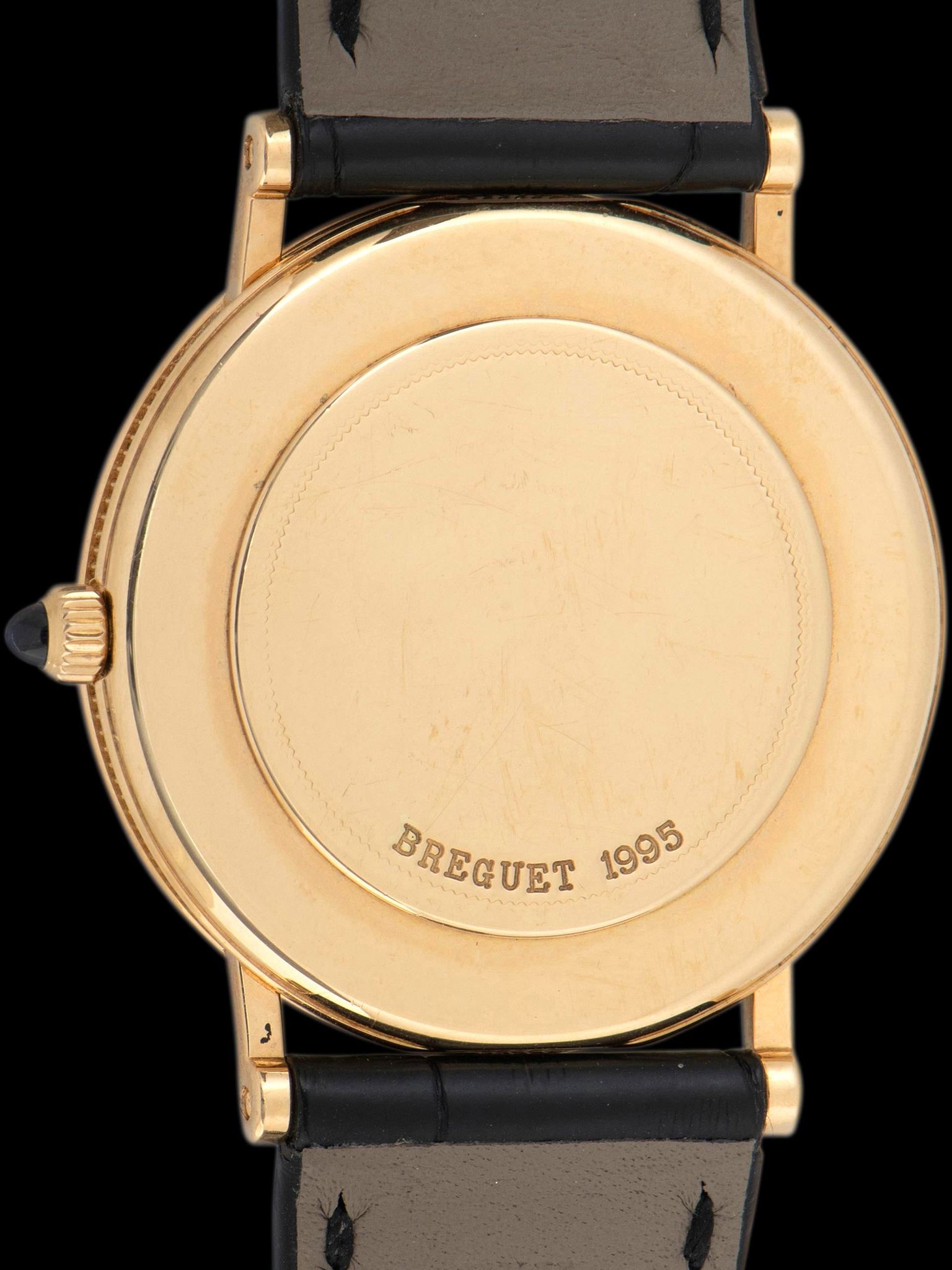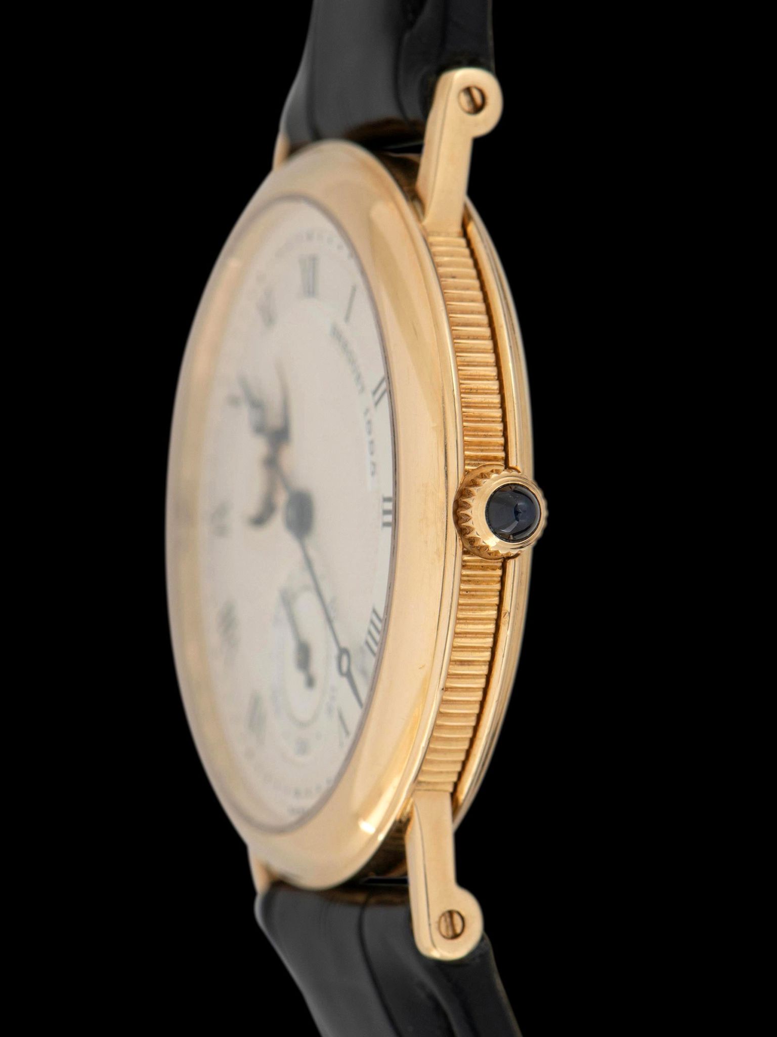 The 18K yellow gold case is in exceptional condition, exhibiting minimal evidence of previous polishing and signs of only gentle use. The sapphire crystal is clean, showing no wear. The case retains its original sapphire cabochon crown. The case back is also in excellent shape showing nominal signs of use. The watch comes supplied on a Breguet 2pc black alligator leather strap with the original 18K yellow gold Breguet deployant clasp.