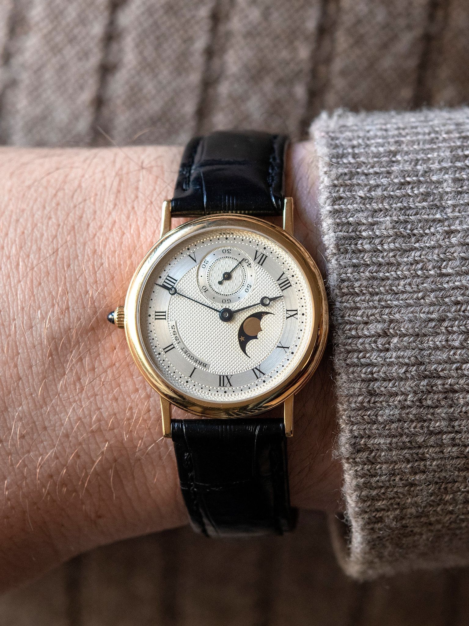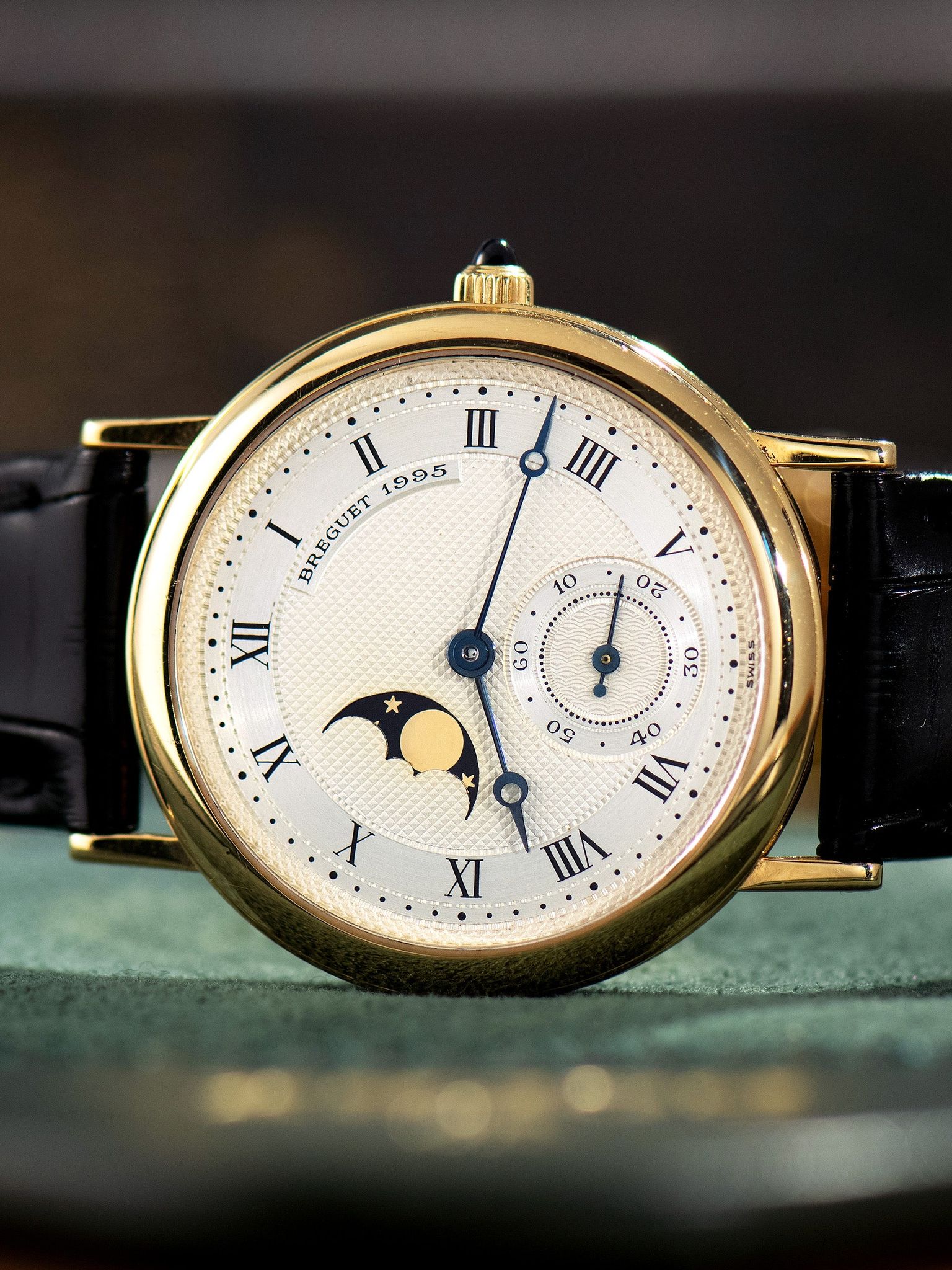 The original and beautifully executed silver guilloche dial is in near-perfect vintage condition, showing no damage with an extremely subtle warmth from age, adding to the vintage appeal of the watch. The original and vibrant blued-steel Breguet-style hands are in perfect condition, and moonphase wheel is also original to the watch and in excellent condition as well.