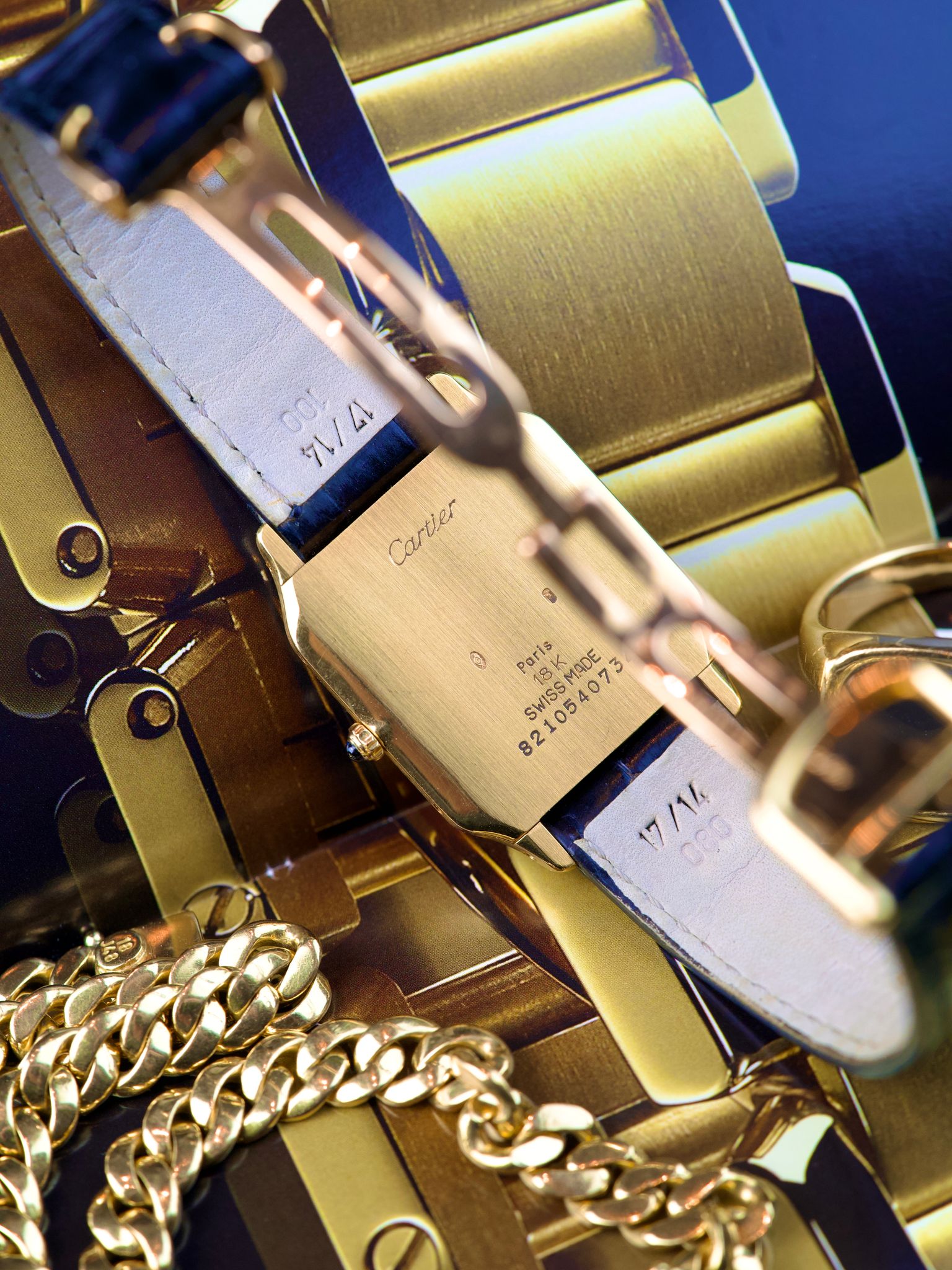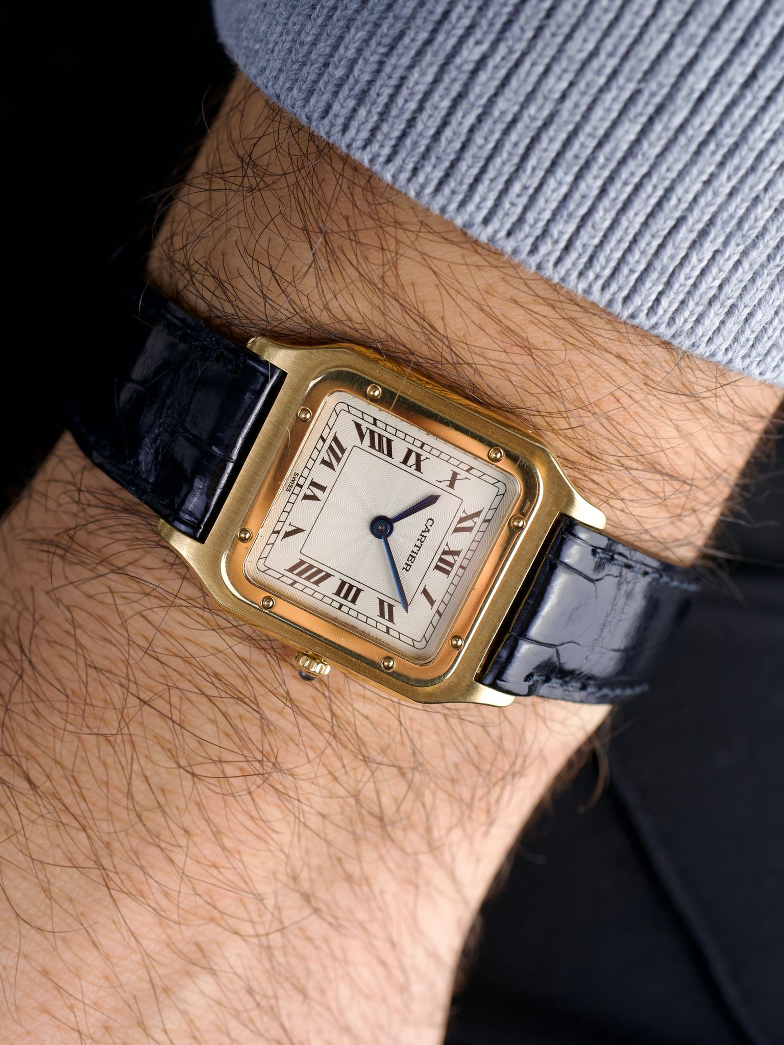 The case itself is made of razor sharp brushed 18 carat yellow gold, 27x36 mm case, while a polished bezel is layered on top. The caseback retains all factory engravings and trademarks in clear and clean condition. The watch comes with the fitted black leather strap as well as the original 18k yellow gold Cartier folding clasp.