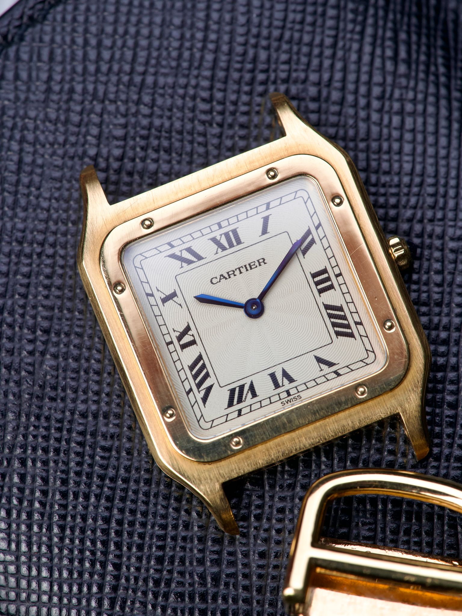 The case itself is made of razor sharp brushed 18 carat yellow gold, 27x36 mm case, while a polished bezel is layered on top. The caseback retains all factory engravings and trademarks in clear and clean condition. The watch comes with the fitted black leather strap as well as the original 18k yellow gold Cartier folding clasp.