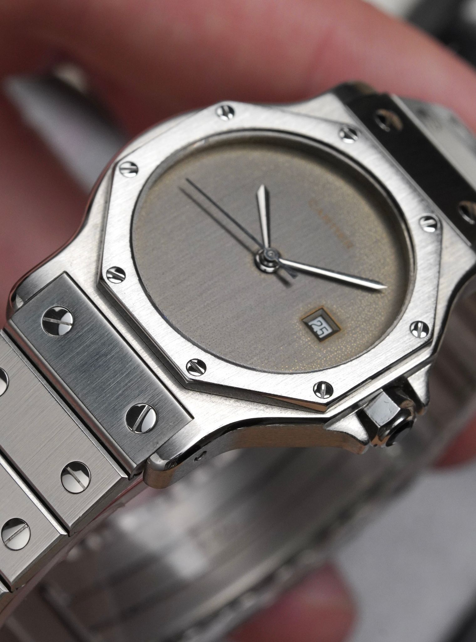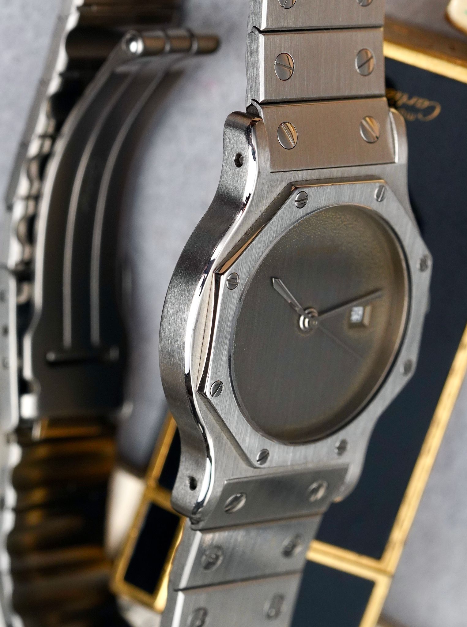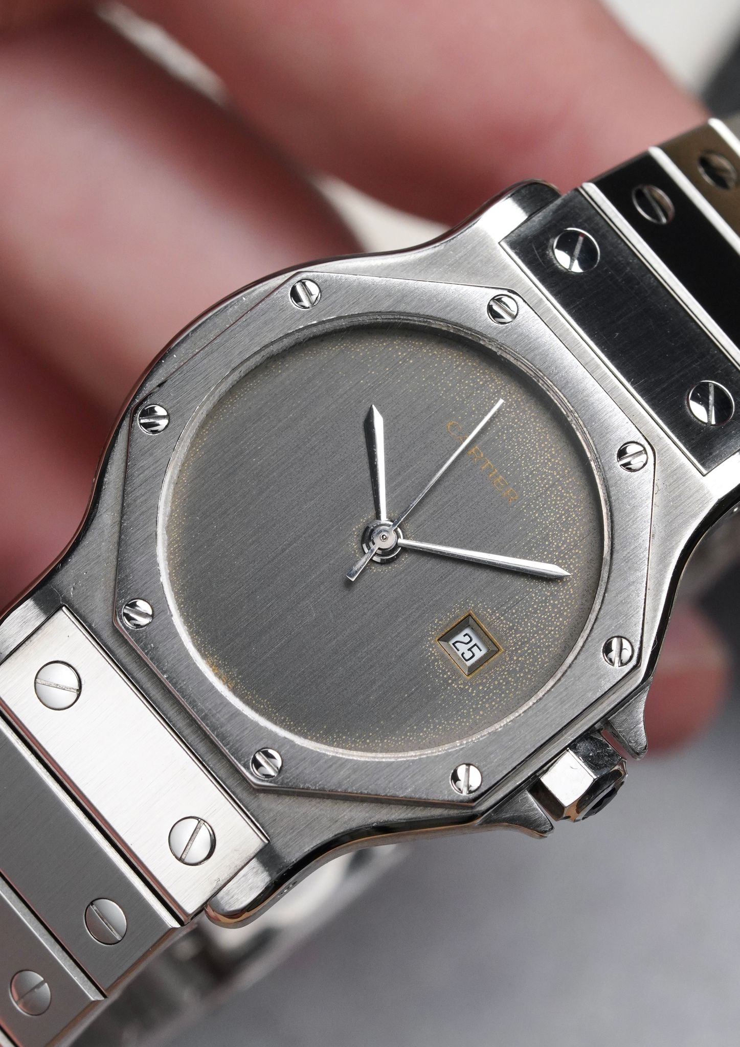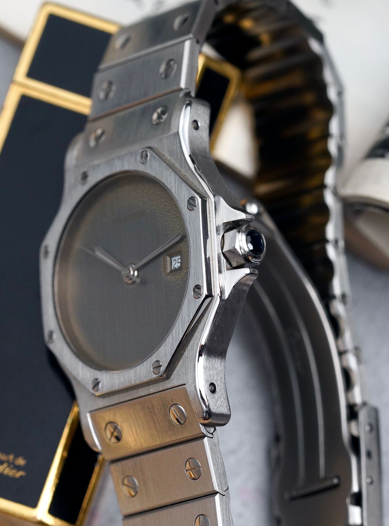A spooky sharp 1990s Cartier Santos "Octagon" ref. 2965 in steel with a rare slate grey dial that has gone ghost, in some lights now you see the Cartier signature and in others you don't, powered by an automatic movement, unpolished and in marvelous condition.