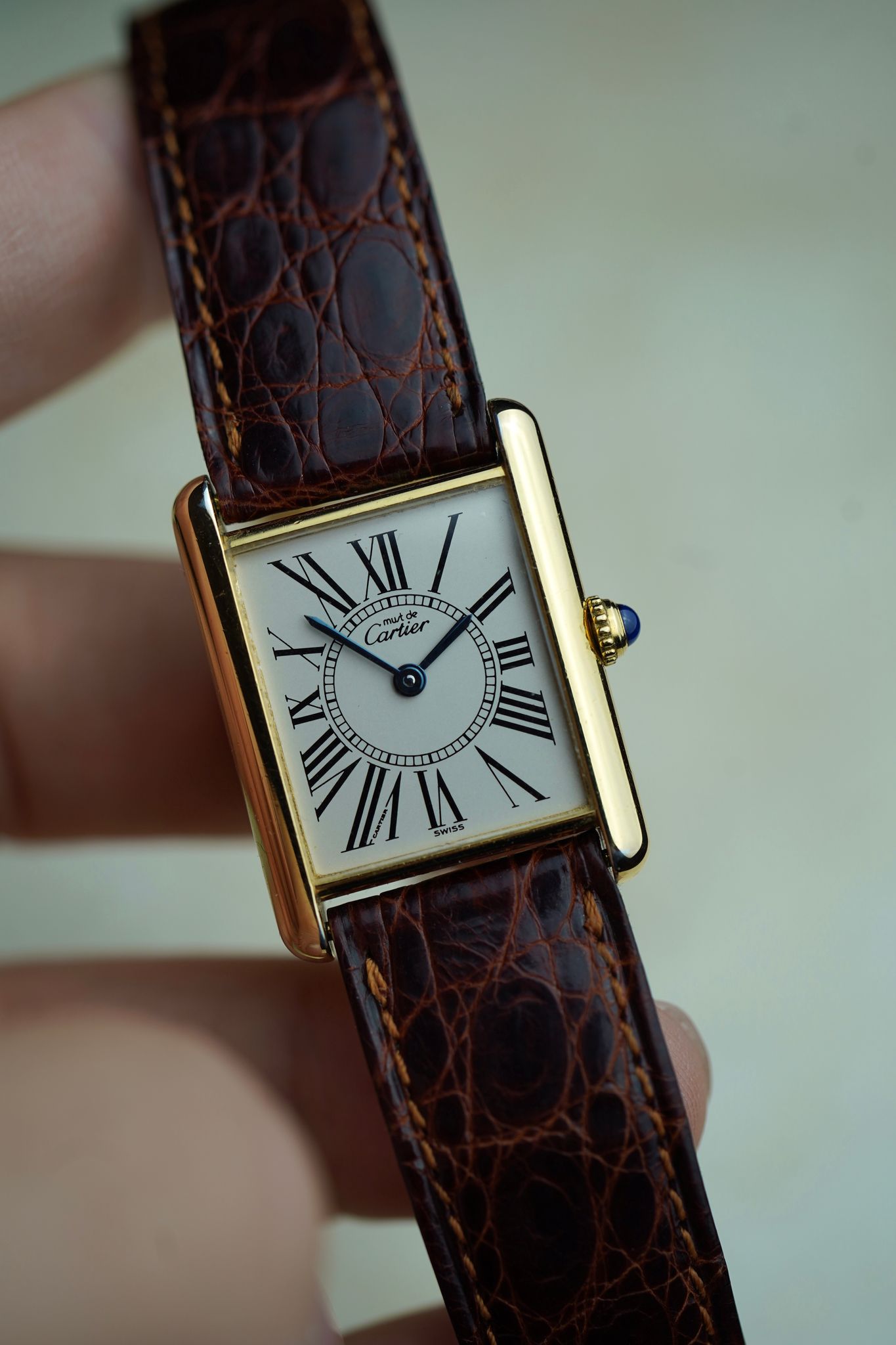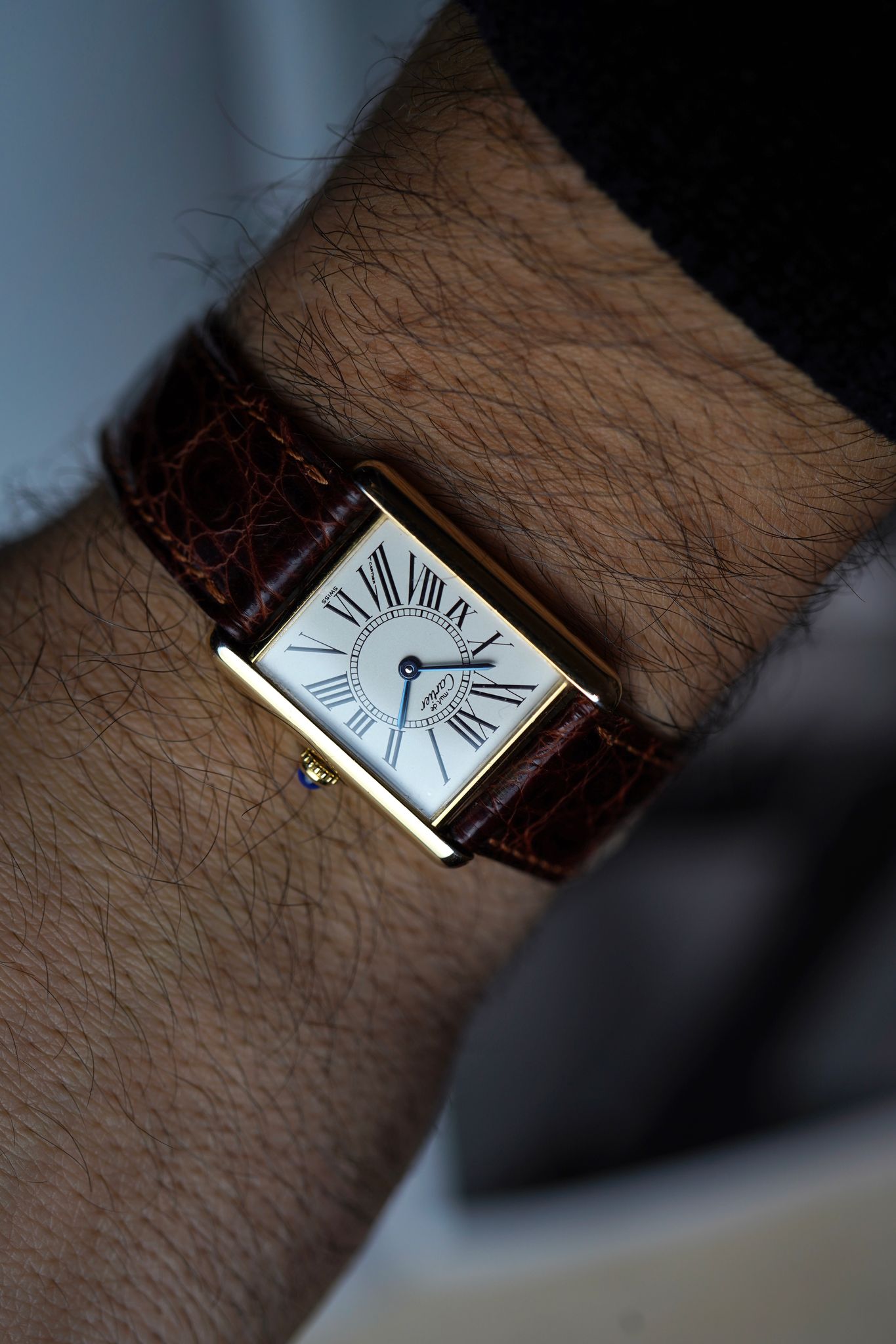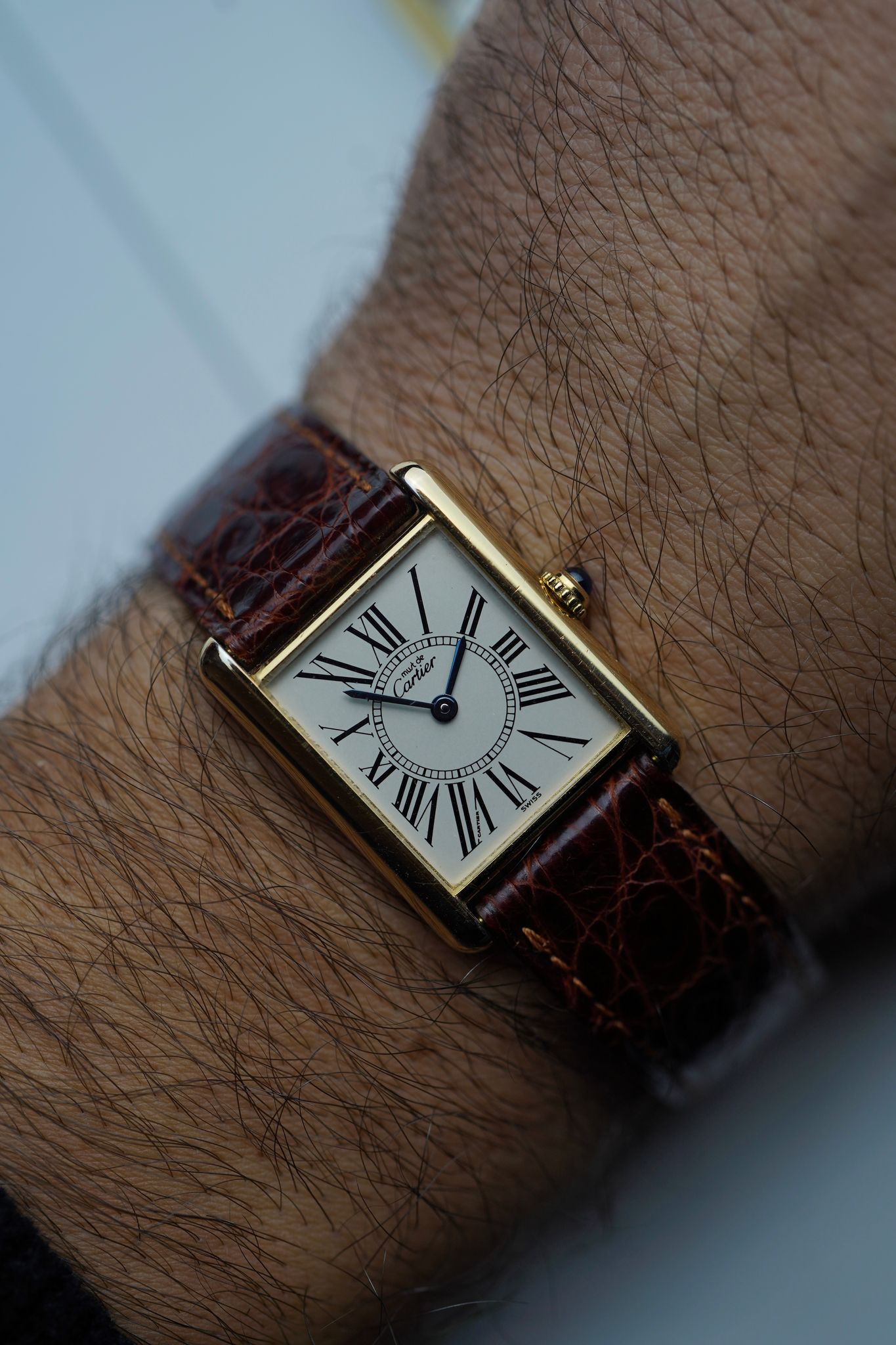This is a very cool and rare Must de Cartier Tank 1615 with the rare Opaline dial, deployment clasp and Cartier strap!