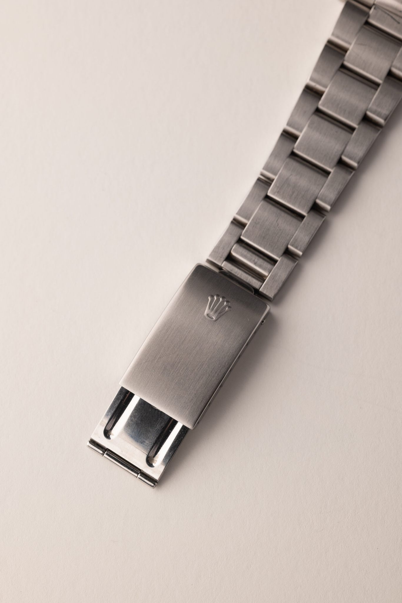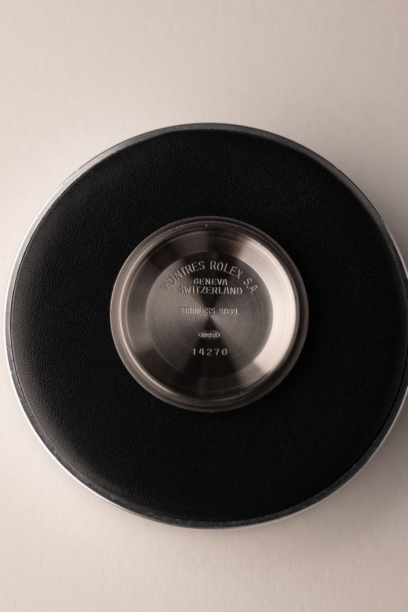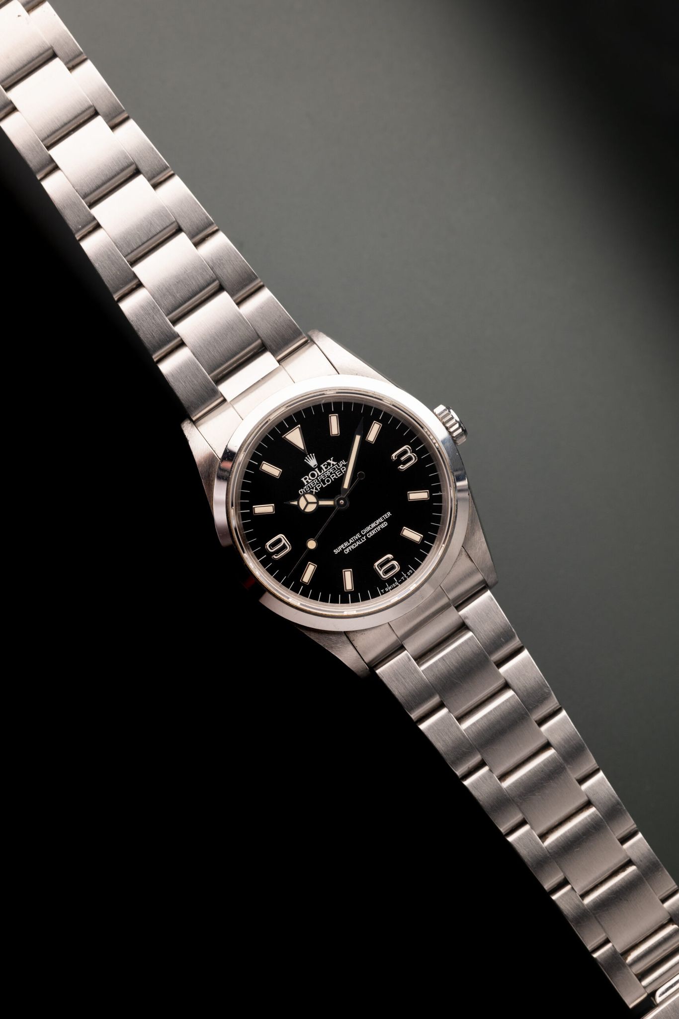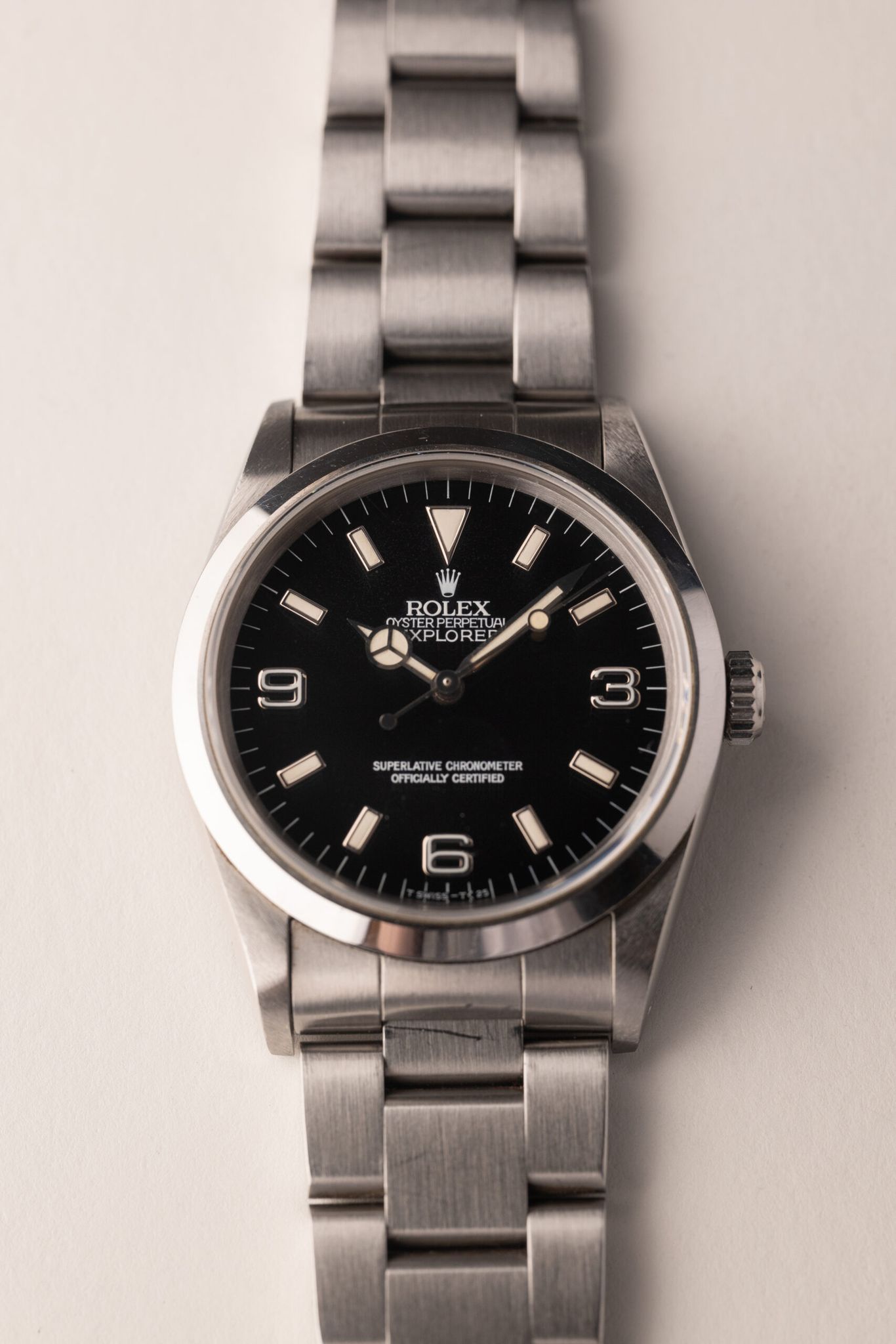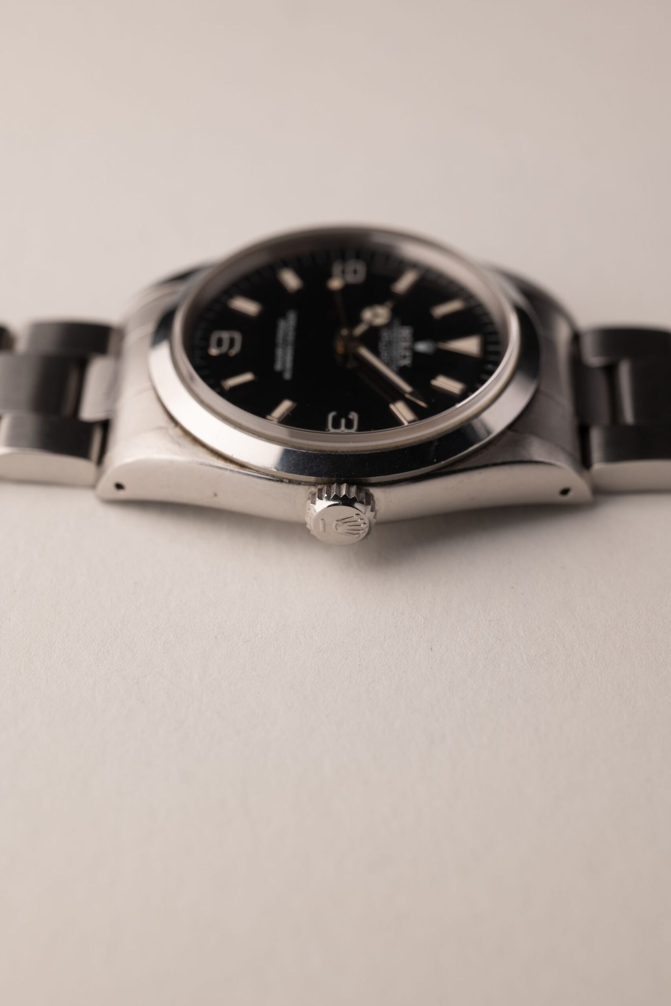 14270 Explorers are an enigma. Though often referred to as a 'Starter Sports Rolex', we are seeing that many of our more seasoned clients find their way back to the simple appeal of the 14270's 36mm case, gloss black 3-6-9 dial, smooth bezel design. This Explorer comes unpolished, case back sticker complete, whose dial lume has taken on a mid-yellow patina appearing only on tritium examples. Booklet included.