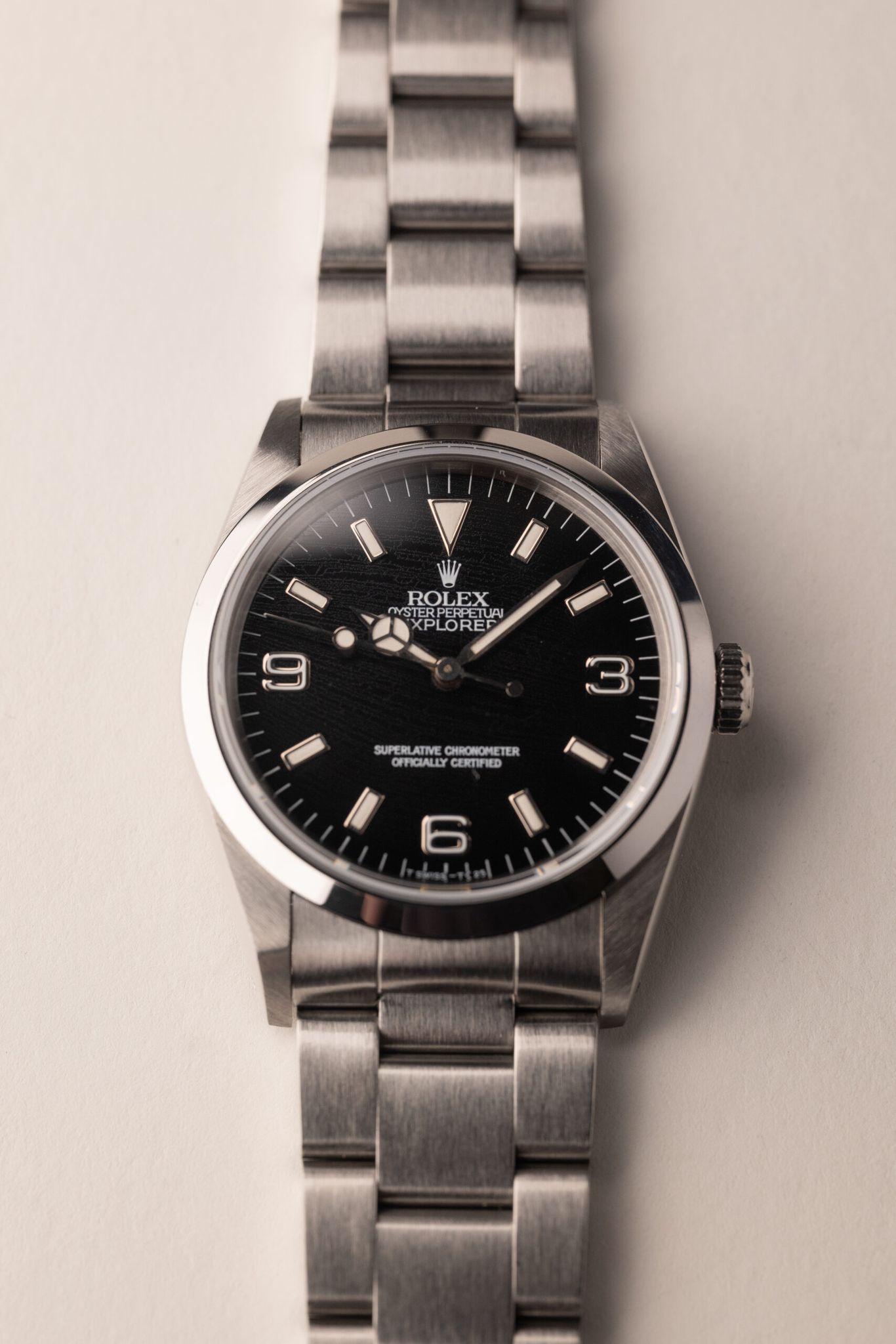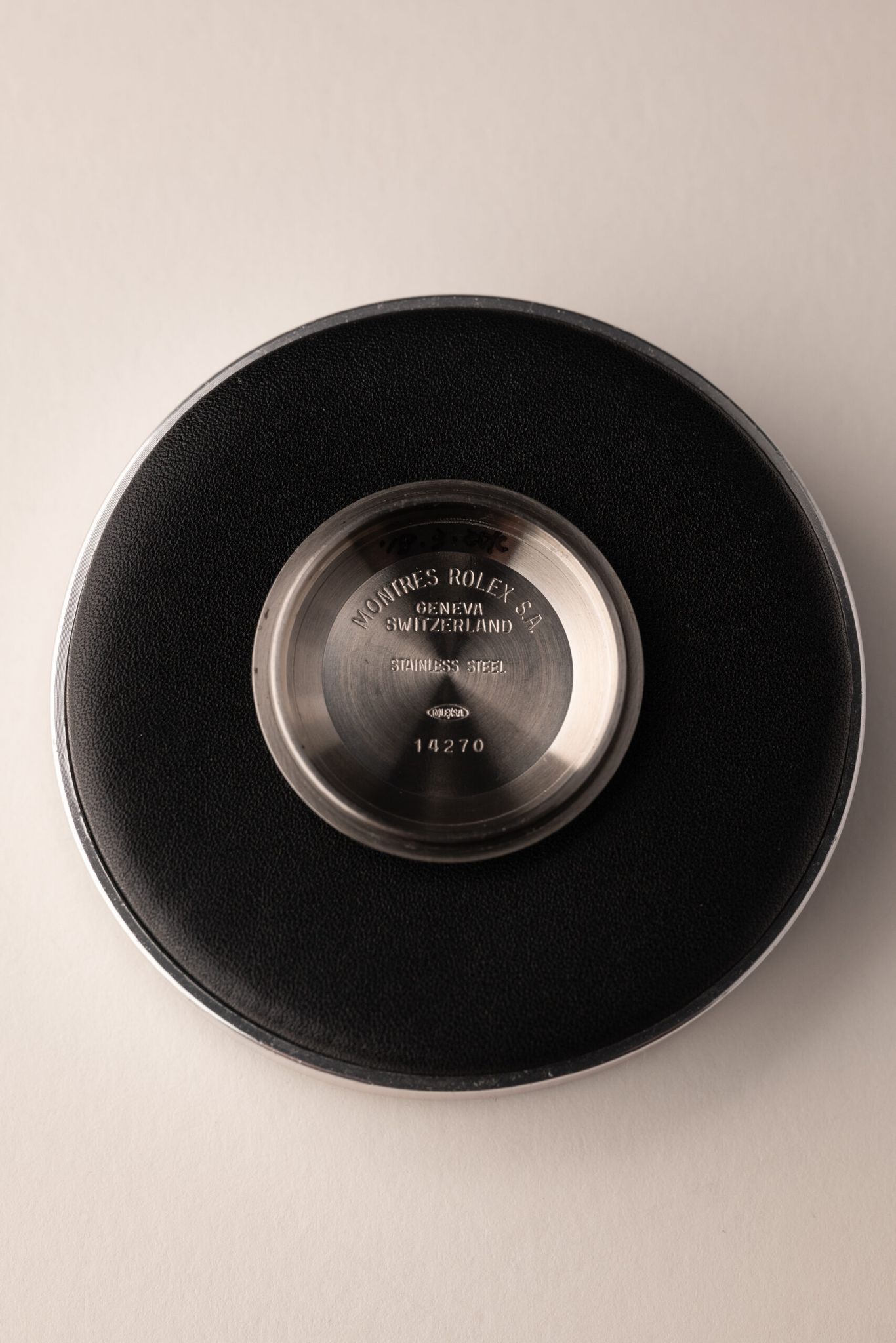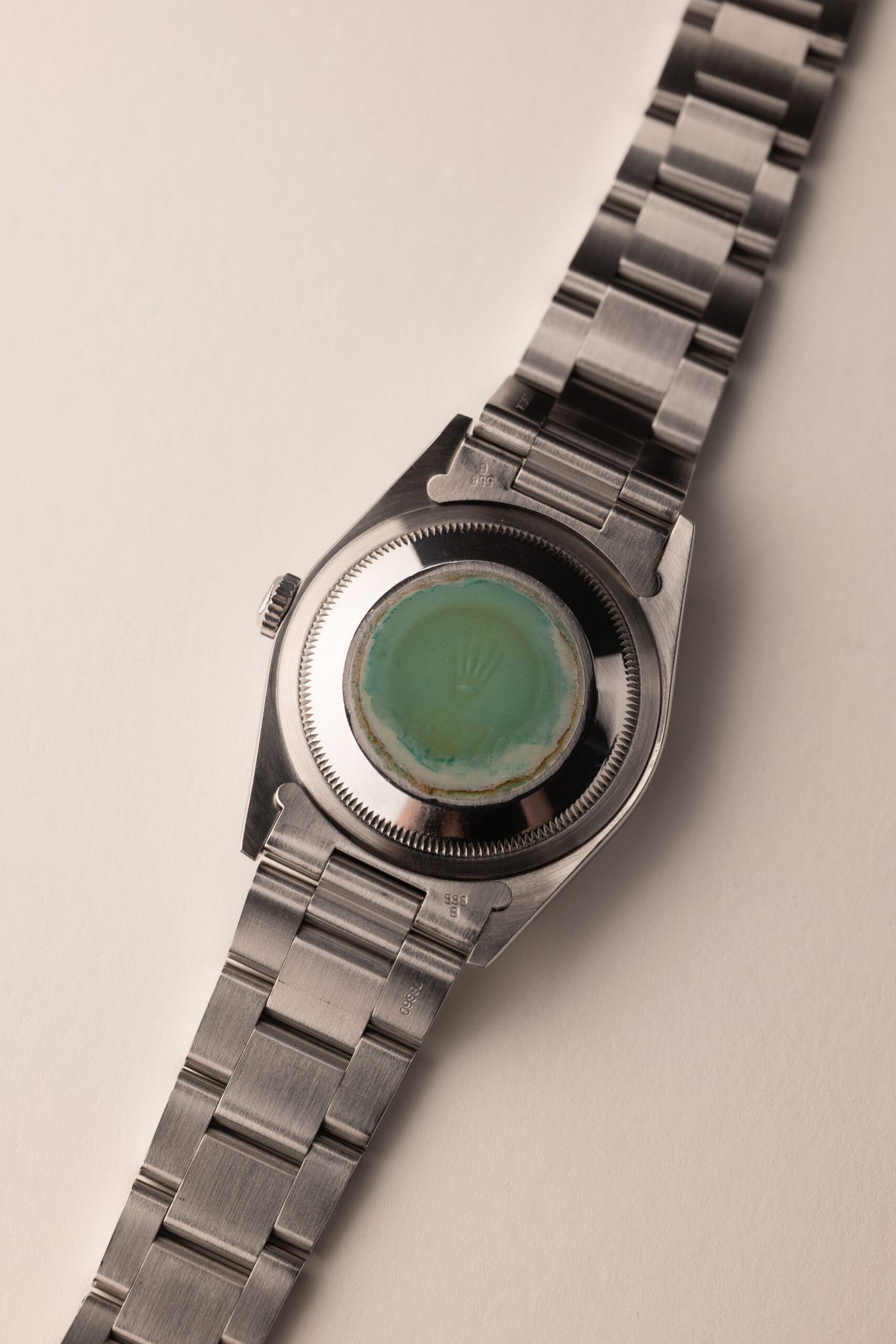 If you’ve been following our page, you’ll notice patterns develop across Rolex from certain years. 1991 was an aberrant as the marquee experienced an experimental lume transition from the late 80’s into to 91 seen in the drastic dial and lume color variations. On this Explorer, the tritium developed a frosted patina across the dial face giving it a topographical appearance. Case comes excellent with original sticker., lume churned soft yellow.