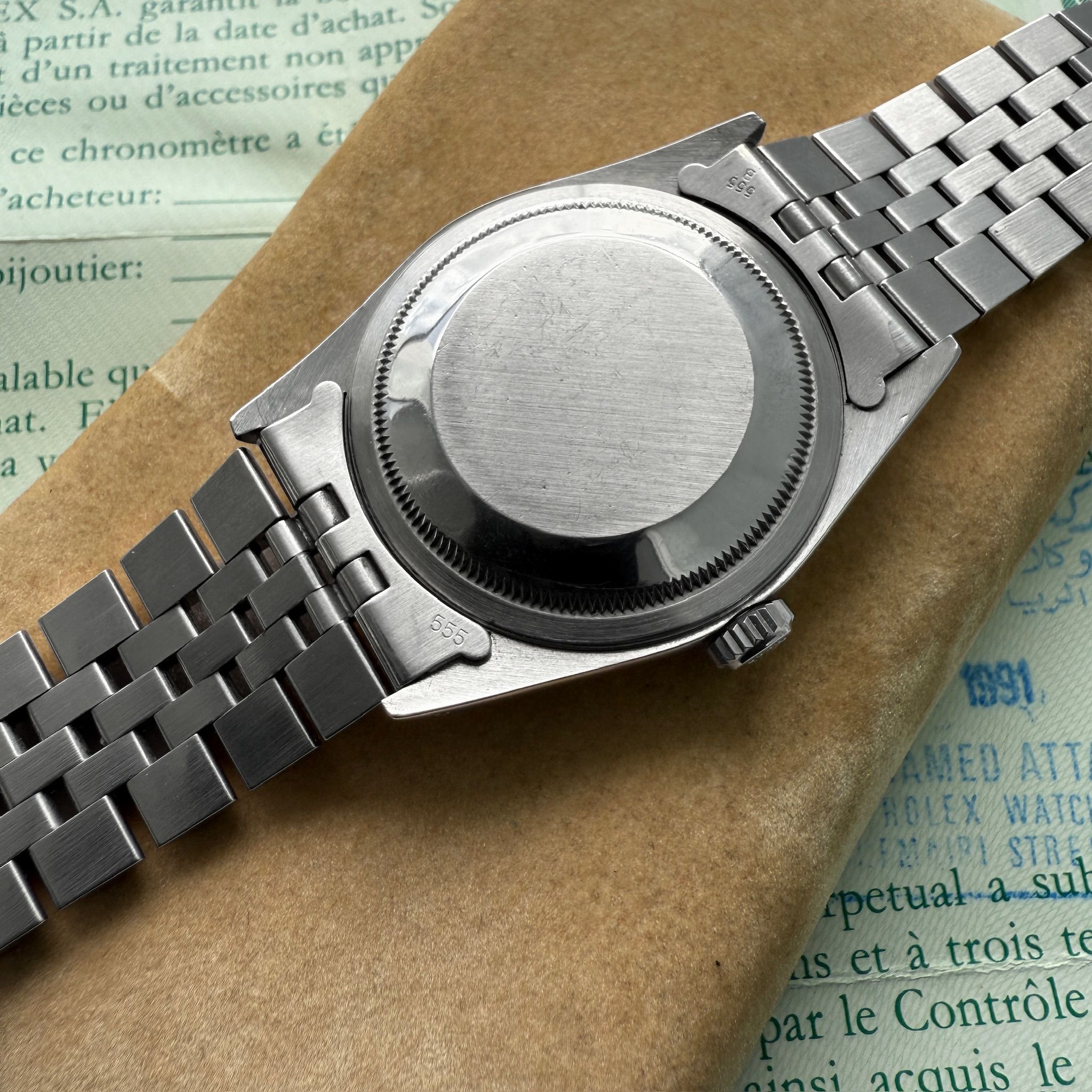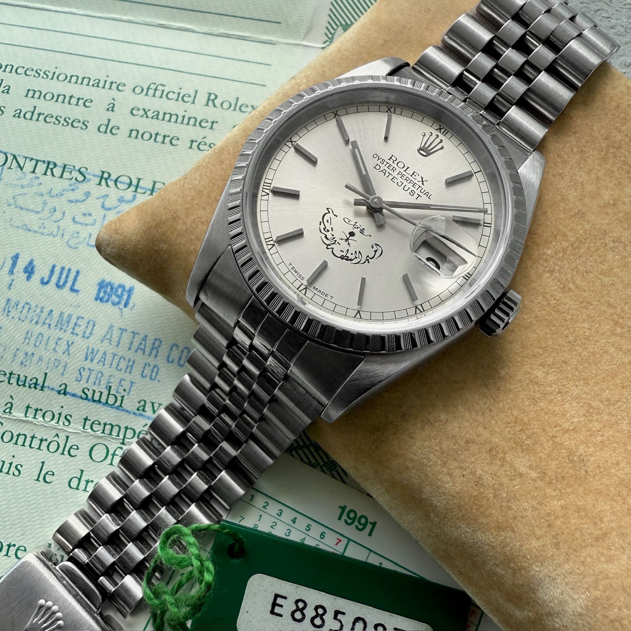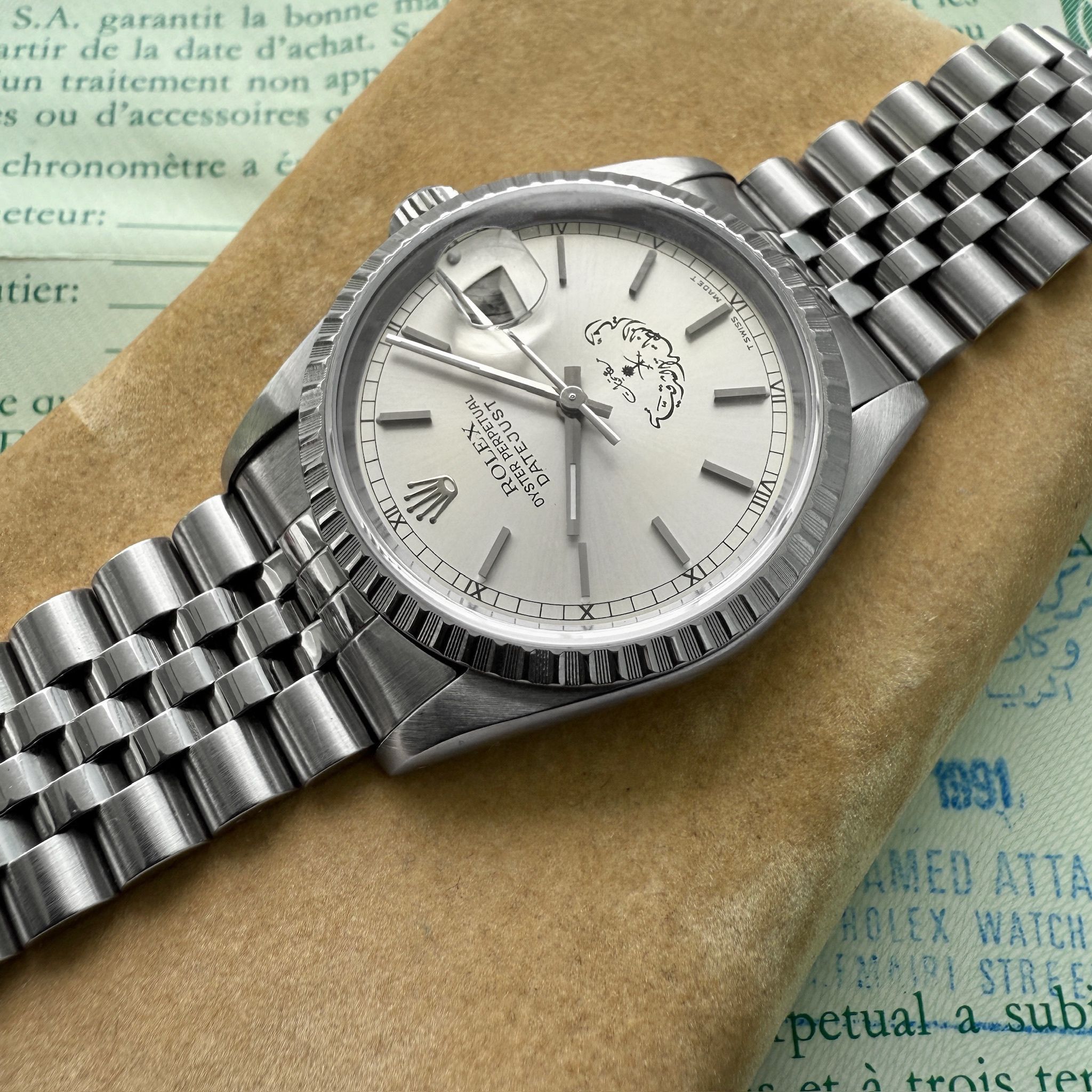 Available for sale is a 1990 Rolex Datejust crafted of solid stainless steel. This watch comes with the original box and papers. The papers are punched with the serial number of the watch though not named, which does make sense as Saudia Arabia would commission Rolex watches and give them to officials, diplomats and dignitaries. These examples do not seem to surface with original papers. A true collector’s set!