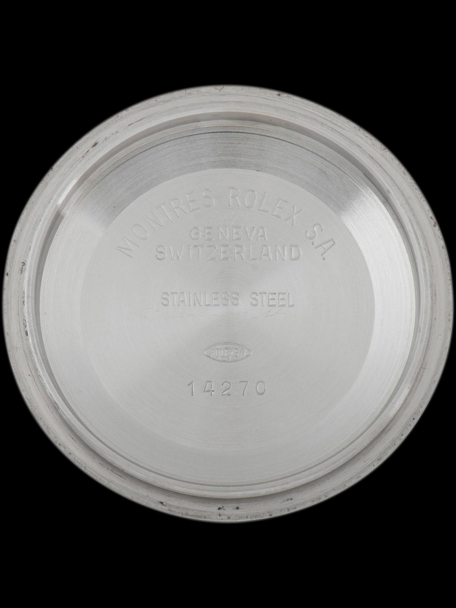 The Rolex Explorer I references bridges the gap between a dress watch and a sports watch. Without the crown guards and rotating bezels commonly found on sports models offered by Rolex, the Explorer I has a cleaner, sleeker profile while incorporating recognizable sports model features into the dial. The highly visible block indices, numerals at the 3 o'clock, 6 o'clock, and 9 o'clock positions, and Submariner style triangle at the 12 o'clock position allow for readability under any conditions. The Submariner-style hands featured on the ref. 14270 adds to the unique feel and appearance. The Rolex Explorer blends the classic and timeless look of a 36mm Rolex Oyster style watch while offering a ruggedness and utilitarian feel that can be worn in the most formal and or casual settings.