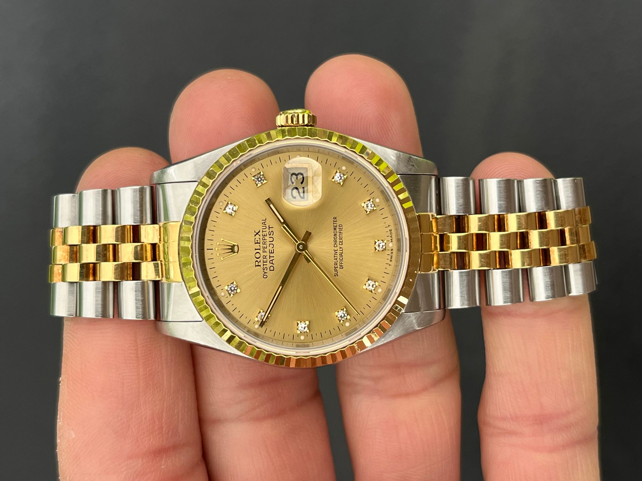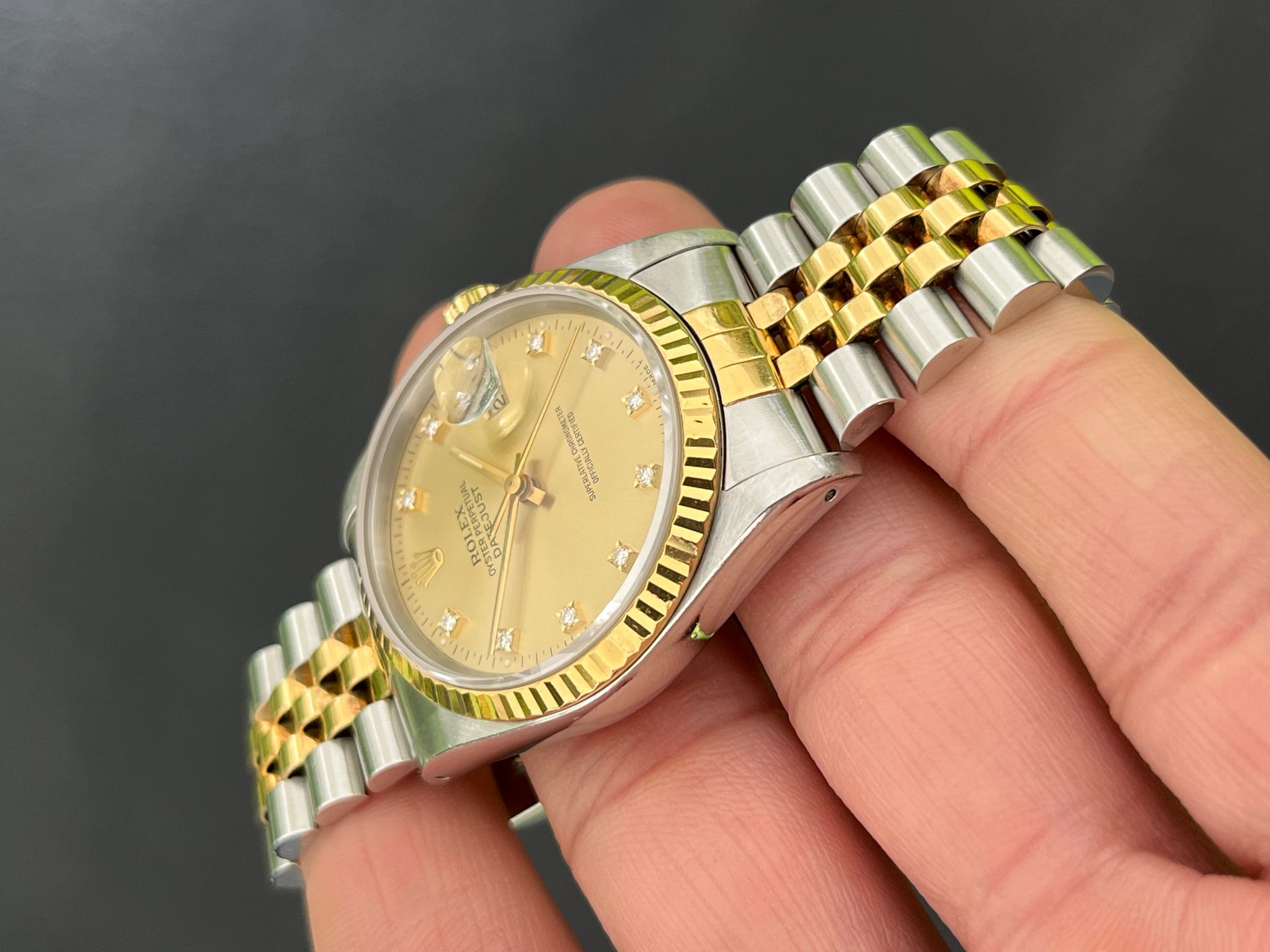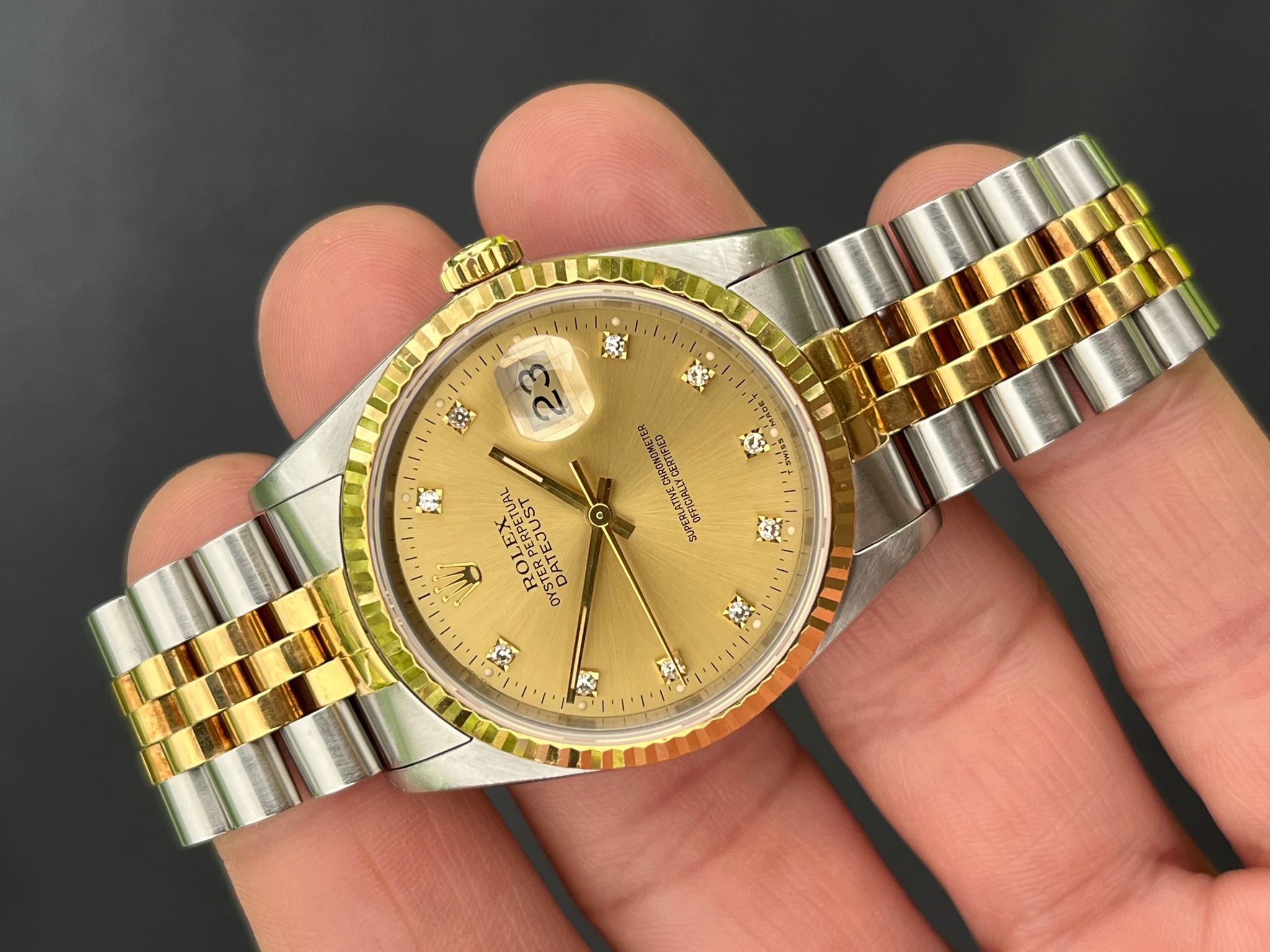 The Rolex Datejust Ref. 16233G is a timeless and elegant timepiece that epitomizes luxury and sophistication. This iconic wristwatch features a striking factory diamond Dial, which adds a touch of opulence and refinement to its classic design. The dial is adorned with meticulously placed diamond hour markers that glisten and catch the light, exuding a sense of prestige. Encased in a beautifully polished stainless steel and 18k yellow gold combination, the watch seamlessly combines durability and style. With its signature Cyclops date magnification window and self-winding movement, the Rolex Datejust Ref. 16233G is not only a symbol of horological excellence but also a statement of timeless elegance for those who appreciate the finer things in life.