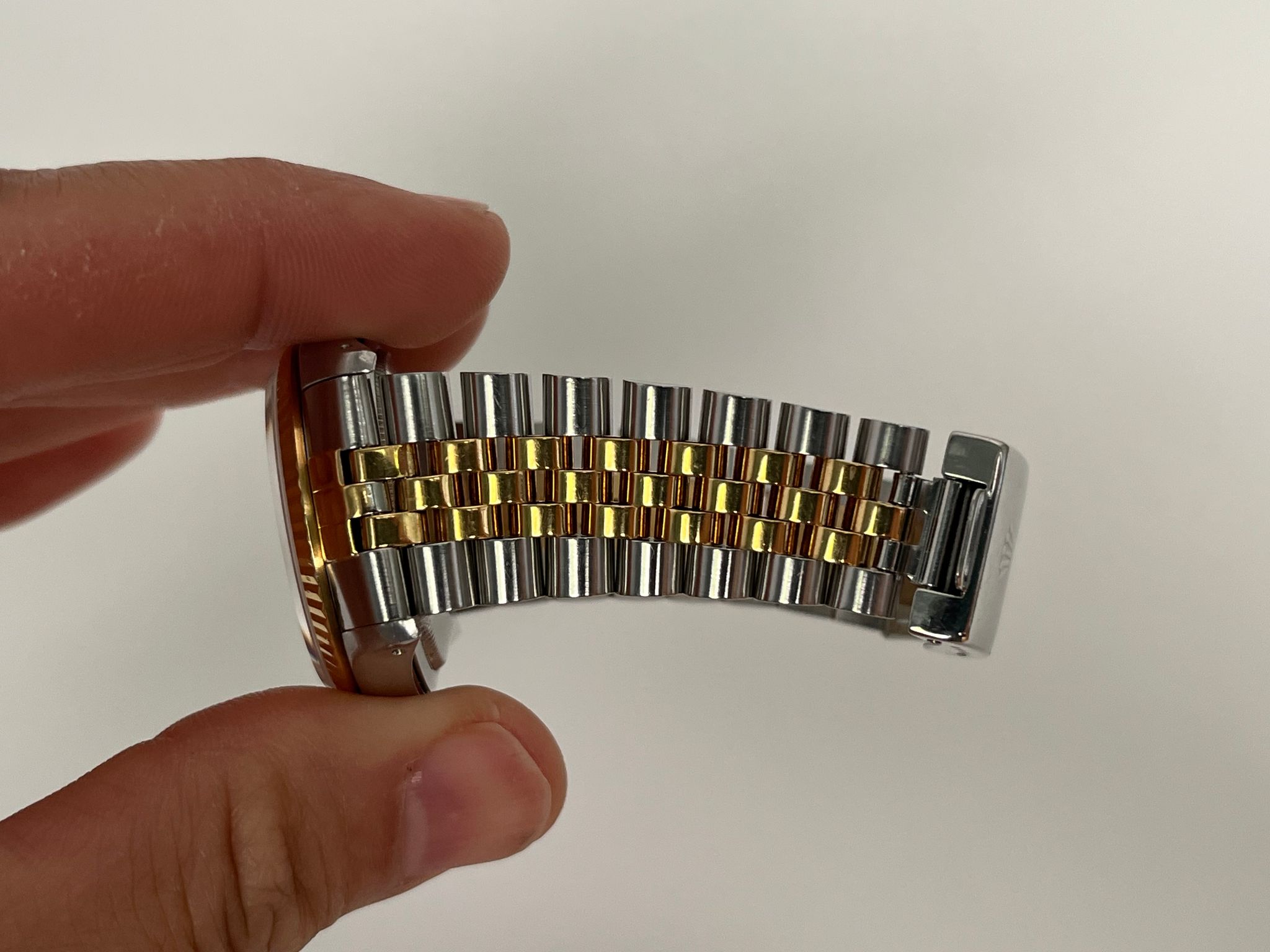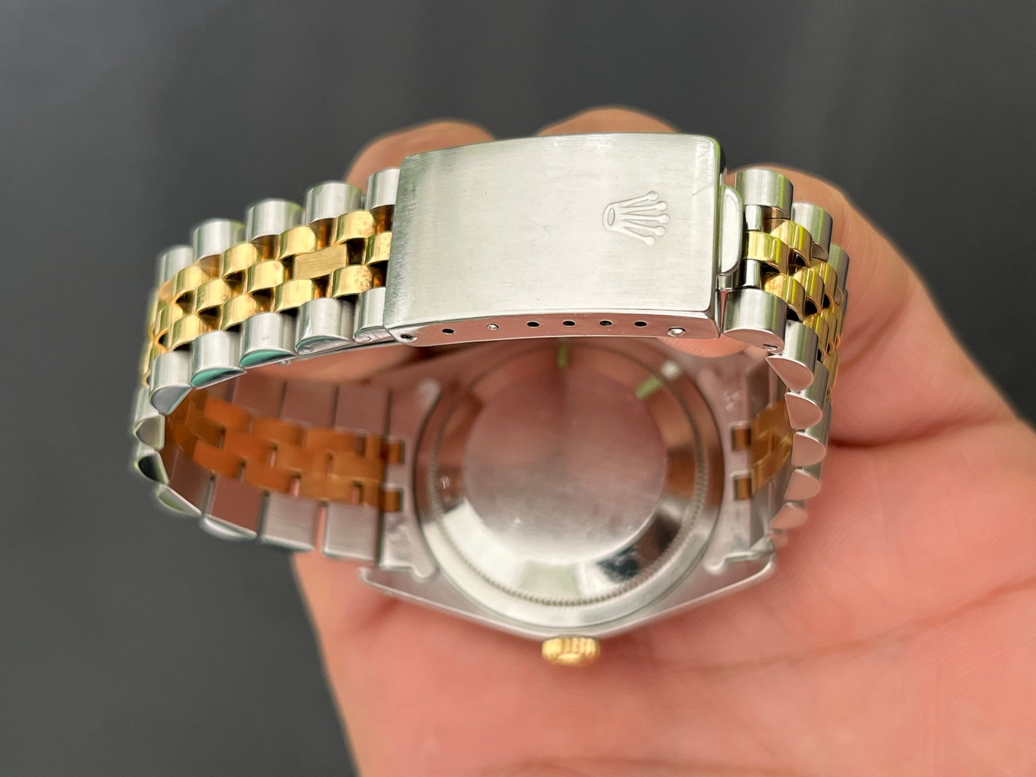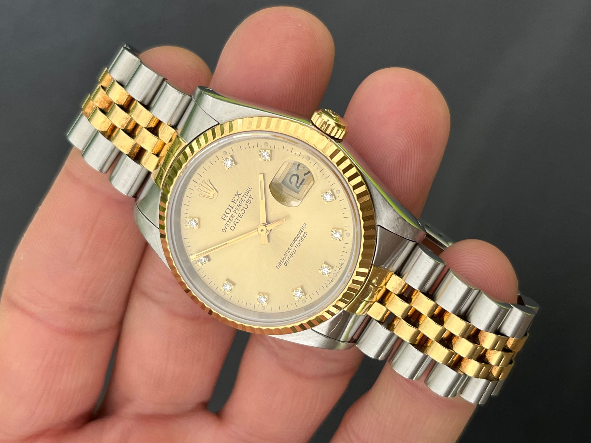 The Rolex Datejust Ref. 16233G is a timeless and elegant timepiece that epitomizes luxury and sophistication. This iconic wristwatch features a striking factory diamond Dial, which adds a touch of opulence and refinement to its classic design. The dial is adorned with meticulously placed diamond hour markers that glisten and catch the light, exuding a sense of prestige. Encased in a beautifully polished stainless steel and 18k yellow gold combination, the watch seamlessly combines durability and style. With its signature Cyclops date magnification window and self-winding movement, the Rolex Datejust Ref. 16233G is not only a symbol of horological excellence but also a statement of timeless elegance for those who appreciate the finer things in life.