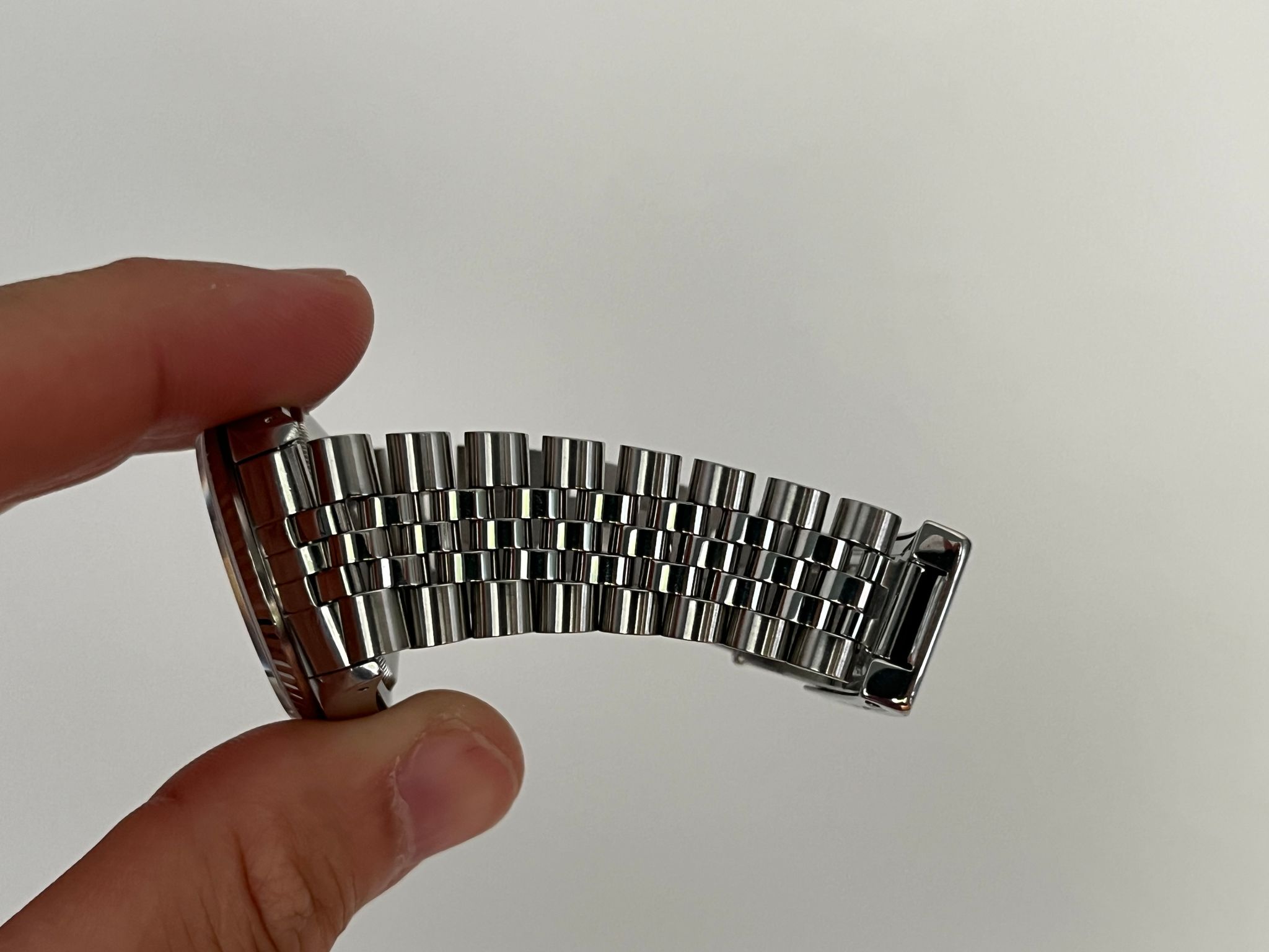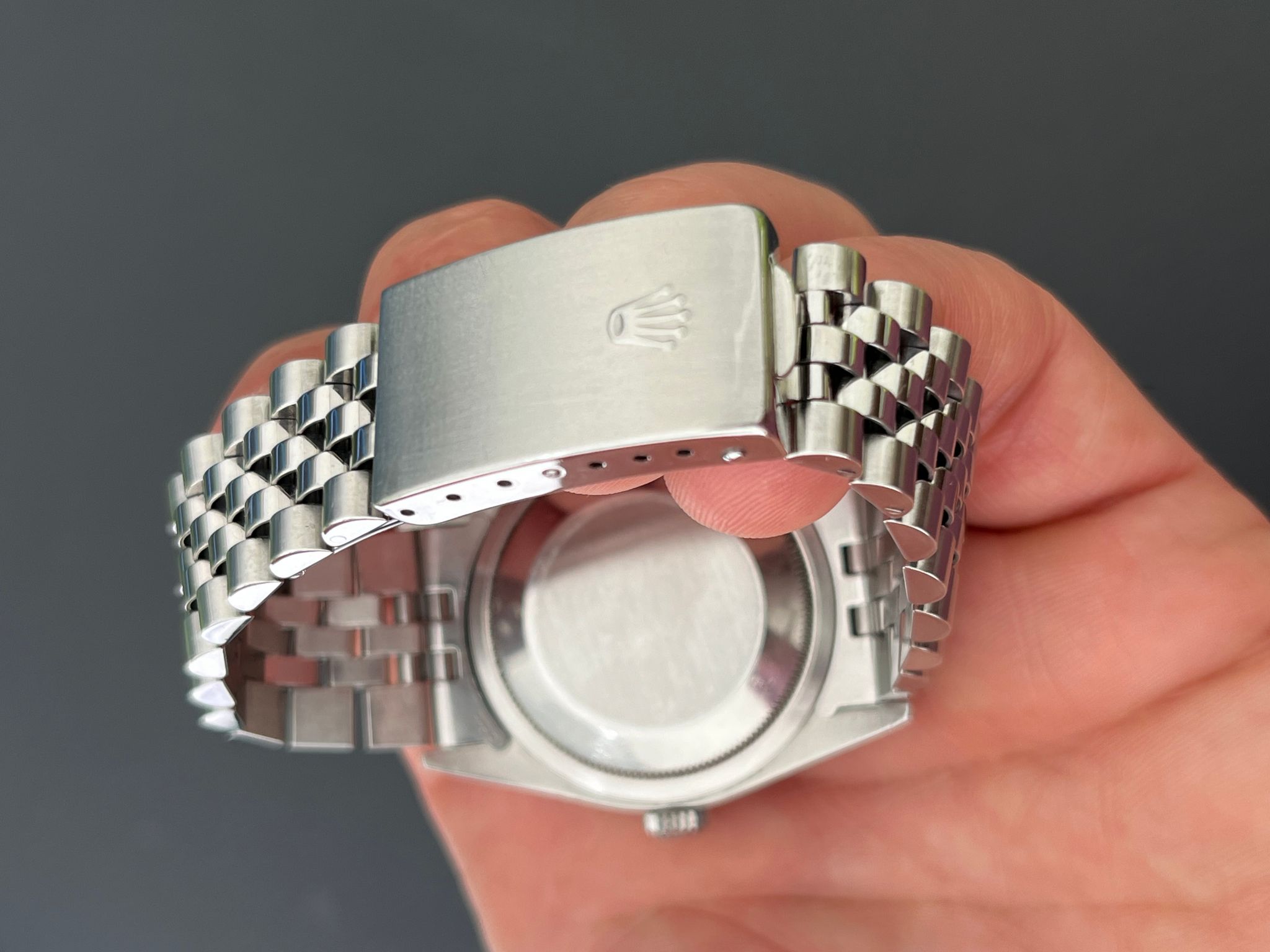 This example is in excellent condition with a sharp no-holes case with thick lugs. The White Porcelain Roman Dial is excellent showing no wear, and presents all of its hr plots. The jubilee bracelet is long and shows minimal to no stretch. This example is running COSC and has an excellent aesthetic appearance.