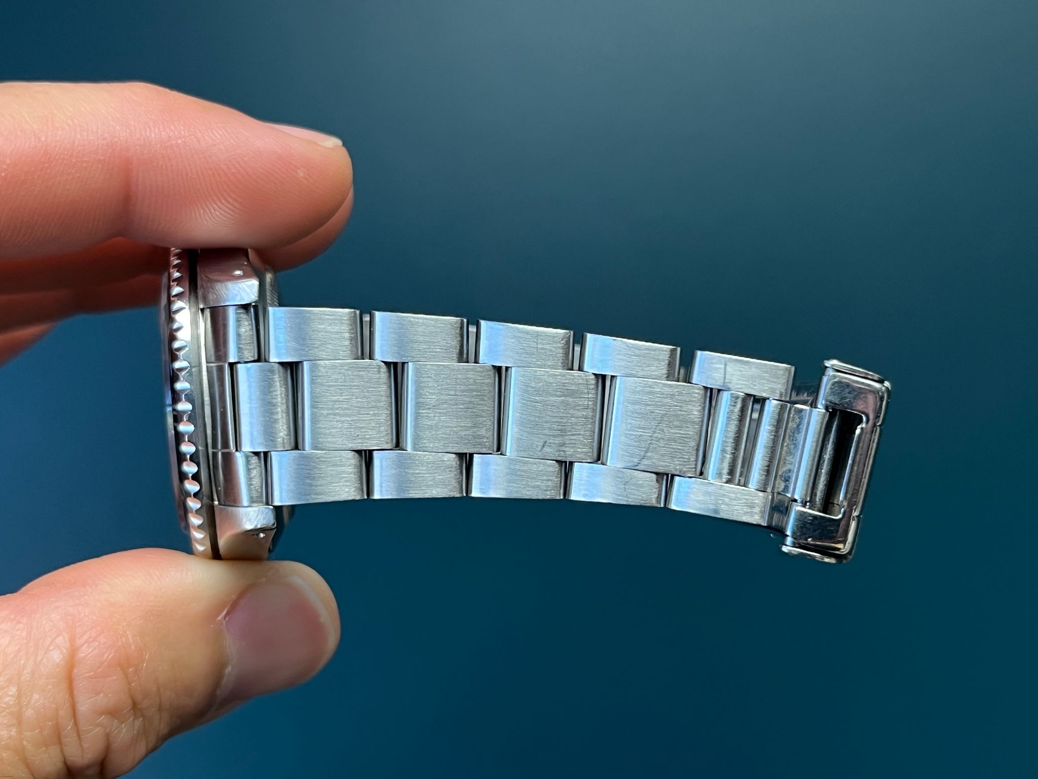 Today we bring you a beautiful Submariner reference 16610 with patina and a great look. This example has a sharp case. The insert, dial and Saphire crystal are in nice condition. The dial and hands show nice warm all matching cream patina. The solid link oyster bracelet has 12 total links plus dive extension and shows no stretch. This example is running COSC and keeping time.