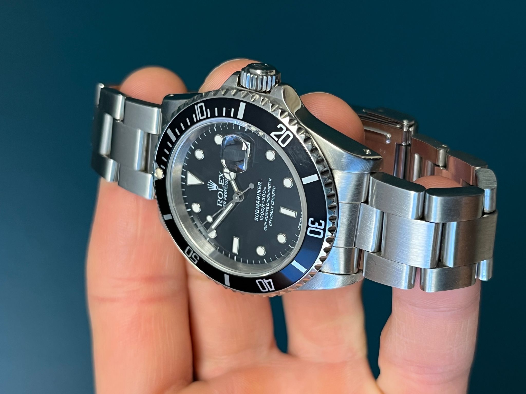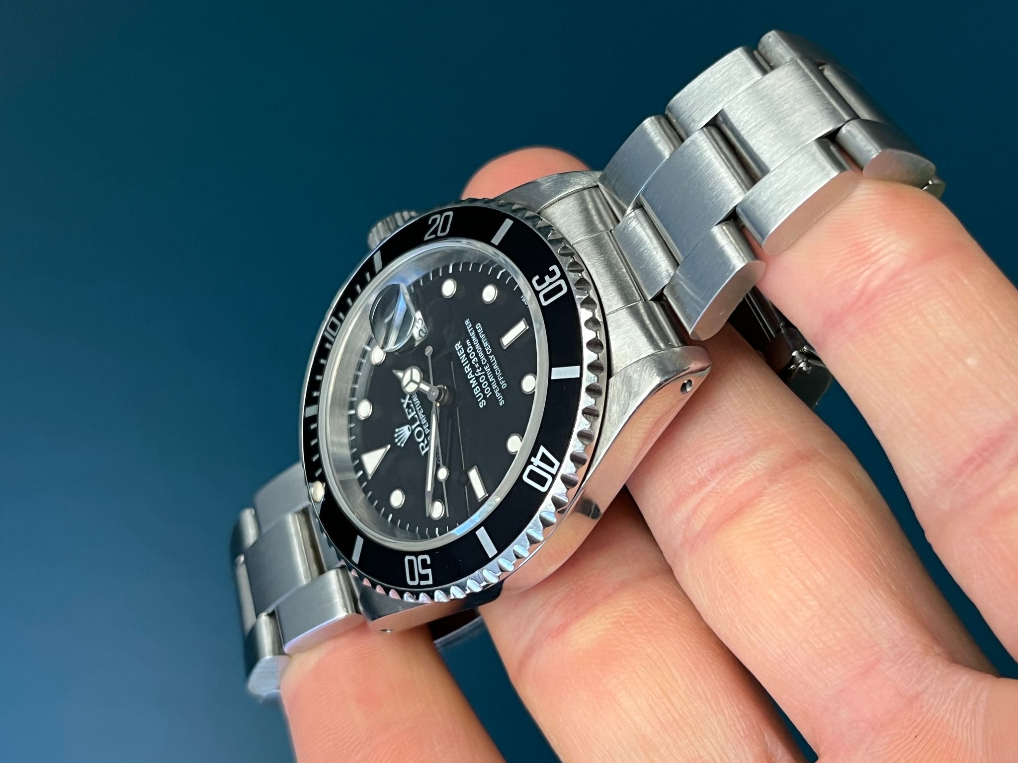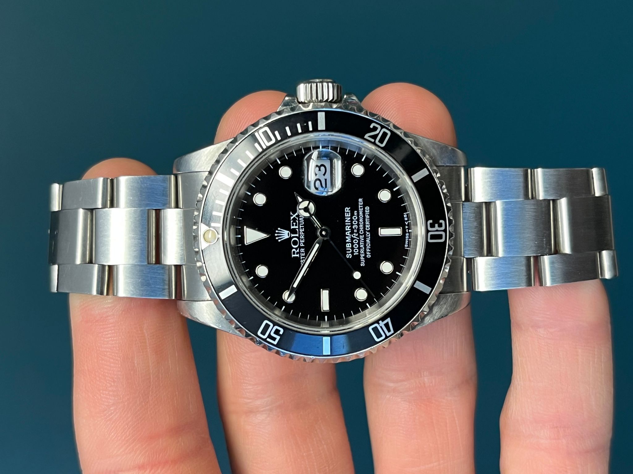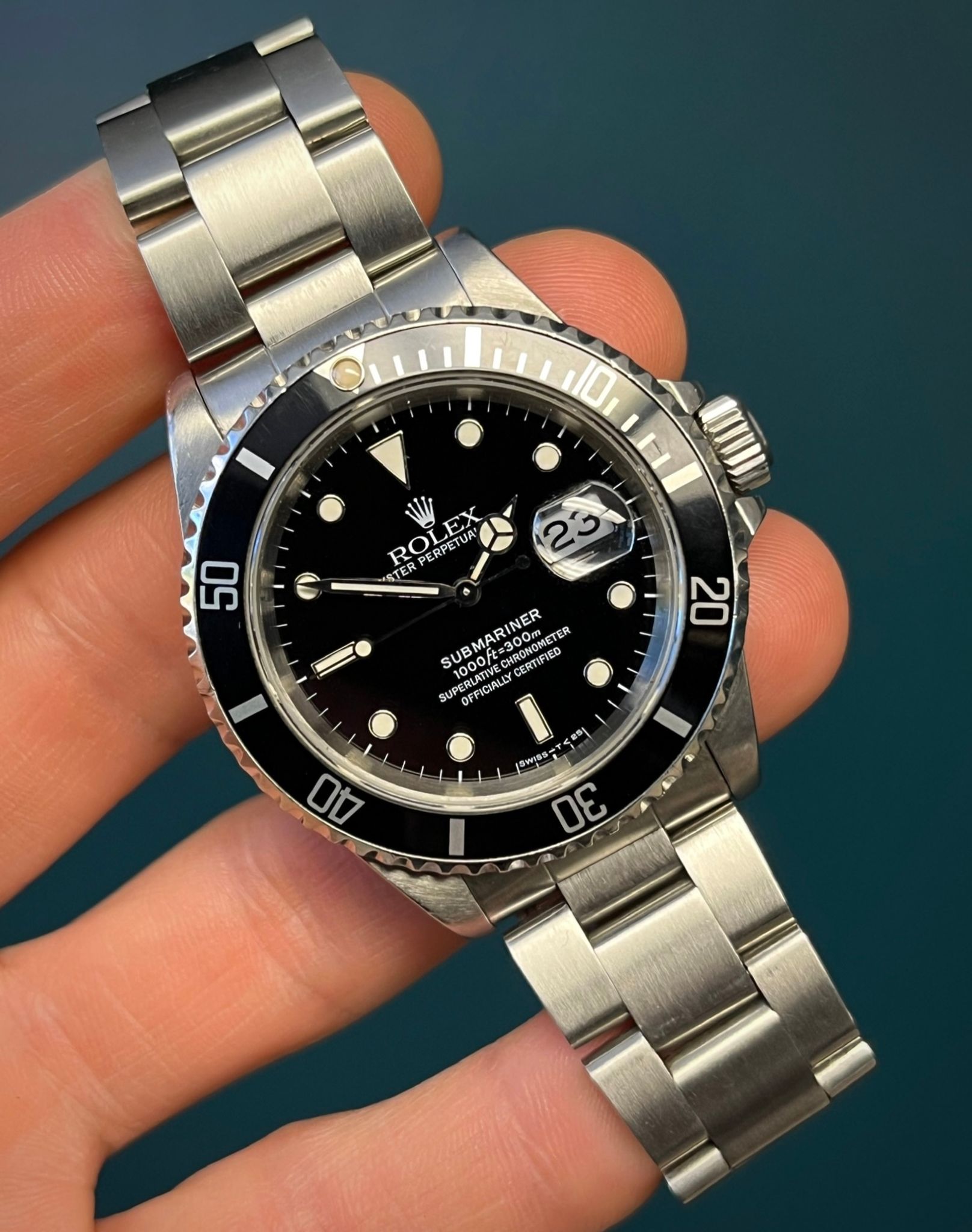 The Rolex 16610 is a highly sought-after vintage timepiece known for its distinctive design. This classic Submariner model, produced until the mid-2000s, features a stainless steel case giving it a sleek and timeless appearance. Renowned for its durability, water resistance, and iconic aesthetics, the Rolex 16610 is a beloved choice among watch enthusiasts and collectors.