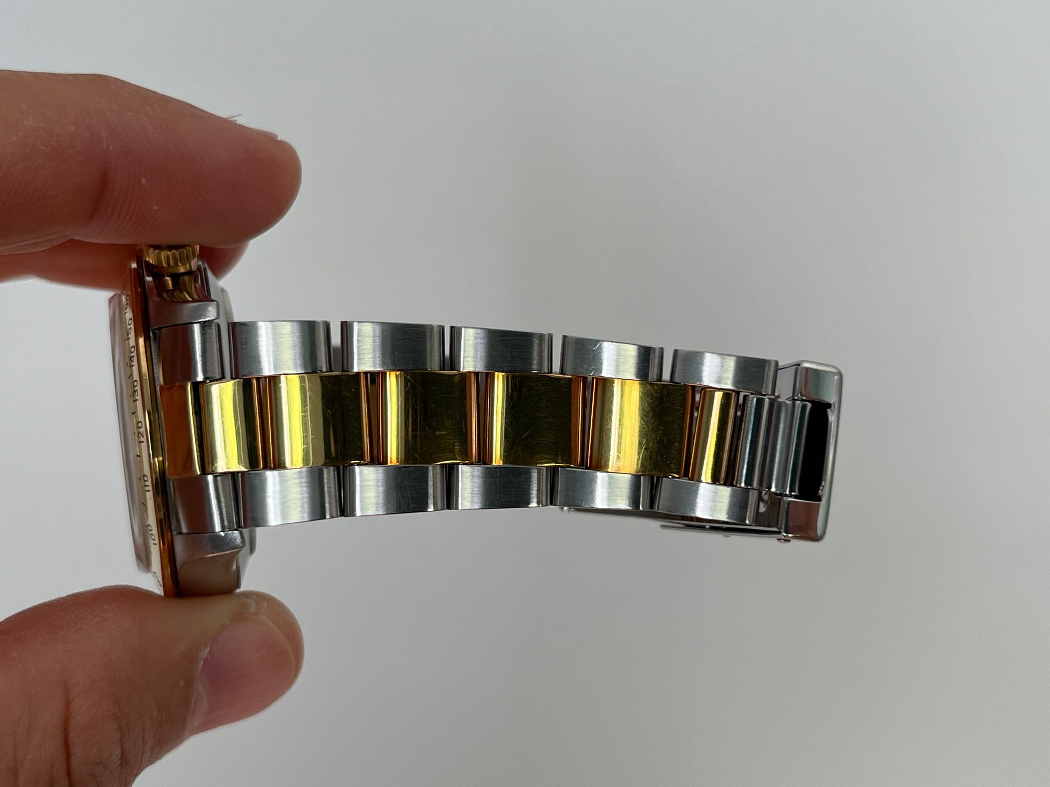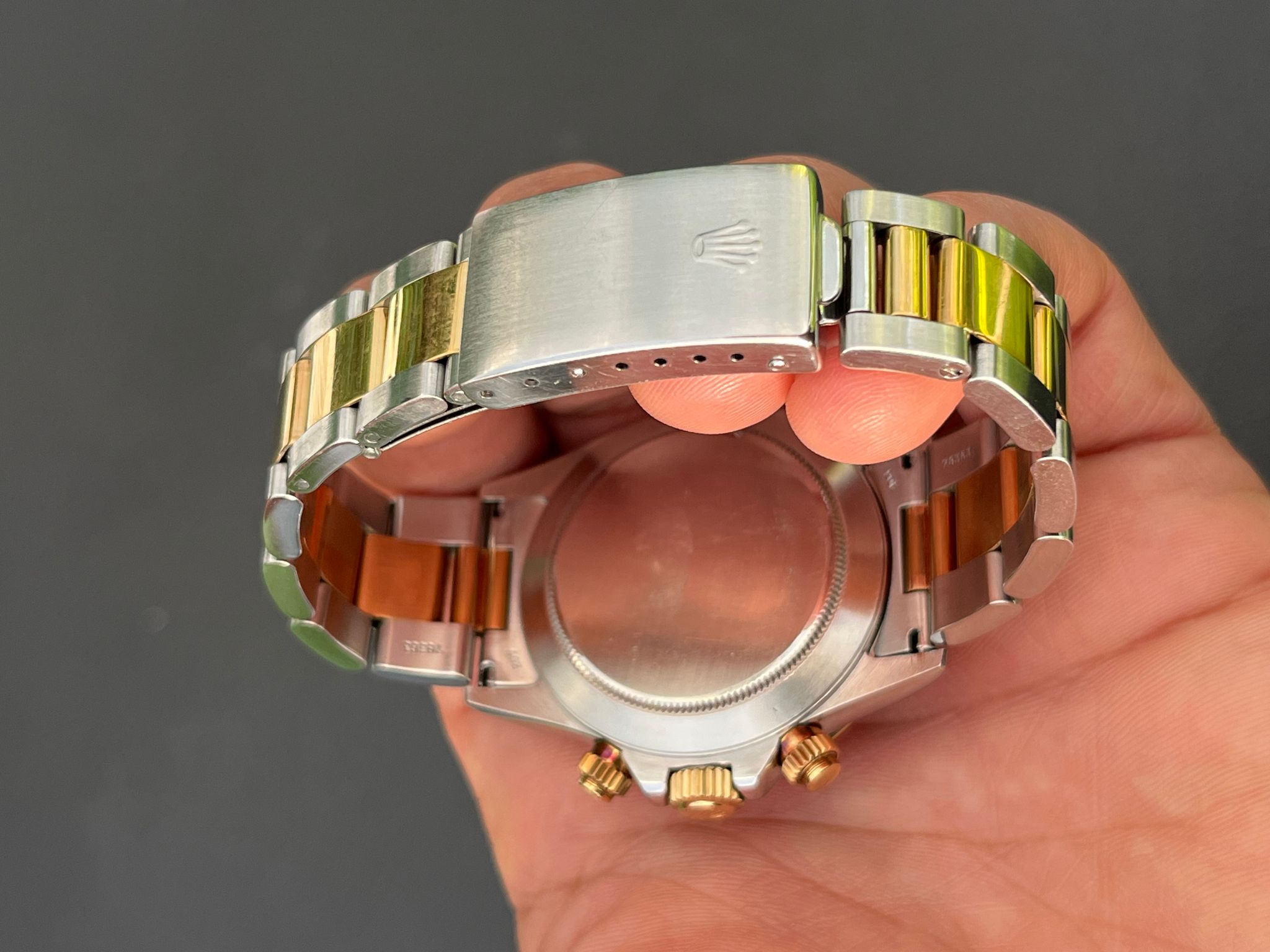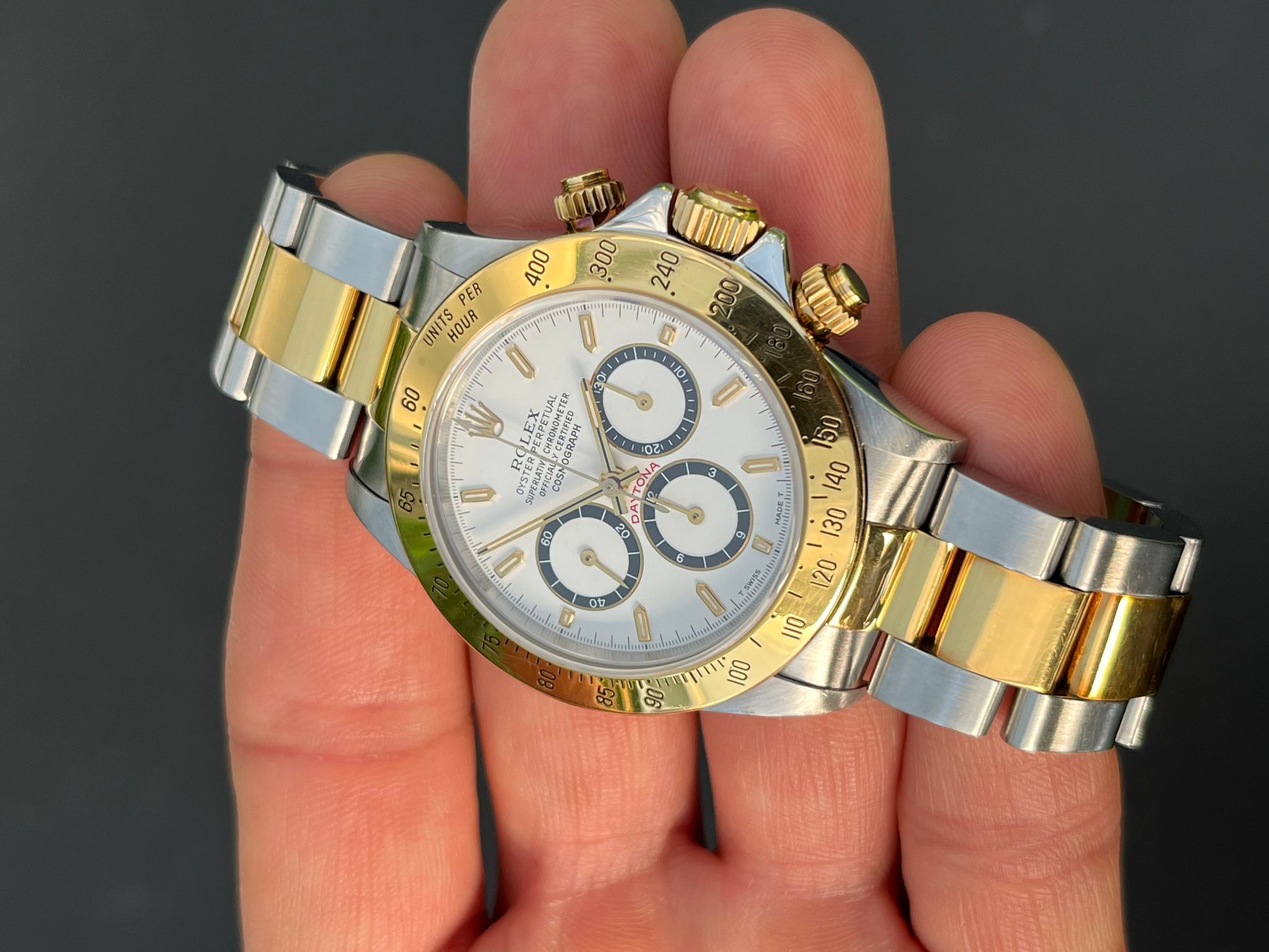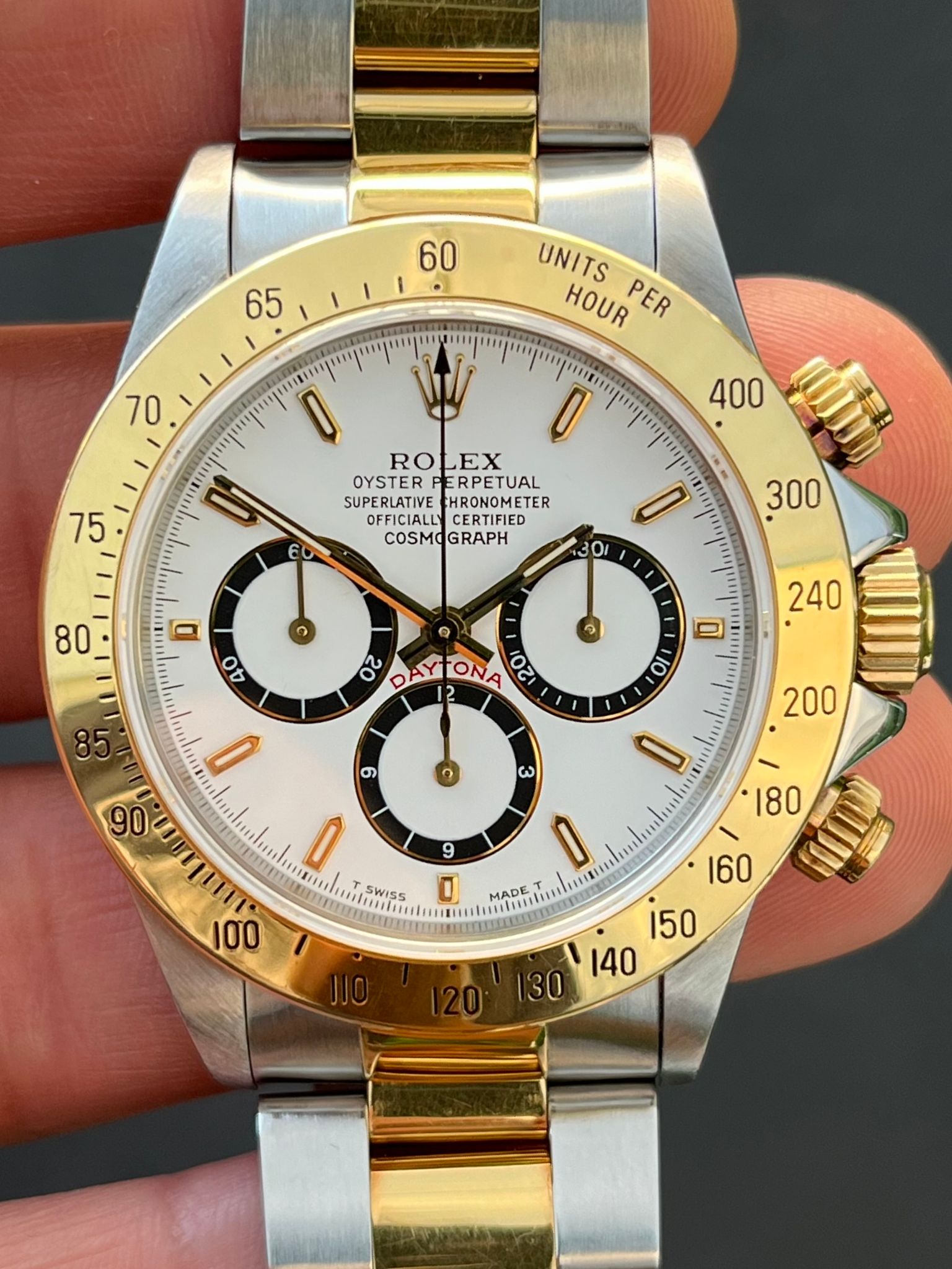 The Rolex 16523 Zenith Daytona Inverted 6 is a rare and highly sought-after timepiece, celebrated for its exquisite craftsmanship and unique design. This iconic Rolex Daytona features a stunning inverted 6 on the chronograph subdial, adding a distinctive touch to its classic aesthetics. The watch's two-tone stainless steel and yellow gold construction exudes timeless elegance, while the Zenith movement within ensures precision and reliability. Whether you're a collector or a connoisseur of fine watches, the Rolex 16523 Zenith Daytona Inverted 6 is a remarkable fusion of style and performance that stands as a symbol of luxury and precision in the world of horology.