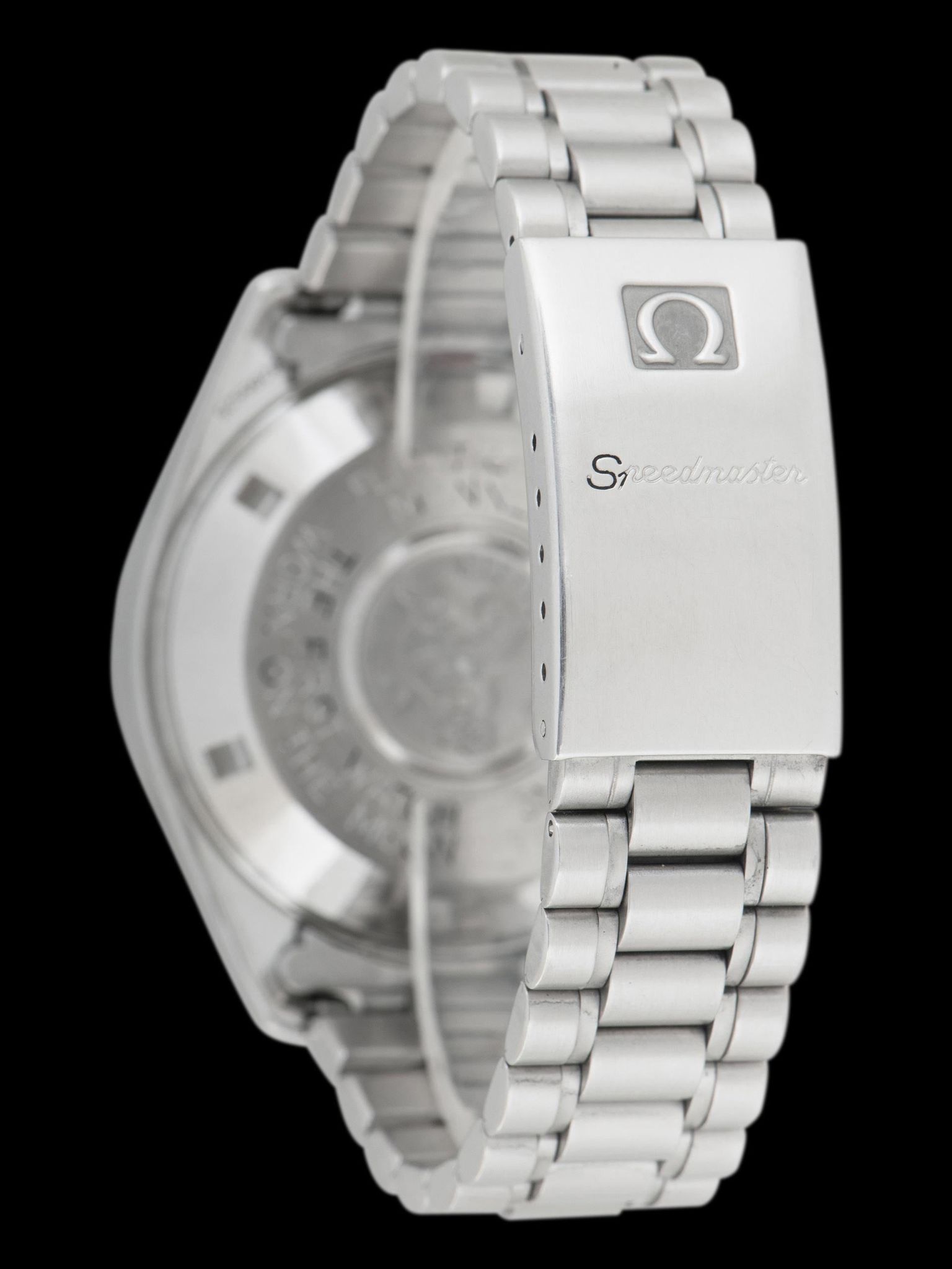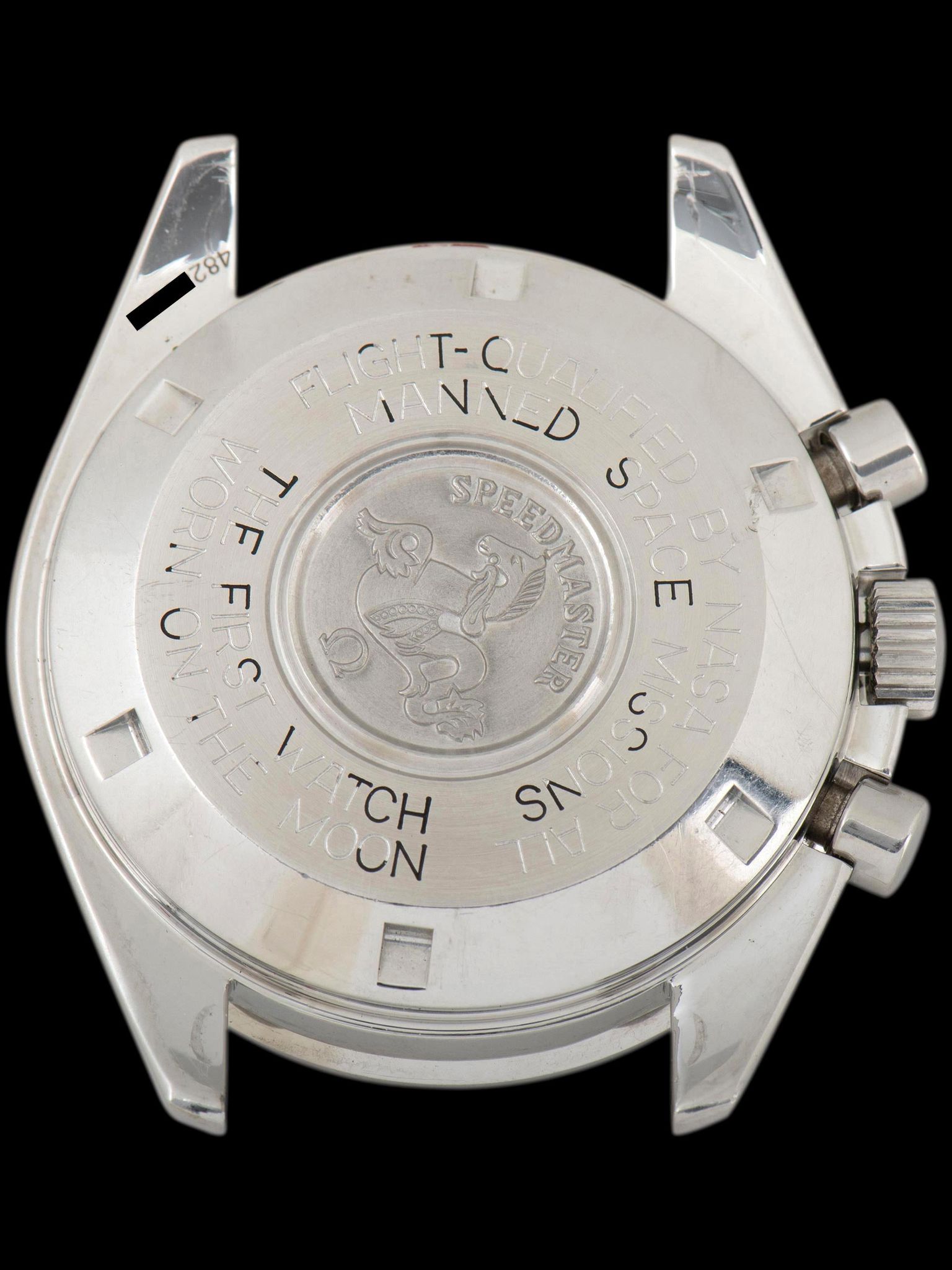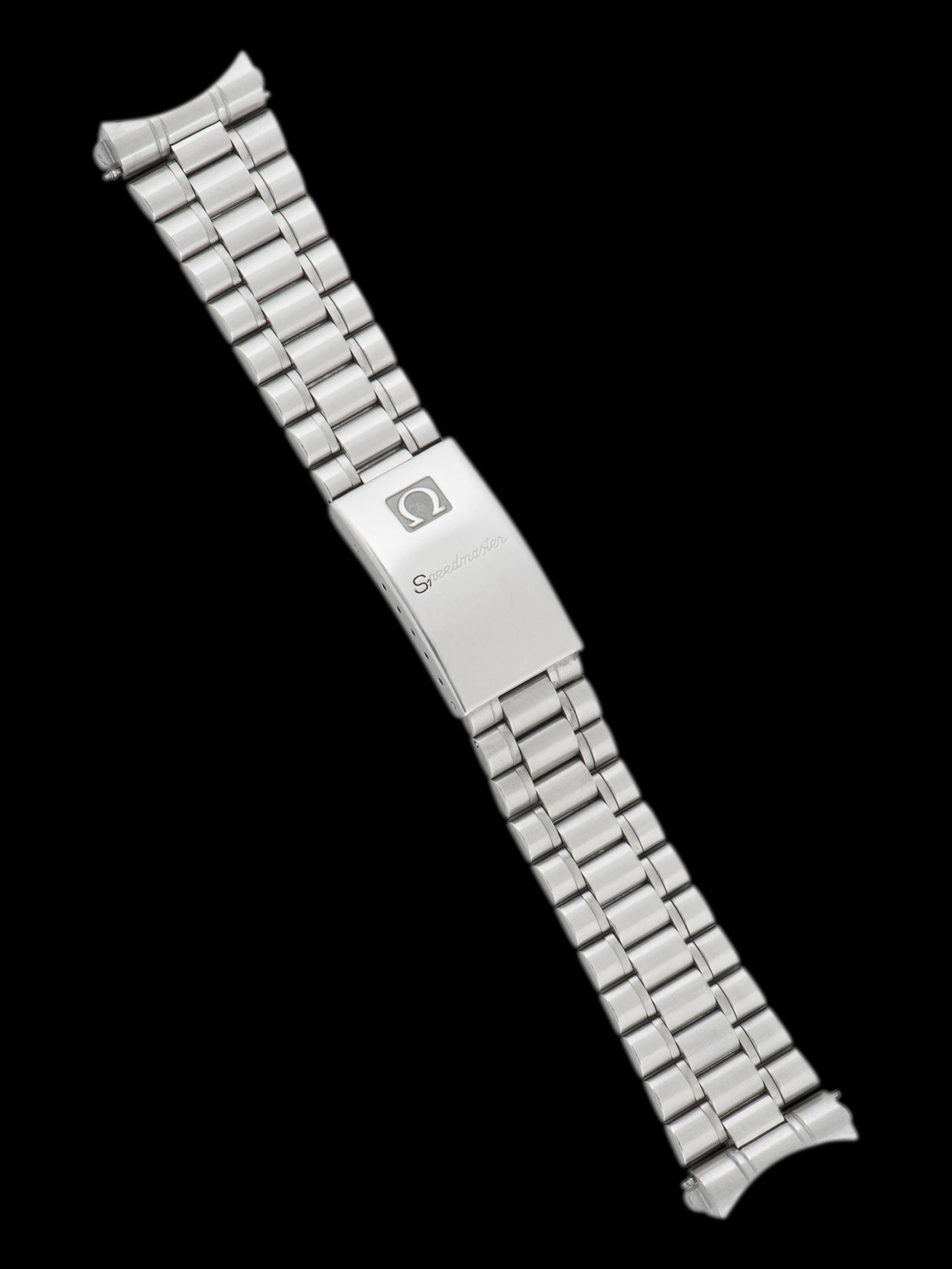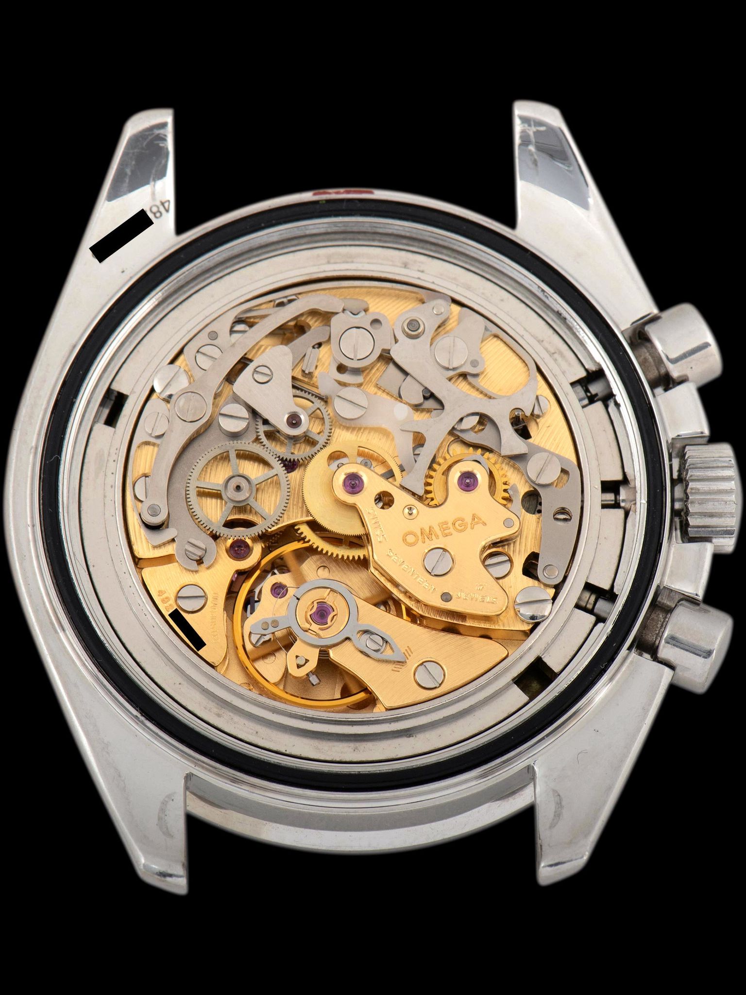 The classic asymmetrical case is in excellent overall condition, showing elements of gentle wear with no notable evidence of light polishing and crisp finishing throughout. The black aluminum tachymetre bezel remains very clean with no notable signs of use shown. The case retains its original pump pushers and Omega-signed crown. The case back is in very crisp condition with the medallion fully intact though the factory black enamel is mostly missing which is very common. The Omega 1479 bracelet with 812 end pieces retains 19 links that show minimal stretch and will fit up to a 6 3/4-inch wrist.