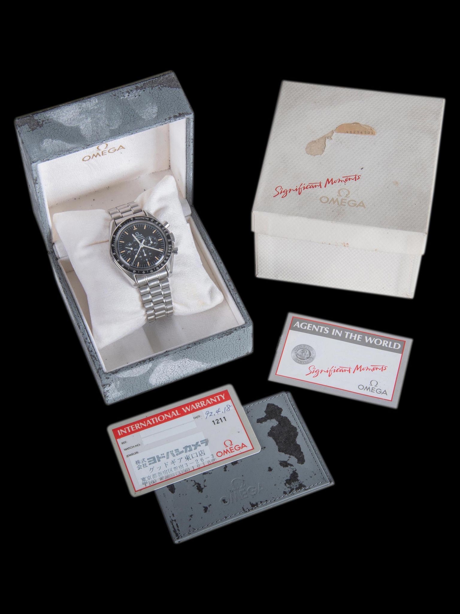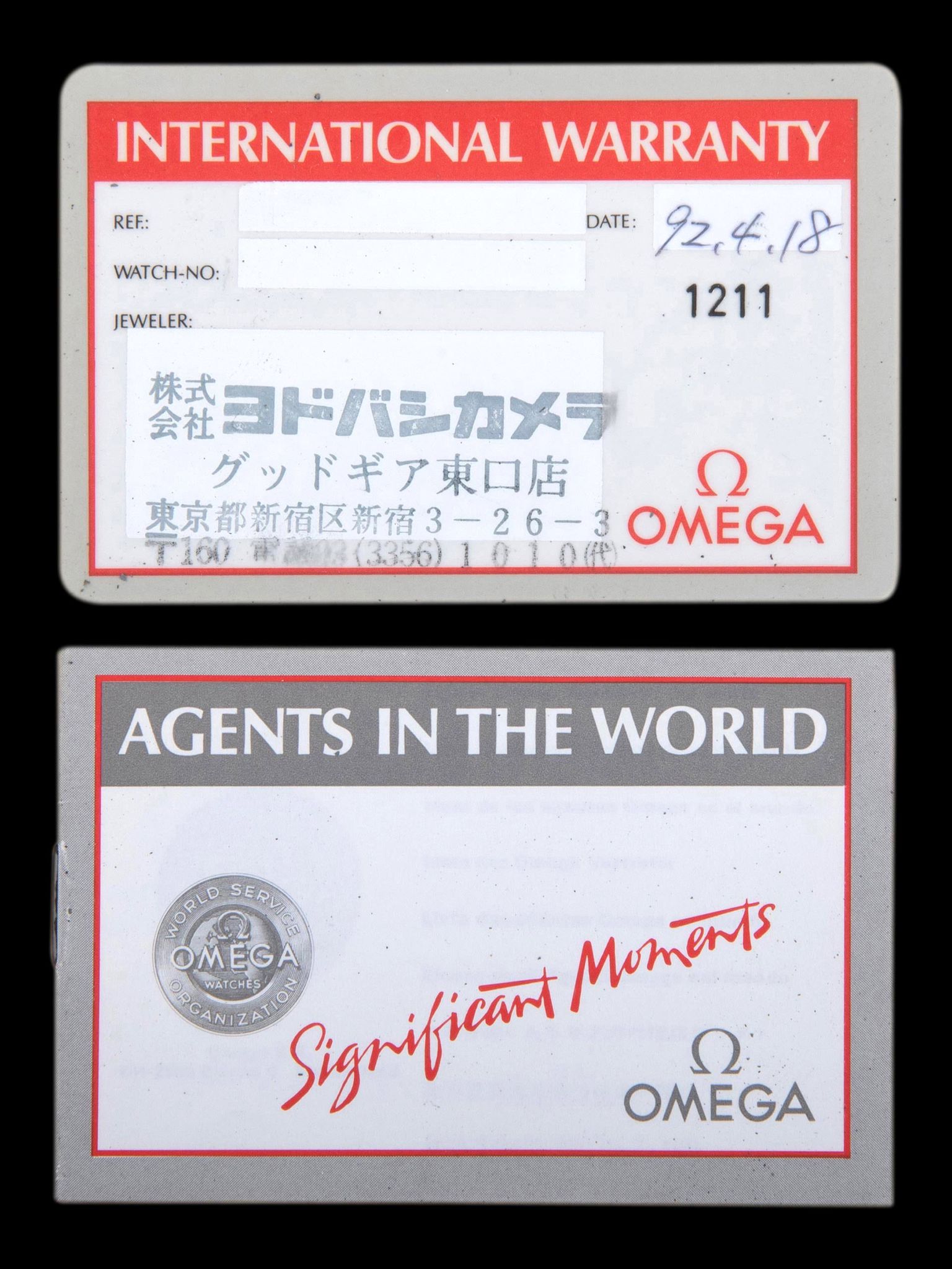 The watch comes with its original inner and outer boxes, the Omega warranty card that features the date of sale and jeweler mark but otherwise remains black, an Omega grey document holder, and an Omega dealer pamphlet. The watch was recently serviced and is running perfectly, backed by a 1-year warranty and accurate timekeeping.