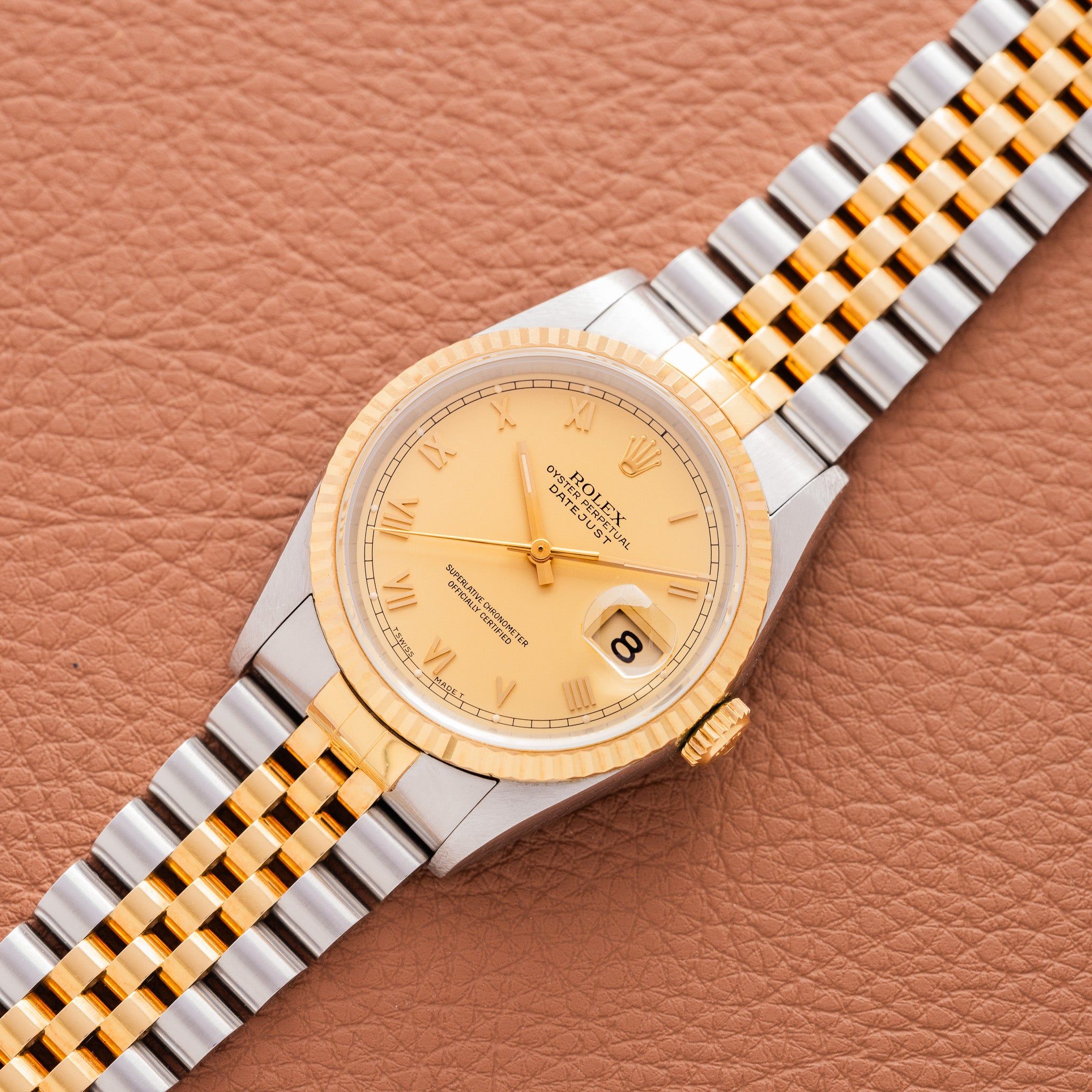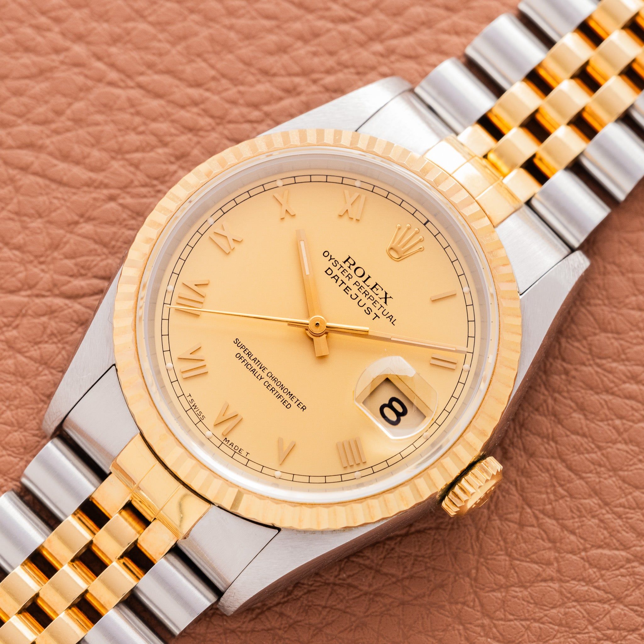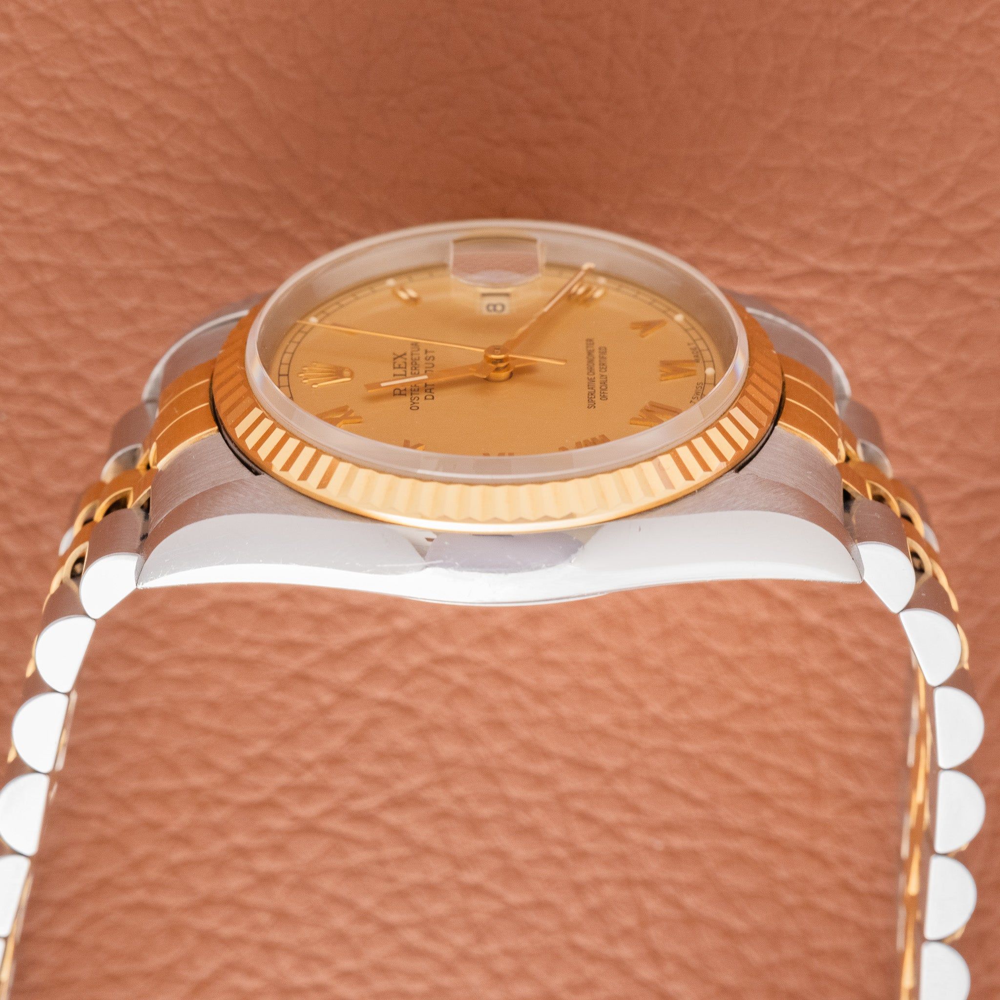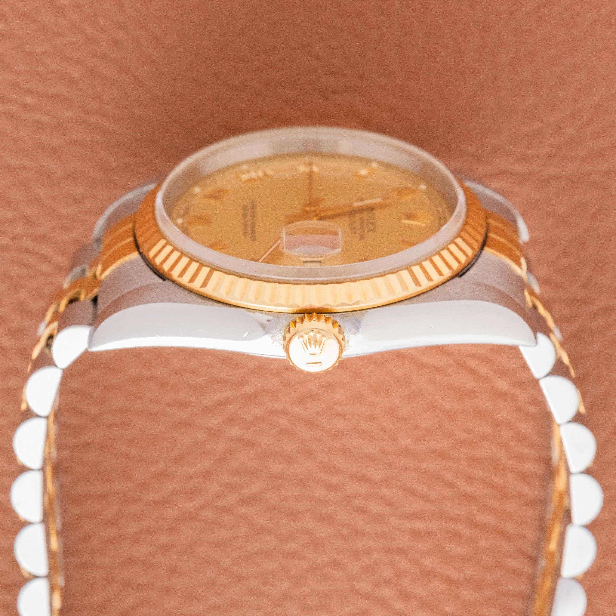 Dial: The factory dial is more unique than the classic Roman dial 162xx models. The Roman numerals are smaller and more art deco. The champagne dial itself isn't sunburst, it has a matte texture. The dial is as clean as it is rare with perfect lume plots and original hands.