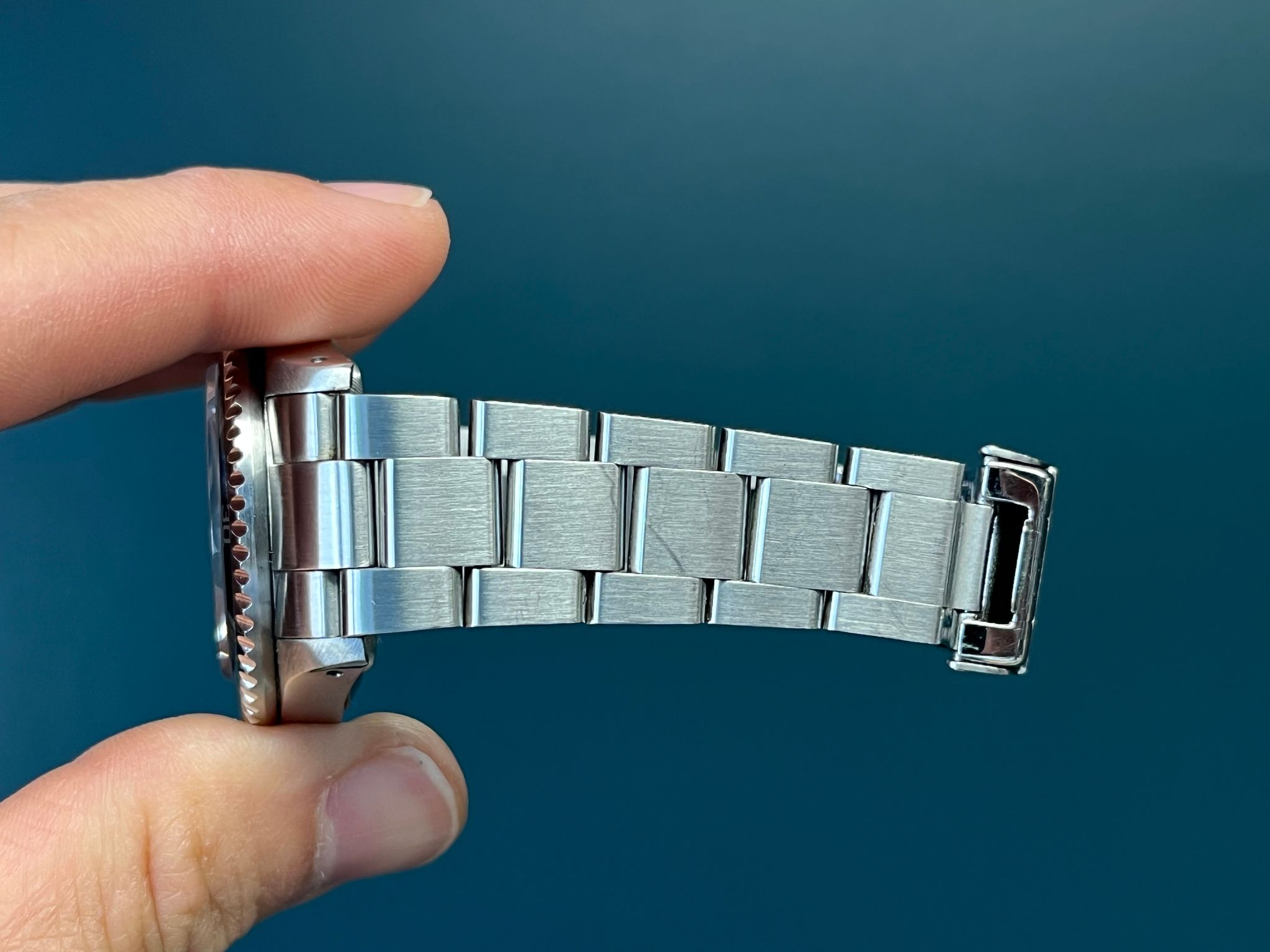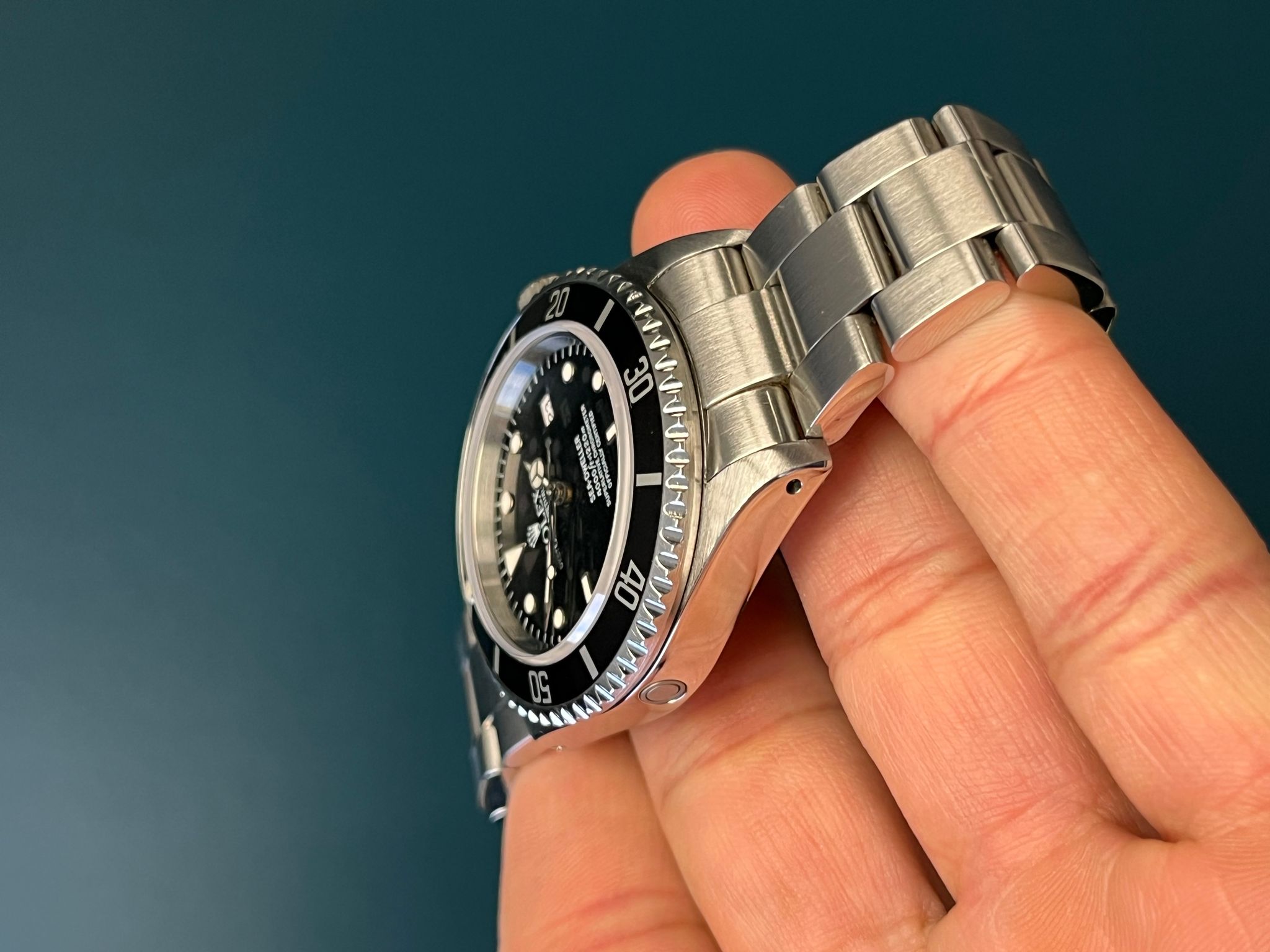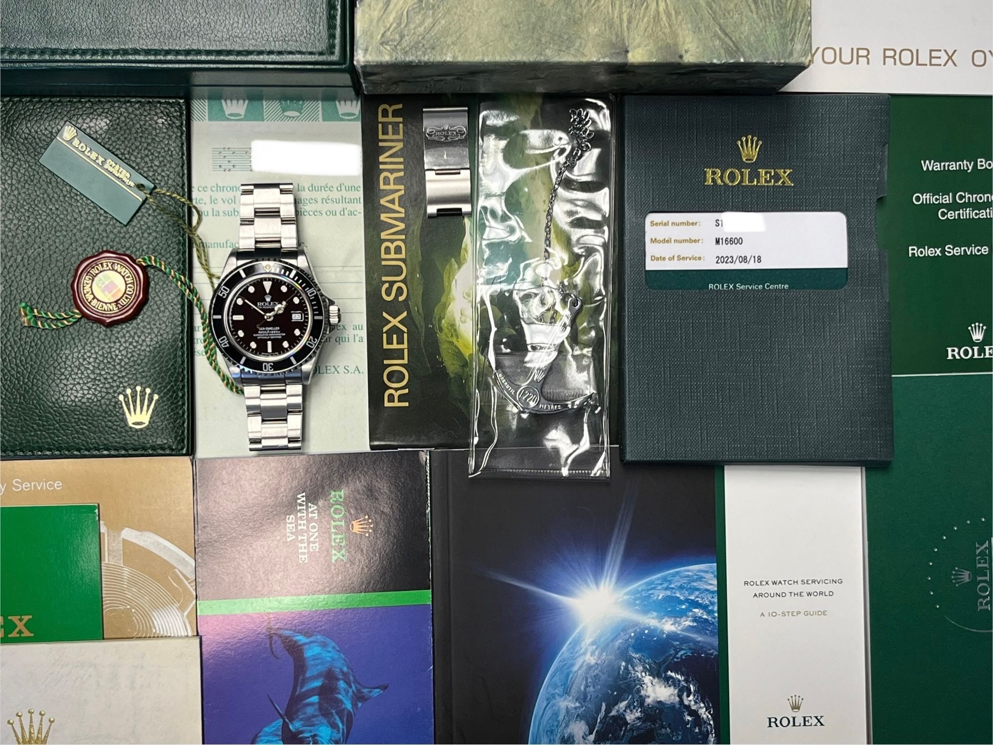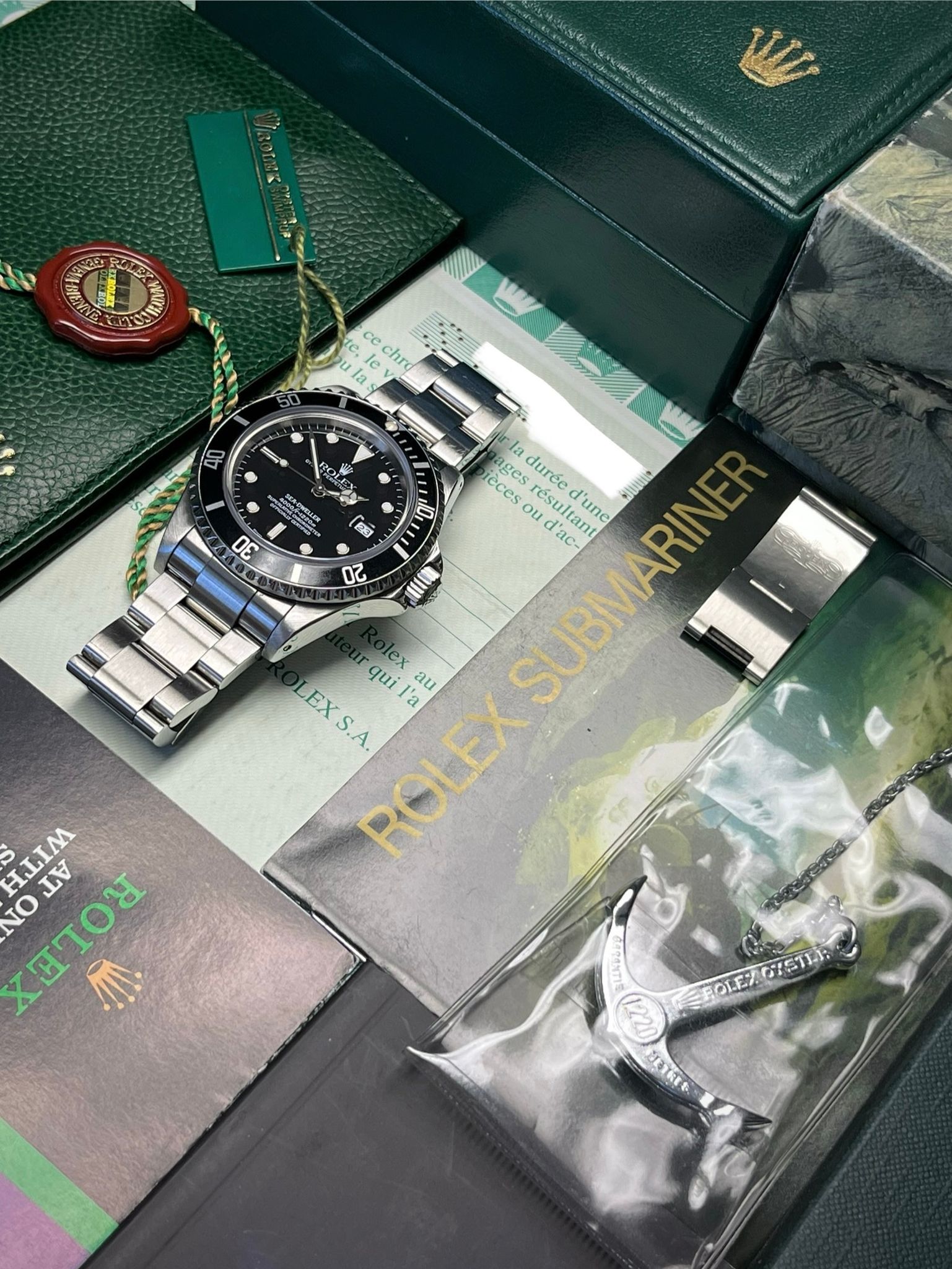 Today's example comes to us as a full set with its original punched papers, tags, boxes, dive extension, anchor and some booklets and is in excellent preowned condition. The case is excellent showing sharp lugs. The Solid End Link Bracelet is fully linked and shows no stretch. The dial and hands have a nice matching tone to them. This example underwent service at the Rolex Service Center in 2023 and comes with RSC card and documents.