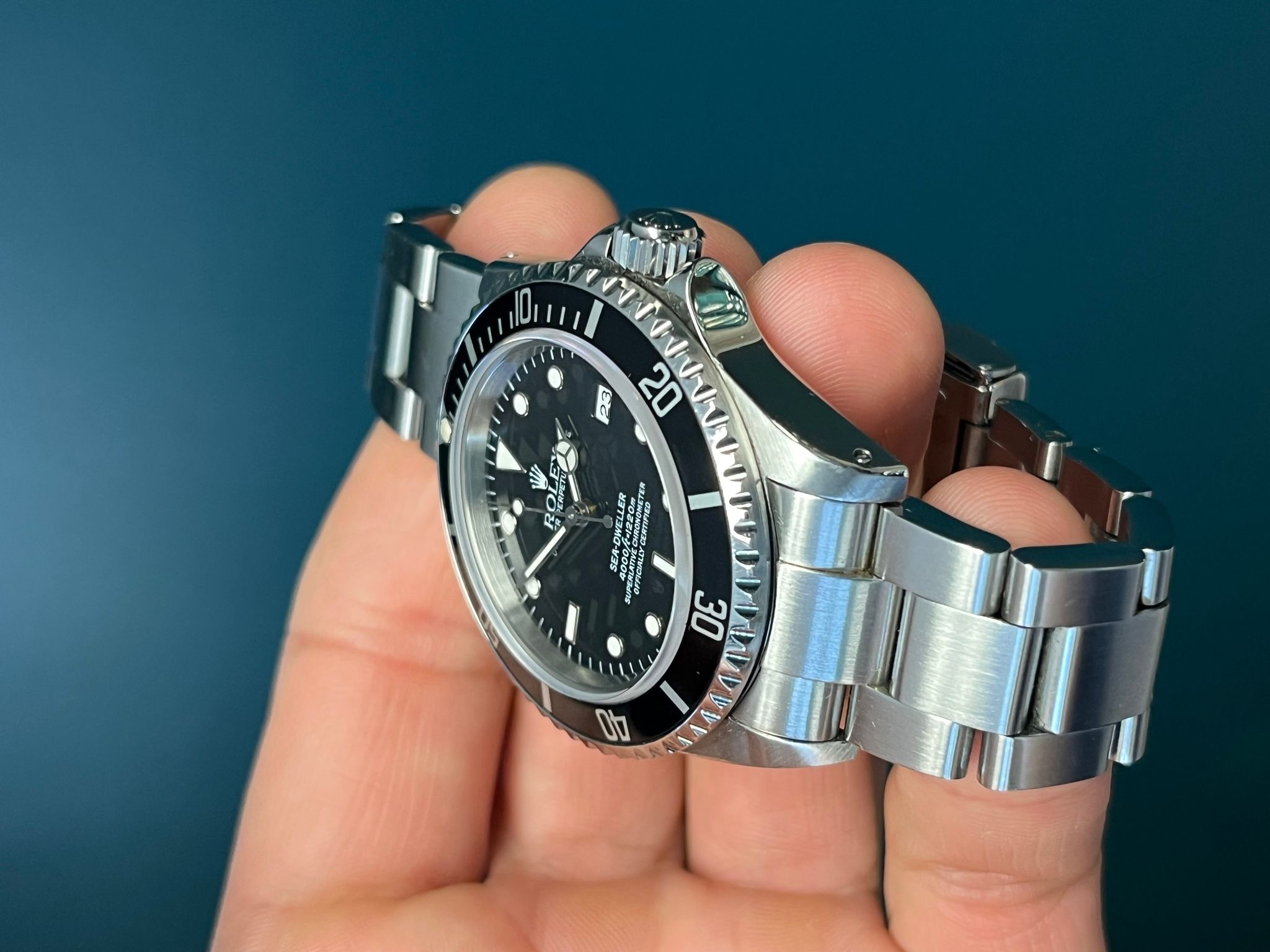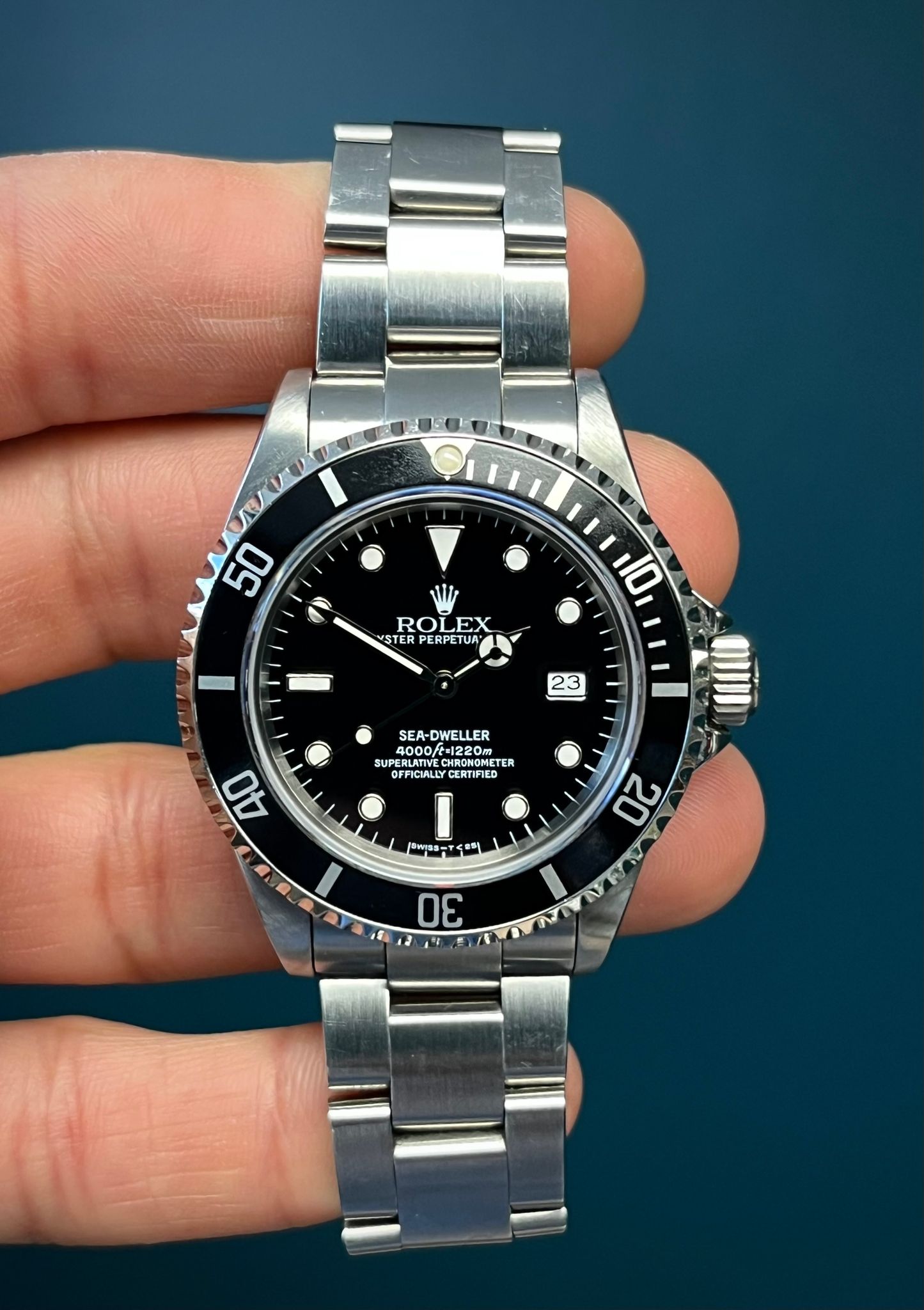 The Rolex Sea-Dweller Reference 16600 with papers from 1993 is a highly sought-after professional dive watch that combines rugged functionality with classic Rolex design. Crafted from stainless steel, the 40mm Oyster case is equipped with a helium escape valve, allowing the watch to withstand extreme depths of up to 4,000 feet (1,220 meters), making it a favorite among deep-sea divers. The black dial, featuring tritium hour markers and hands, offers exceptional legibility in low-light conditions, while the unidirectional rotating bezel allows precise timing of dive durations. Powered by the reliable Rolex Caliber 3135 automatic movement, the Sea-Dweller 16600 ensures accurate timekeeping and a robust power reserve. The watch is completed with a stainless steel Oyster bracelet, known for its durability and comfort. Accompanied by its original papers from 1993, this Sea-Dweller is not just a tool watch but a collector’s piece, representing Rolex’s enduring legacy in the world of professional diving.