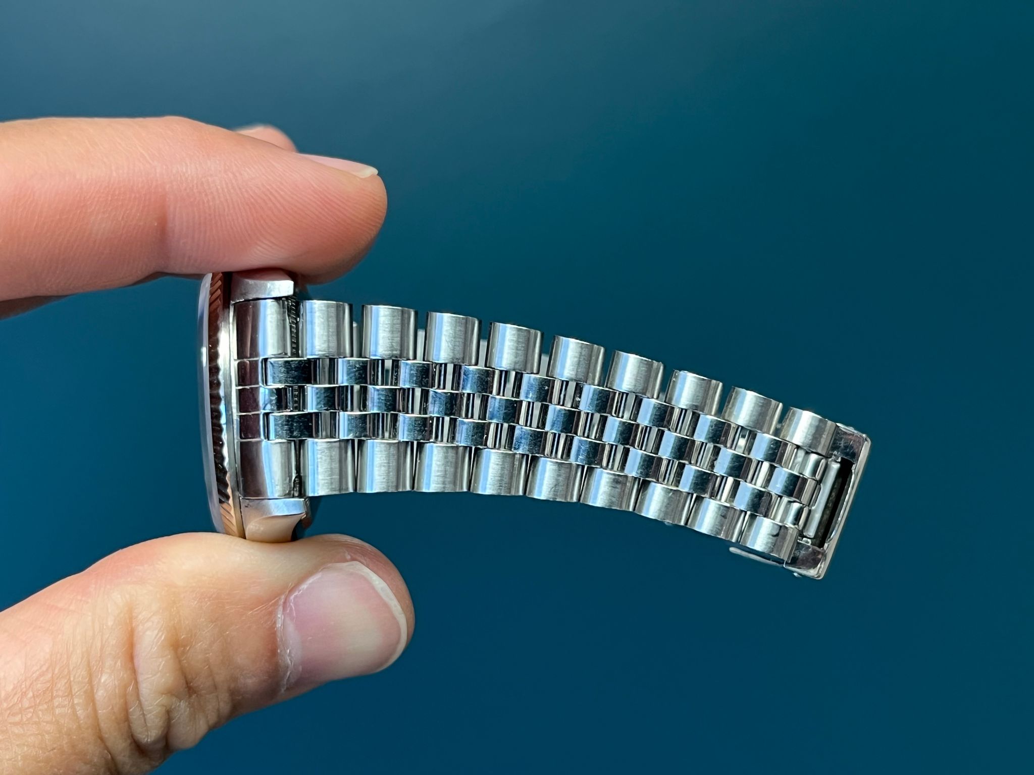 This example is in excellent condition with a sharp no holes case with thick lugs. The "Cream" toned Tropical dial is excellent showing no wear, and presents even toning throughout. The jubilee bracelet is long and shows minimal stretch. This example is running COSC and has an excellent aesthetic appearance.