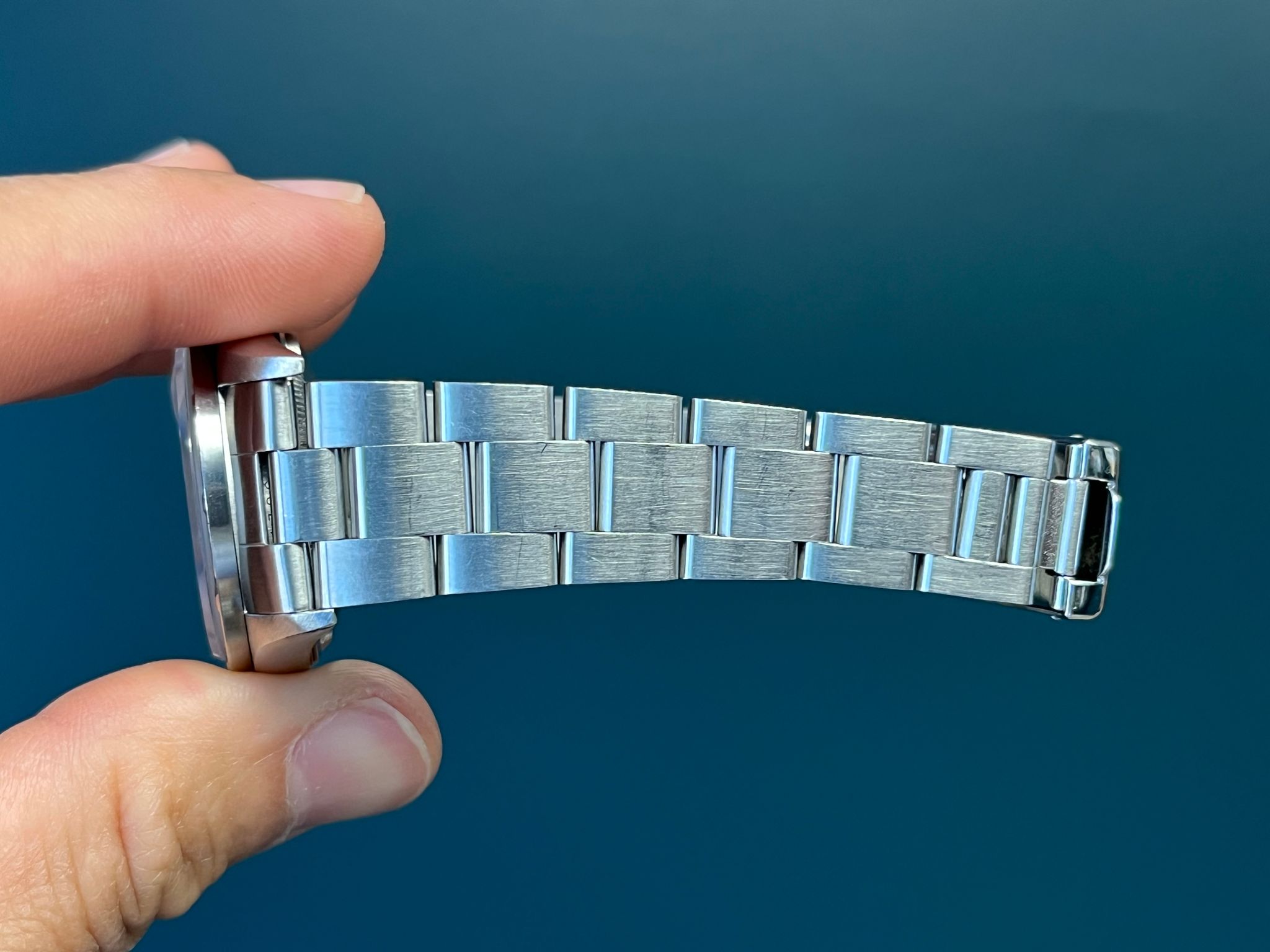 This example comes to us in excellent vintage condition. The unpolished No Holes case and engine turn bezel are sharp. The bracelet has 12 links and shows no stretch. The dial is mint and has a tropical pink tone to it. This is an excellent example with a great look ready to go!