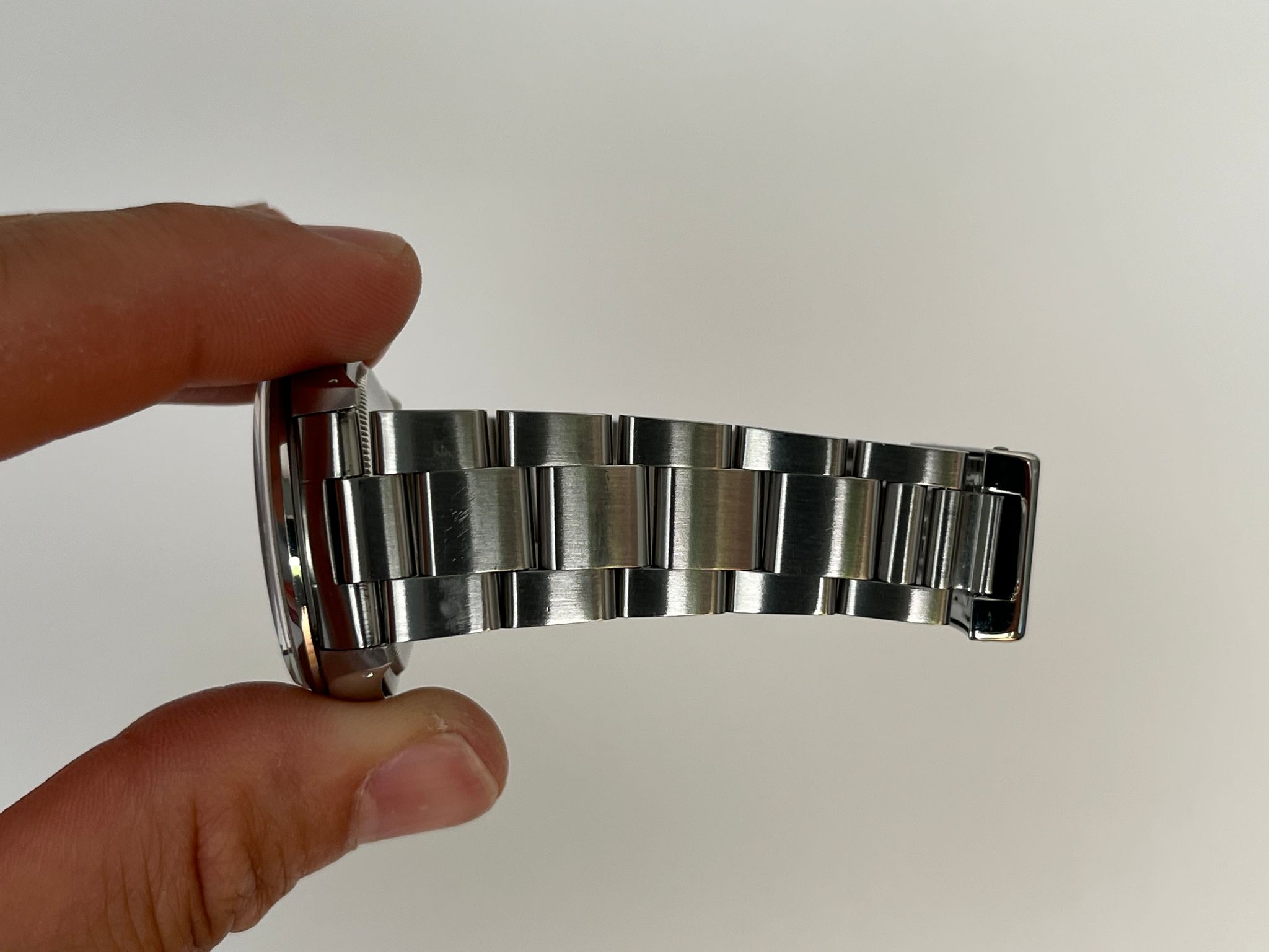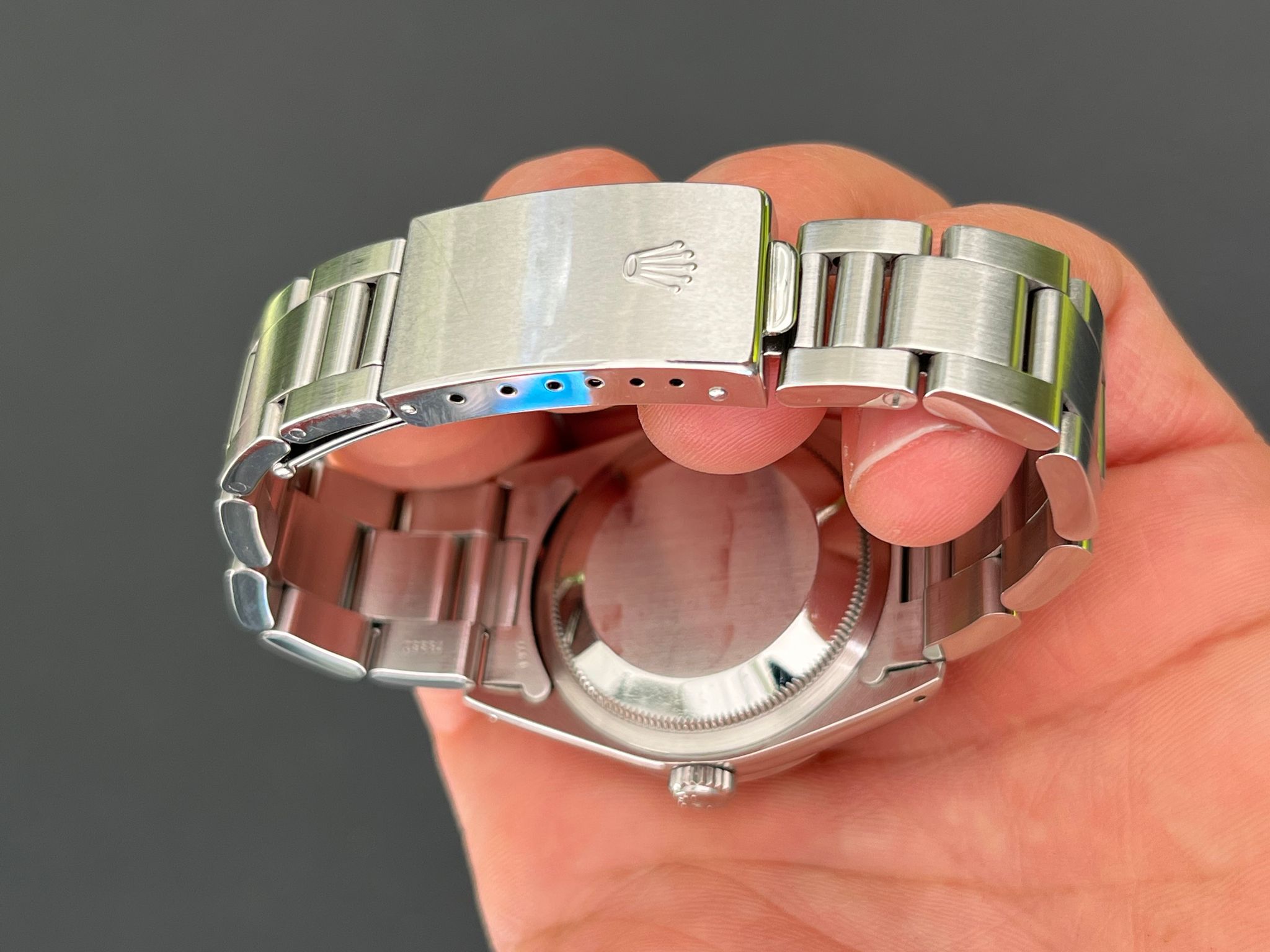 Today's example comes to us watch only and in nice pre-owned condition. The case is excellent with sharp thick lugs. The dial is mint and shows no wear. The solid link oyster bracelet has 12 total links and shows no stretch. Excellent clean pre-owned example.